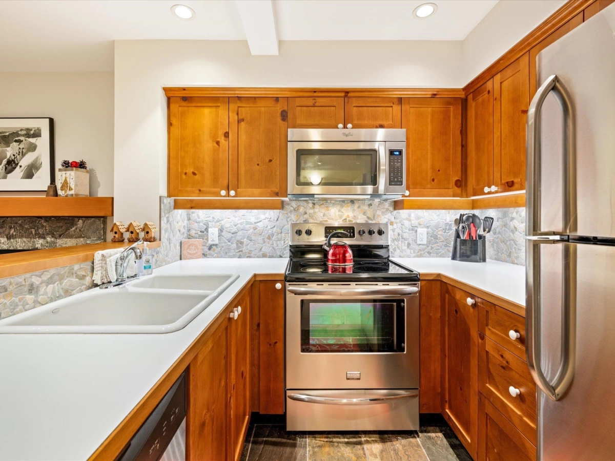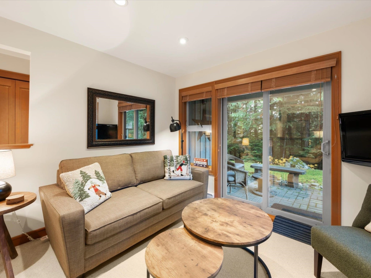 Beautifully updated and spacious 1-bedroom Treeline townhome, quietly situated on a private cul-de-sac in the Blackcomb Benchlands. Features heated slate floors, warm wood accents, wood-burning fireplace, and a large private patio with perfect for a BBQs overlooking a grassy yard. The kitchen includes solid pine cabinets, heated floors, and quality appliances. Treeline offers a ski-home trail, hot tub, secure underground parking with bike storage, and a private ski locker at the front door. Free public bus nearby. GST exempt.