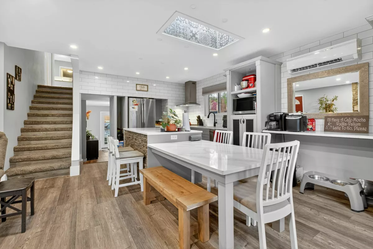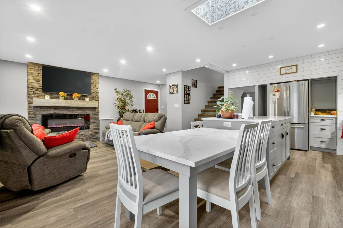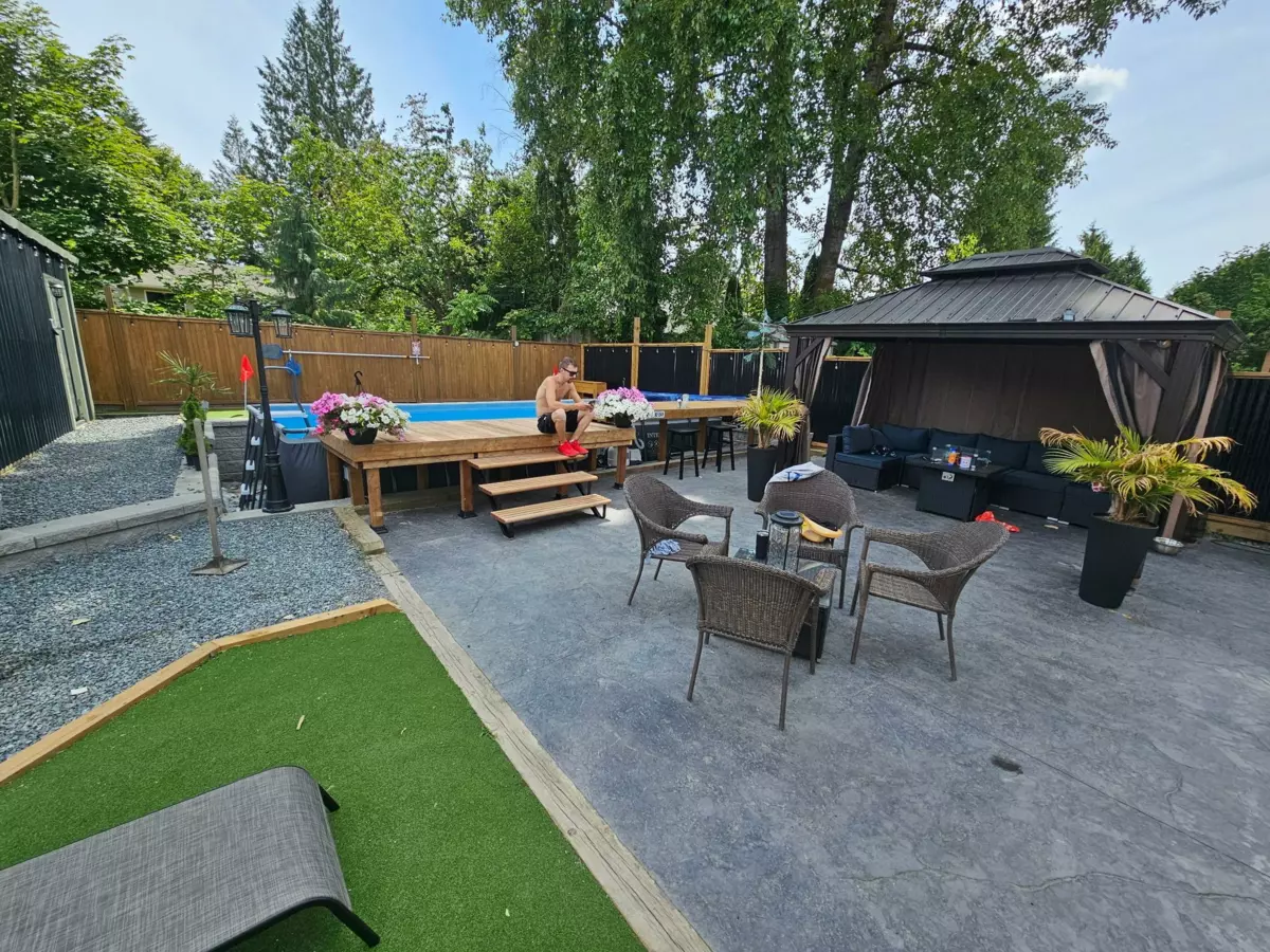 Nice split level home in Aldergrove Parkside neighbourhood, 4 beds, 1.5 baths with plenty of updating! Enjoy entertaining on the main level with updated kitchen including skylight, quartz countertops and quality backsplash, centre island with attached eating area, coffee bar, new cabinets, newer appliances, cast double sink, updated lighting, air con, and electric fireplace with cultured stone feature wall. Upstairs offers 3 bedrooms and has a beautifully remodelled bath with rain shower, free standing tub, marble counters and quality tile work. The lower level has a good sized family room and French doors leading out to the fully fenced, professionally landscaped backyard plus 4th bedroom. Above ground outdoor pool. Aprox 14 x 24 Large Workshop. Newer windows and roof, lots of parking.