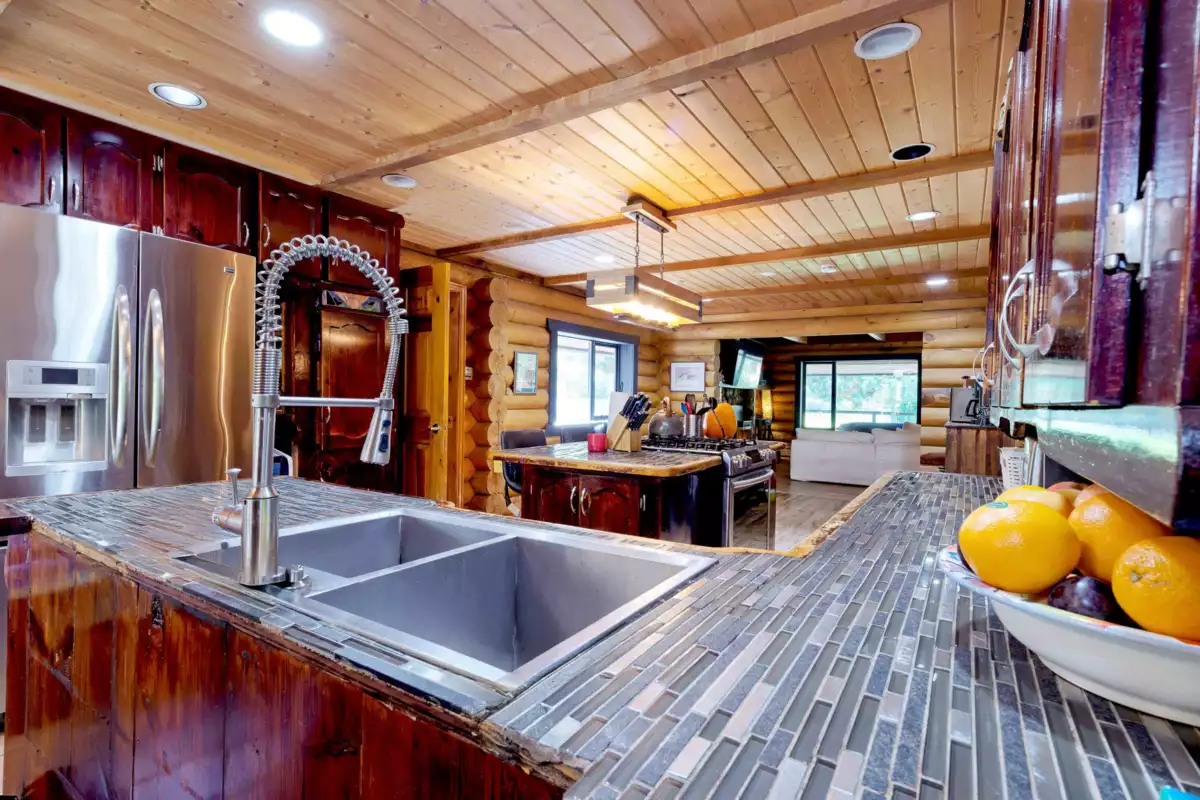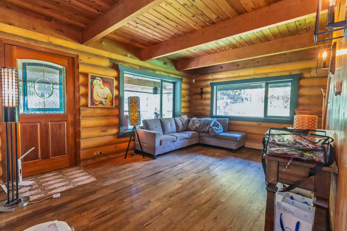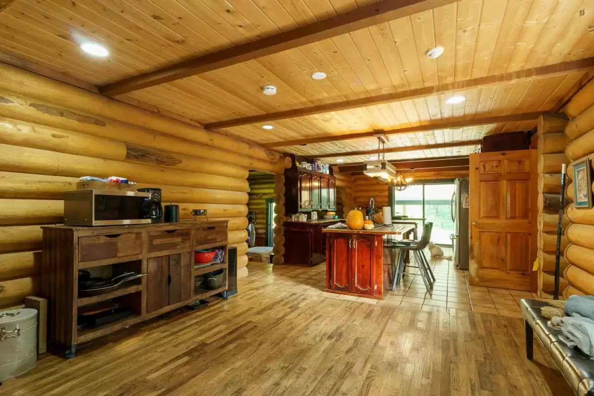 Welcome to your own private country estate! This stunning 5-bedroom, 3-bath log home sits on 5.11 acres of flat, fully usable land, blending rustic charm with modern comfort. Perfect for multi-generational living or future income potential, the property features two gated driveways—one leading to the main residence & the other to the barn. Spacious layout includes a warm country kitchen at its center, a cozy living room with a river rock wood-burning fireplace, adjoining dining & nook spaces. Main floor bedroom & family room offer flexible living, opening to an incredible indoor-outdoor area with a lap pool and expansive entertaining space. Extras include a large bsmt with plumbing, a wine/cold cellar, a separate guest house, serene ponds, and lighted tennis courts—truly a legacy property!