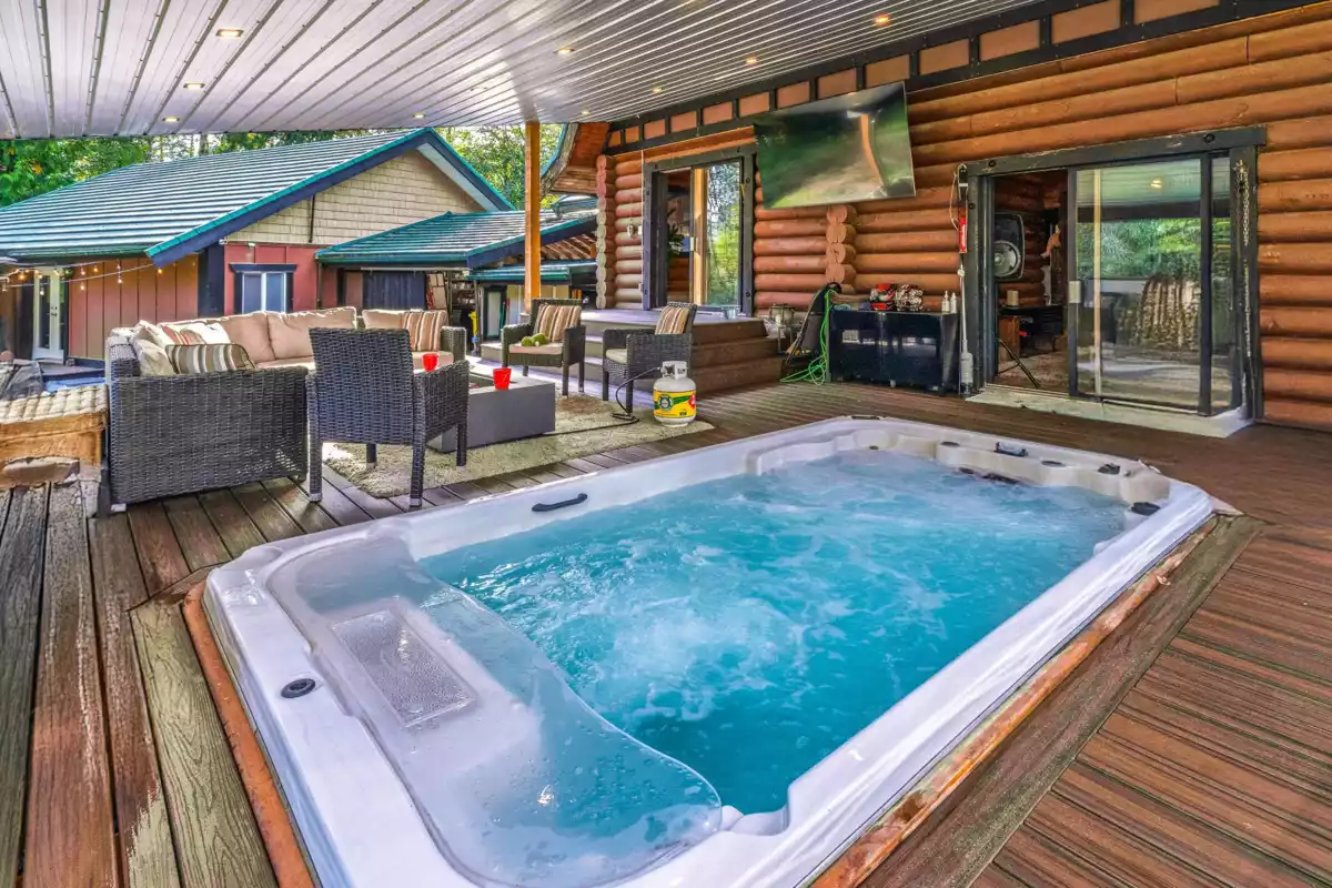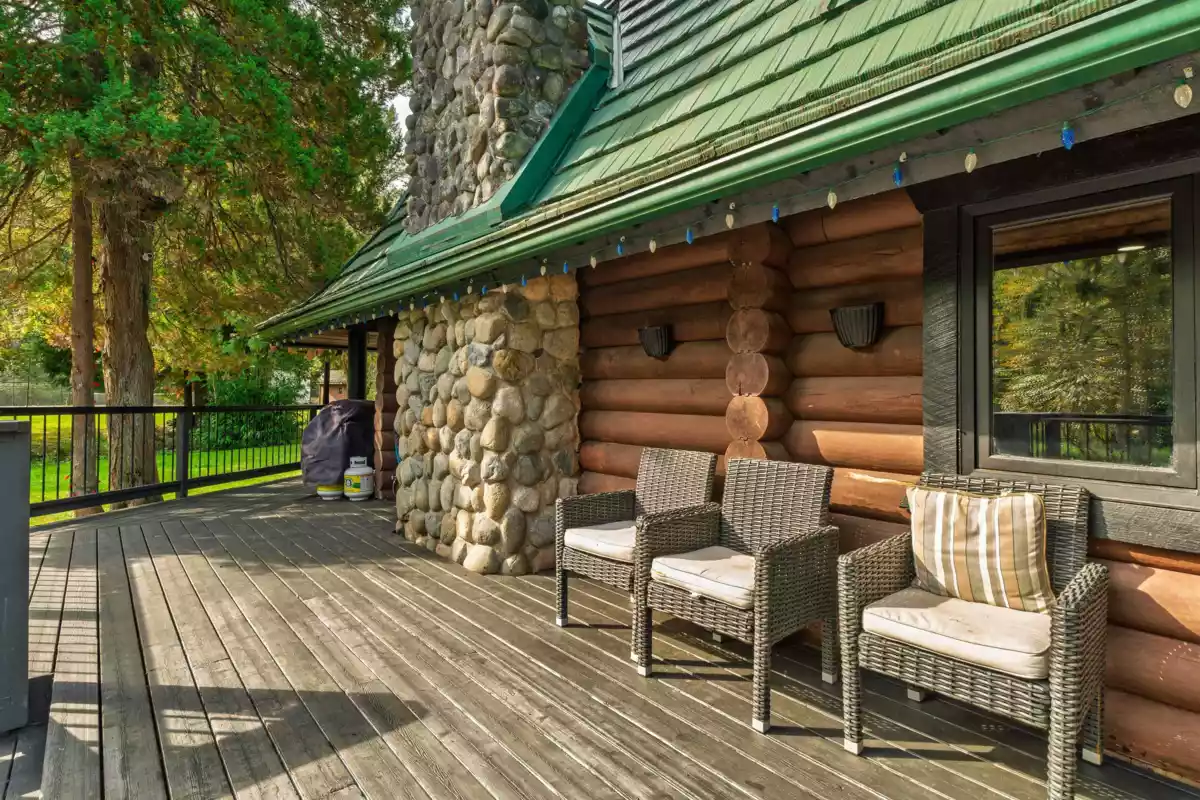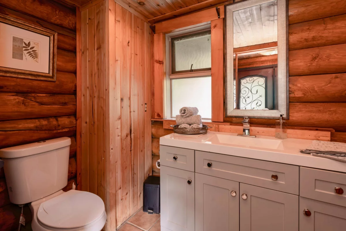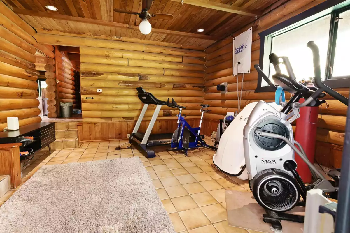 Welcome to your own private country estate! This stunning 5-bedroom, 3-bath log home sits on 5.11 acres of flat, fully usable land, blending rustic charm with modern comfort. Perfect for multi-generational living or future income potential, the property features two gated driveways—one leading to the main residence & the other to the barn. Spacious layout includes a warm country kitchen at its center, a cozy living room with a river rock wood-burning fireplace, adjoining dining & nook spaces. Main floor bedroom & family room offer flexible living, opening to an incredible indoor-outdoor area with a lap pool and expansive entertaining space. Extras include a large bsmt with plumbing, a wine/cold cellar, a separate guest house, serene ponds, and lighted tennis courts—truly a legacy property!