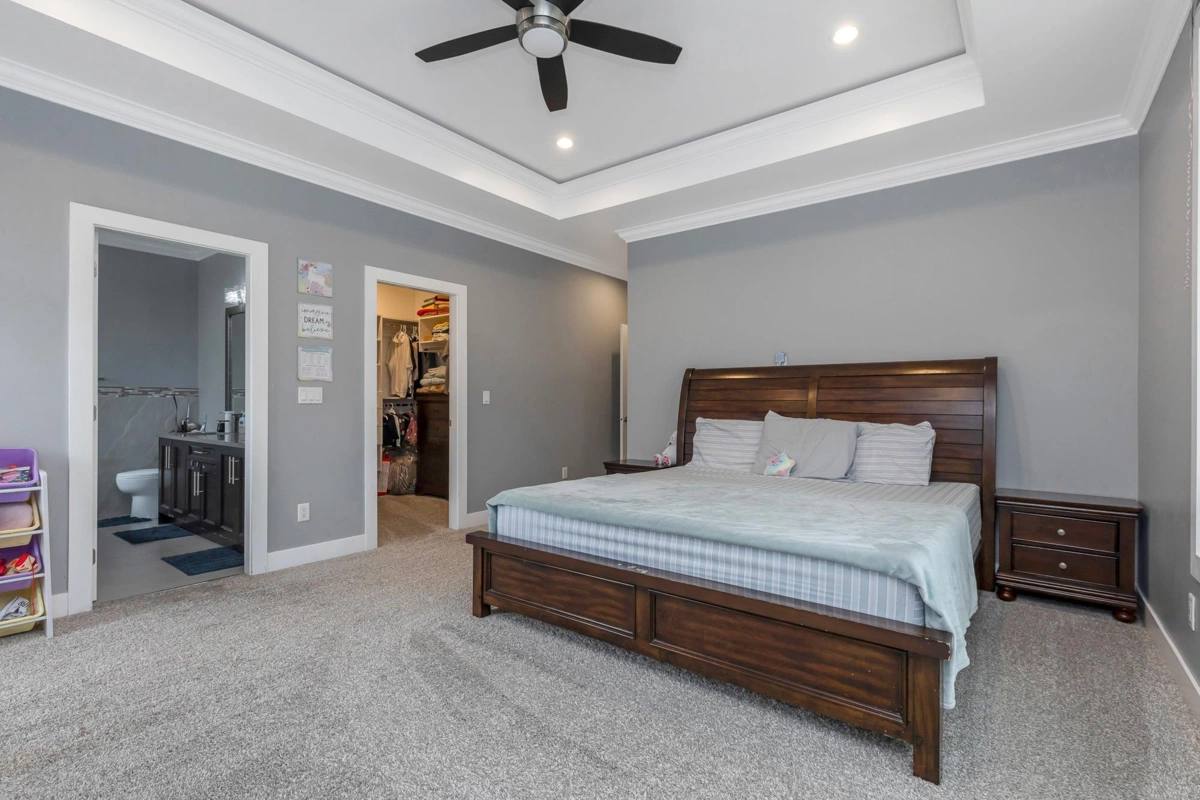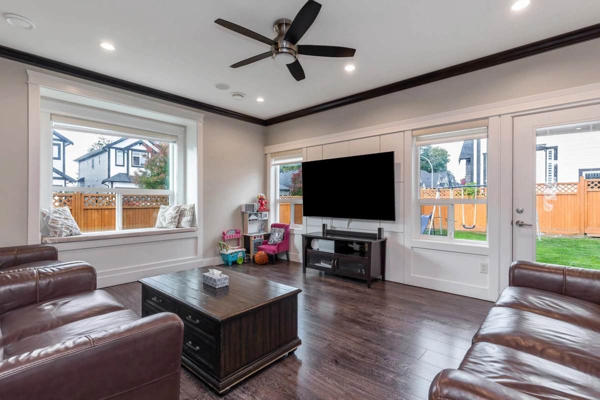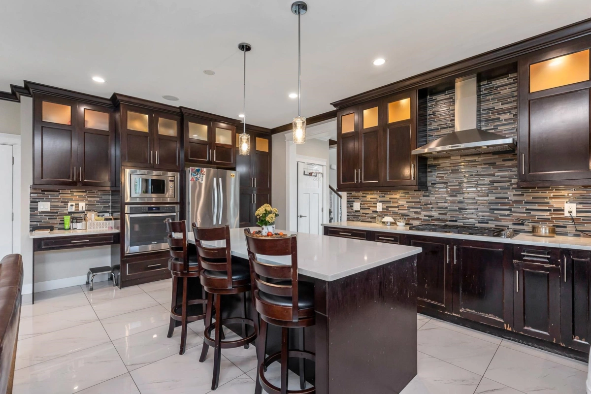 This custom two-story corner lot home features six bedrooms and five bathrooms. The main floor includes a living room with a vaulted ceiling and gas fireplace, a dining room, a family room, and a chef's kitchen. Upstairs are four spacious bedrooms and three bathrooms. The property also includes a separate two-bedroom basement suite with in-suite laundry. Exterior highlights are an oversized garage and a private, fenced yard.