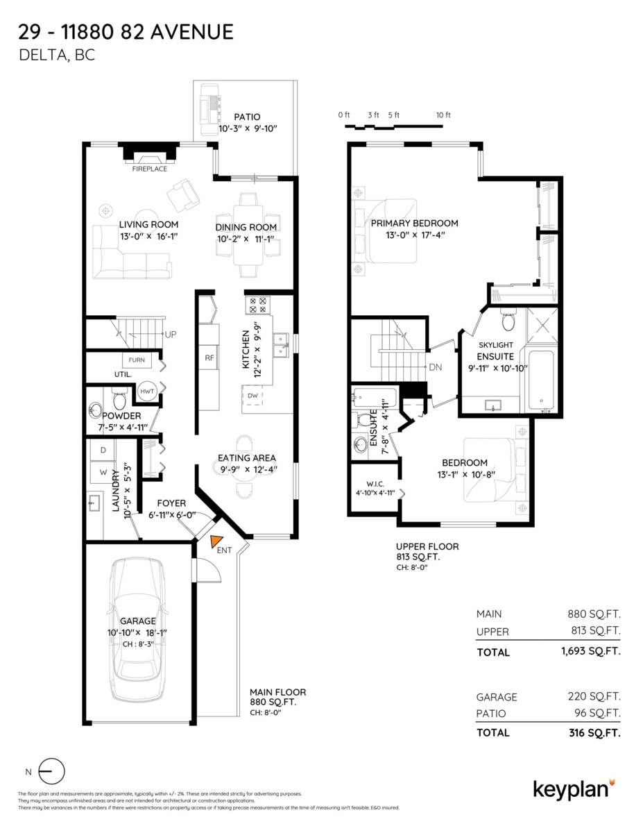 Rarely Available in Briarwood Estates, a sought-after townhouse community in the heart of North Delta.This 2 Storey End Unit has a bright contemporary kitchen features tile flooring, ample cabinets, S/S appliances and eating area.The main floor boasts a powder room, large laundry room, built-in vac, a spacious dining & living room w/gas fireplace, extending to your patio surrounded by mature landscaping. Upstairs, you'll find two spacious primary bedrooms, new pot lighting, each boasting its own 4-piece ensuite bathroom. The larger ensuite in the main primary is customized w/loads of closet space, room for TWO BEDS, skylight, a walk-in tile shower and a relaxing soaker tub. Located within walking distance to grocery stores, shops & public transportation.