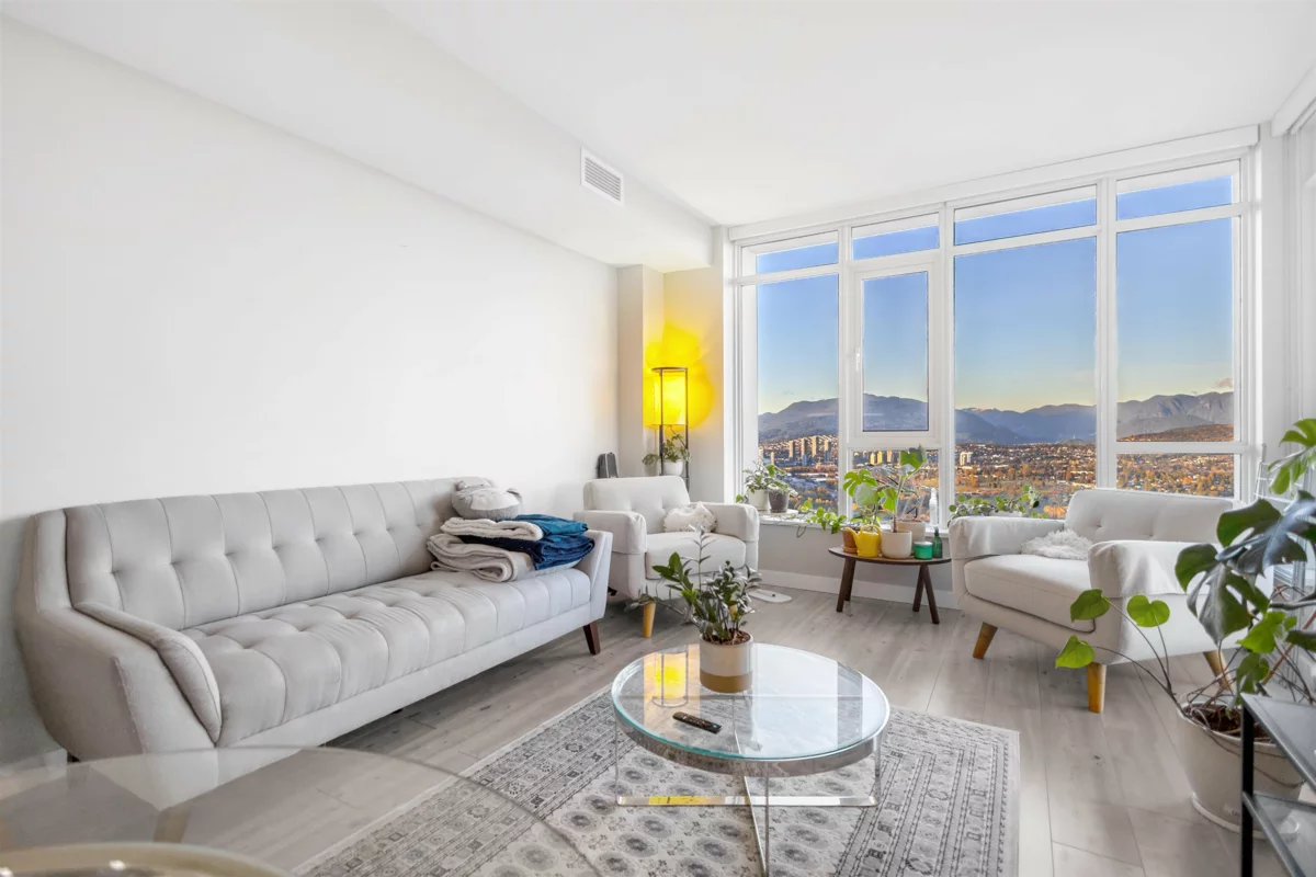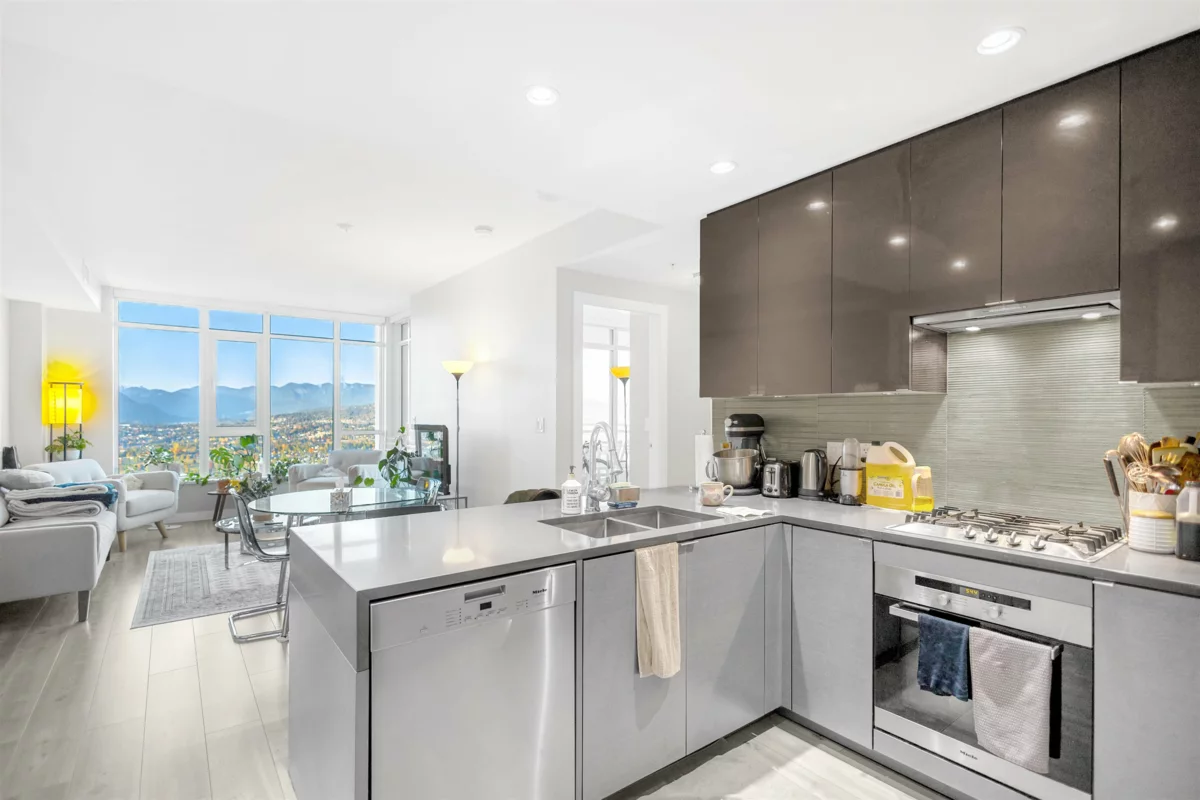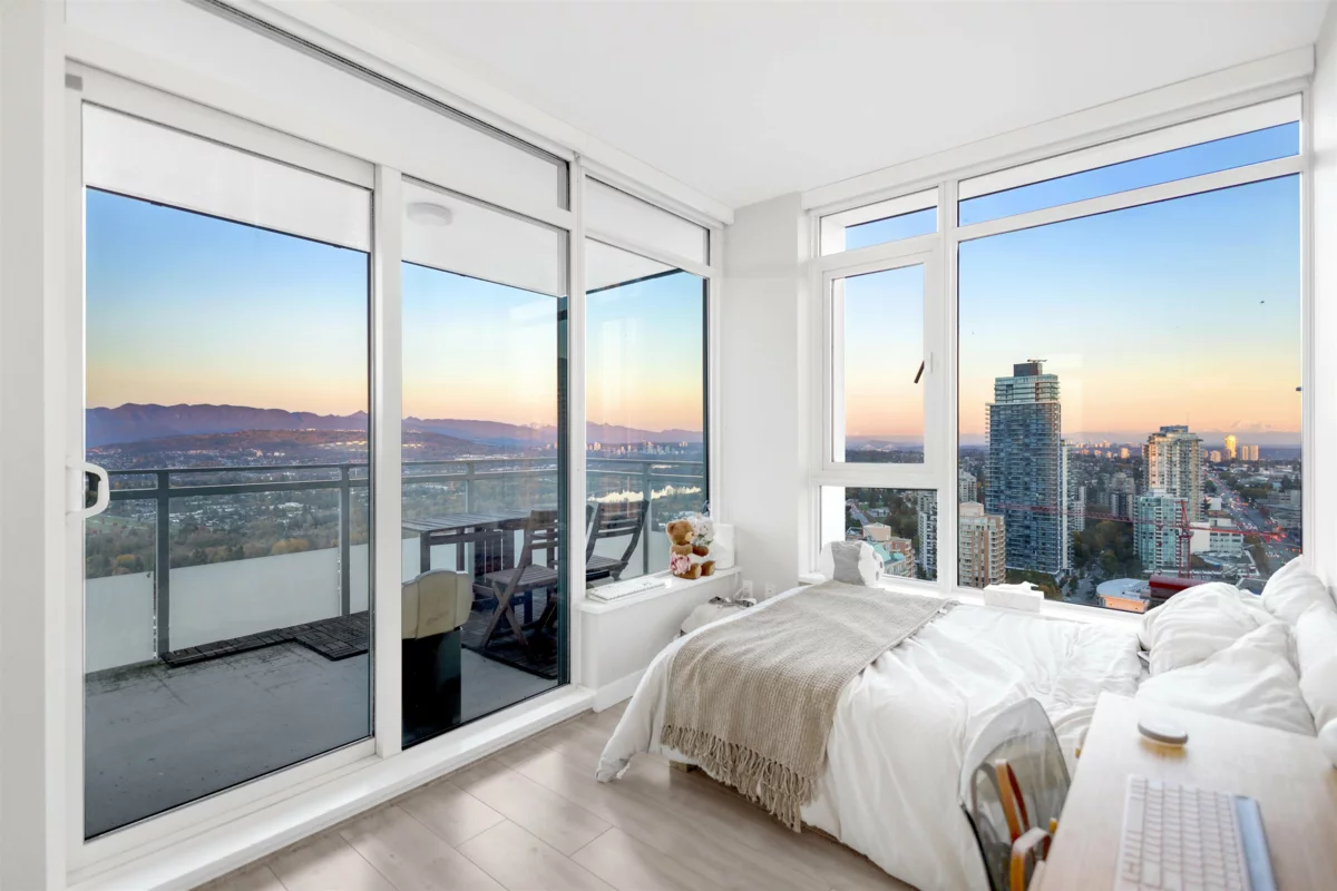 Beautiful northeast 2-bedroom corner unit on the 29th floor of Sovereign by Bosa offers 110 sq. ft. of balcony space and stunning panoramic views of Deer Lake, the North Shore Mountains, and the city. Features include central A/C, over-height ceilings, Miele appliances, Kohler fixtures, stone countertops, gas stove, and NuHeat bathroom floors. Enjoy 5-star amenities—indoor pool, sauna, gym, lounge, concierge, parking, storage, and bike room. Ideally located steps to Crystal Mall, Metropolis, restaurants, schools, SkyTrain, and Central Park.