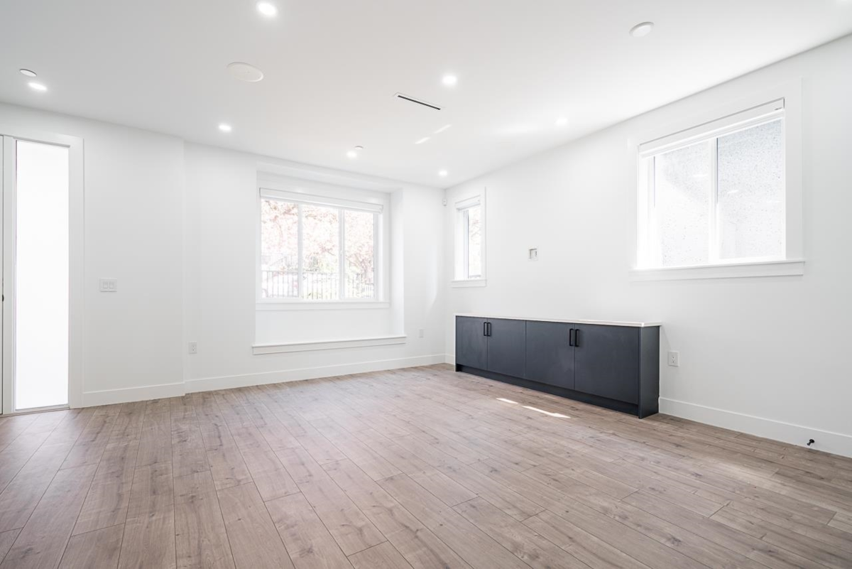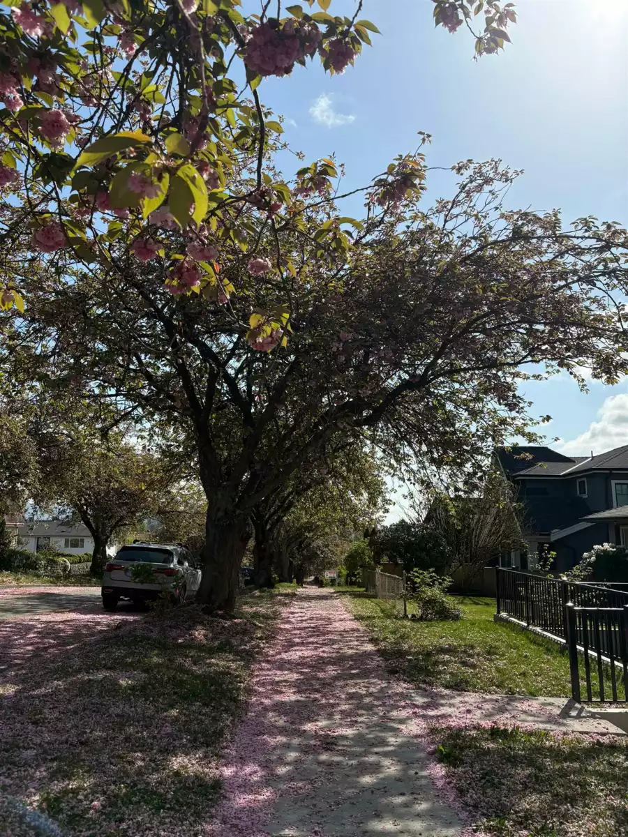 Craftsman Style Custom front duplex on a wonderful full bloom "Cherry Blossom" street. Prime location for all & young families alike. Schools, Shopping, Bus, Skytrain all w/in a 10 min. walk! Open concept main living area gives versatility for personal interior design. Much thoughtful detailing is evident throughout the three levels of living space with a bonus of 509sf of storage (4' crawl space) not included in the total sq.ft. This home offers 3 lrg bedrooms, accommodates regular size furniture and 4 full washrooms! Upper bedroom has 2 extra storage spaces & a cute private Romeo & Juliet balcony. Other features: quartz counters, heat pump, designer tiles, custom mill work incl. B/I entertainment units, A/C. Reasonably priced, good value for the fortunate Buyer. Open Sunday 1:30-3:30pm.
