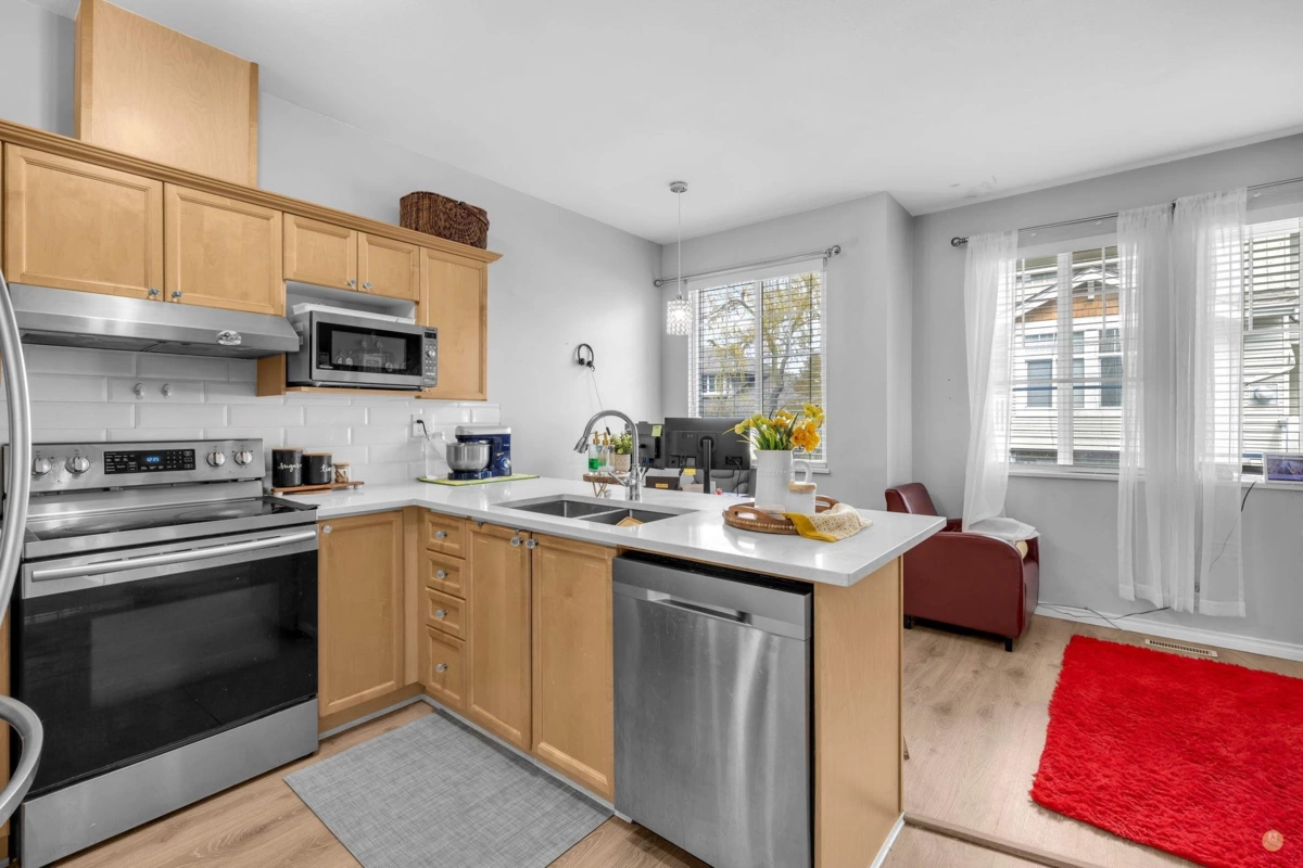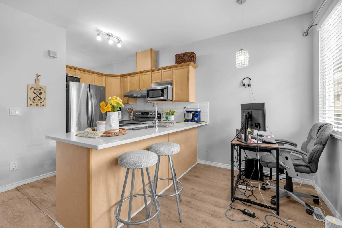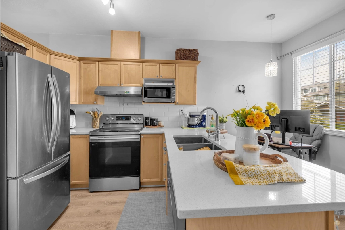 Duplex Style Townhouse! Discover the charm of this bright and spacious 2-bed, 2-bath townhome with 2 parkings located in family-friendly atmosphere, lush green spaces & convenient amenities. Offers fenced-in yard, contemporary laminate flooring under bright windows and high ceilings. Kitchen boasts stainless steel appliances and crisp quartz counters with a convenient breakfast bar. Adjacent laundry and naturally lit bedrooms, including a primacy suite with an ensuite and walk-in closet, provide comfort and convenience. Steps away from school, park, Starbucks, Fresh St. Market, McDonalds, Shoppers Drug, 152 St, Hwy 10 & King George. Walking distance to new French Immersion school - Snokomish Elementary. Call now to book appointment.Open House Sat - Sun 12 - 2 PM