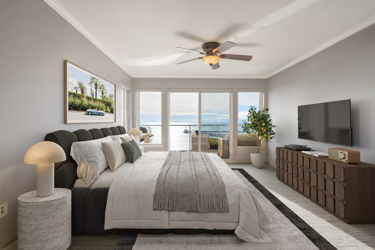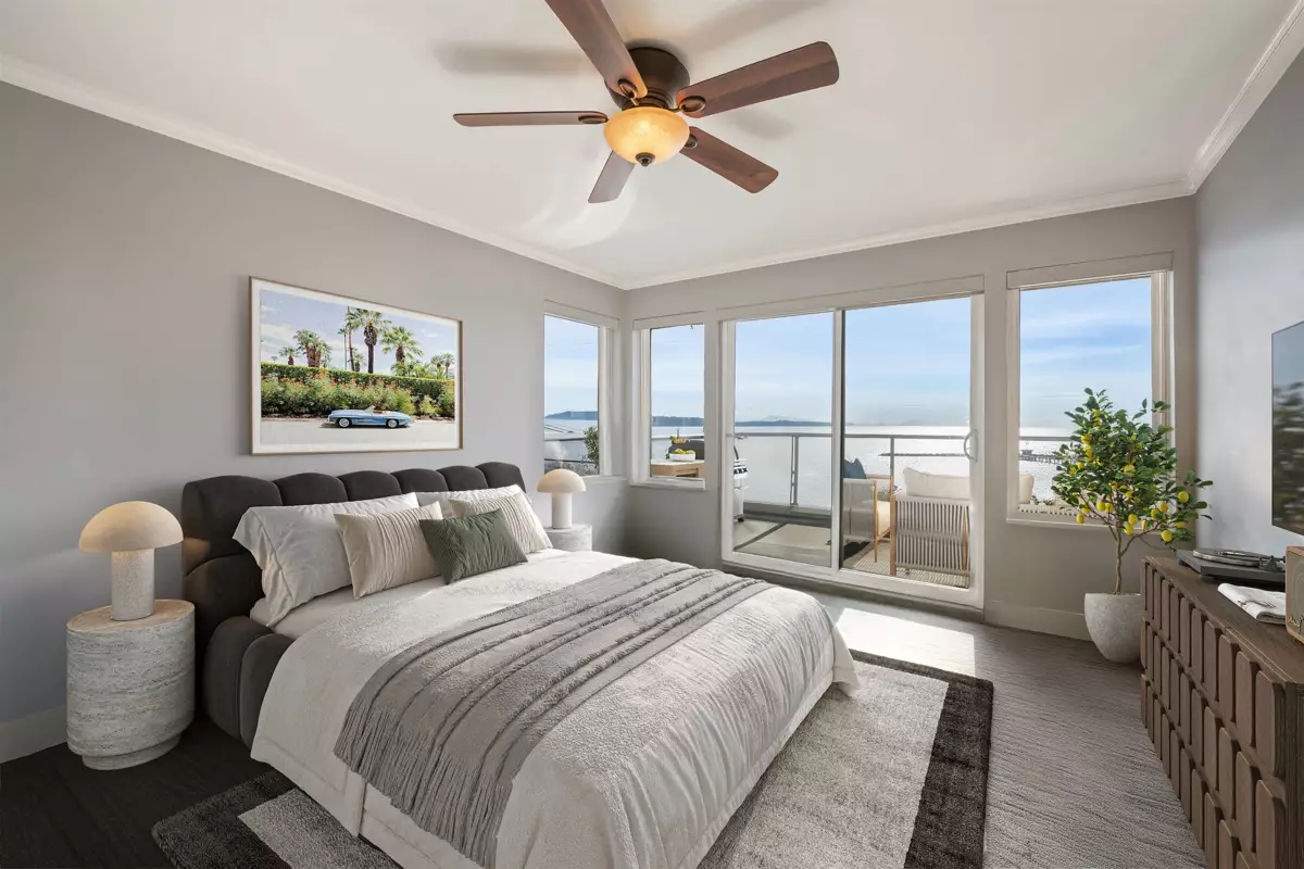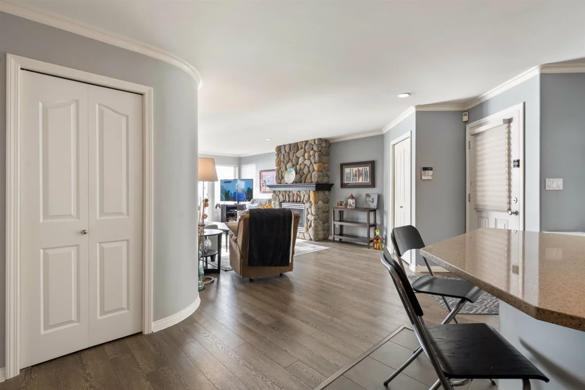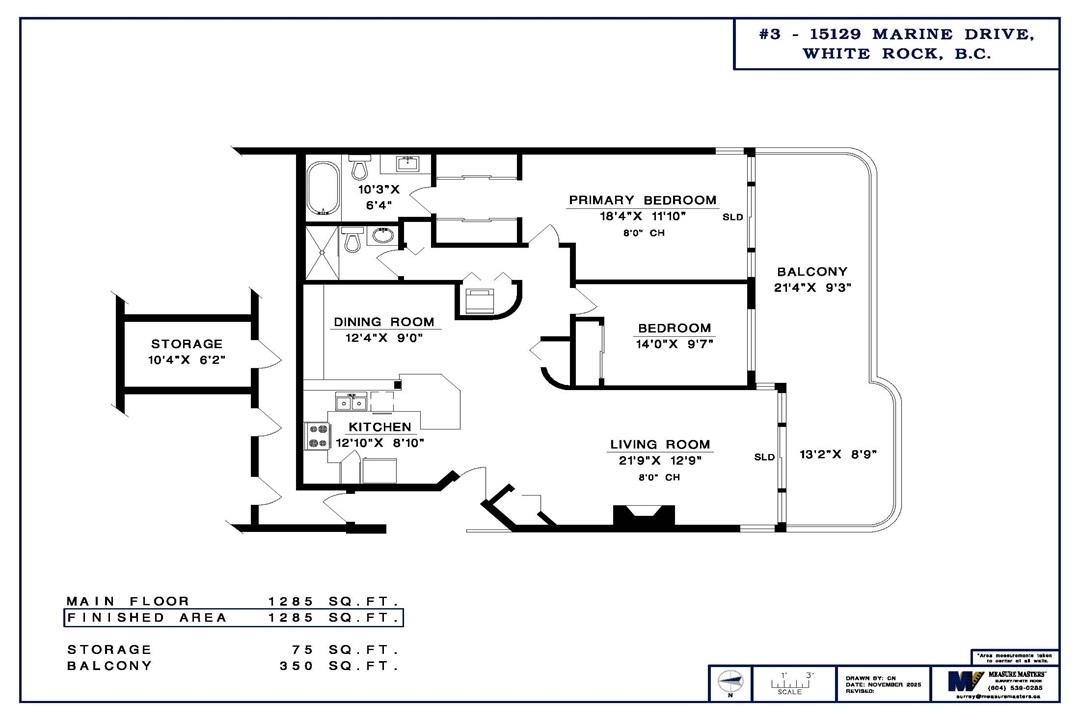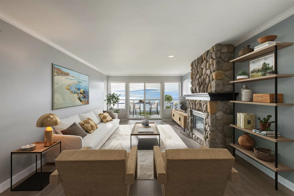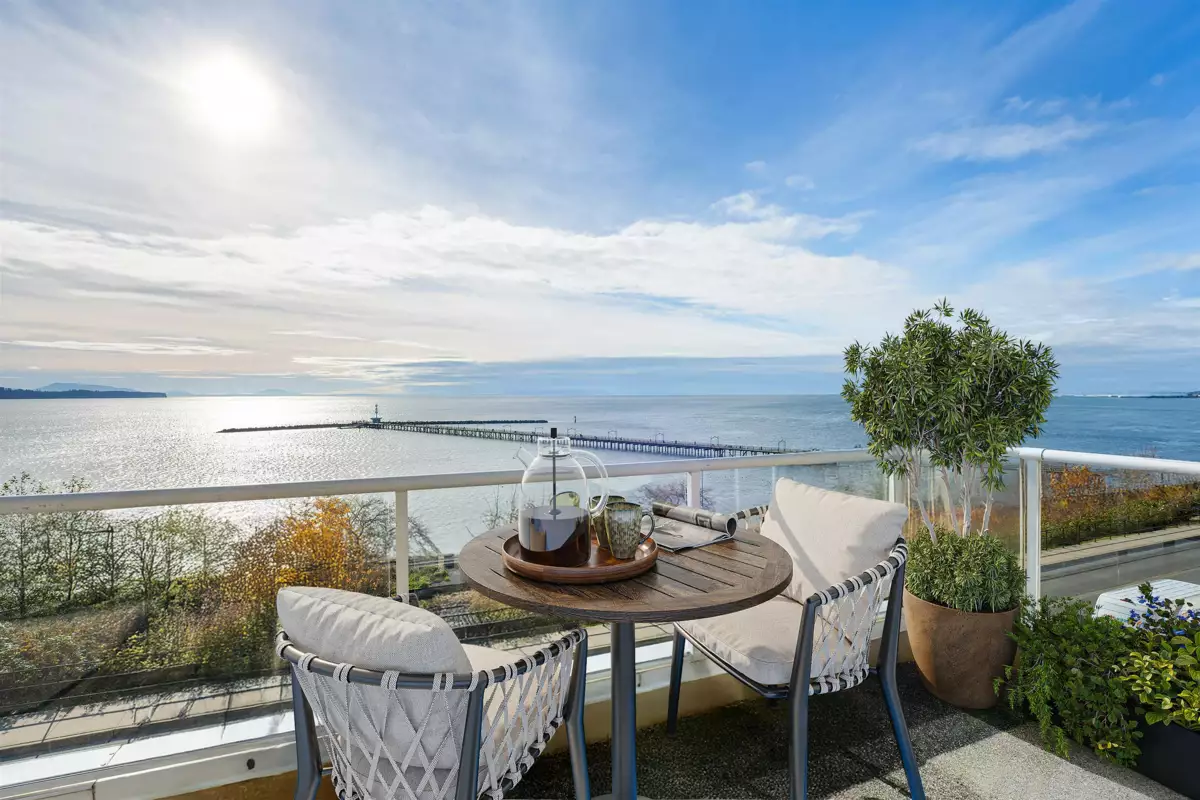 "San Juan Terrace I" the entire third floor 1,285 SF. 24'6" Frontage direct south ocean views hanging over the White Rock Pier. Ocean view balcony south facing 350 SF. Large awning on balcony, feature river rock wall natural gas fireplace in living room. 2015 renovated kitchen with eating bar island, lots of storage in kitchen cabinets. Exceptionally large primary bedroom with ocean view. Two bedroom and two full bath. Both bedrooms have ocean view. Radiant in-floor heating in suite. One parking in carport at laneway plus guest parking with White Rock permits out front. No pet restrictions. Large stand alone storage locker on your floor 75 SF. Strata fee $350/month. New boilers in building Feb 2023, new roof 2012. In-suite hot tank Oct 2025.