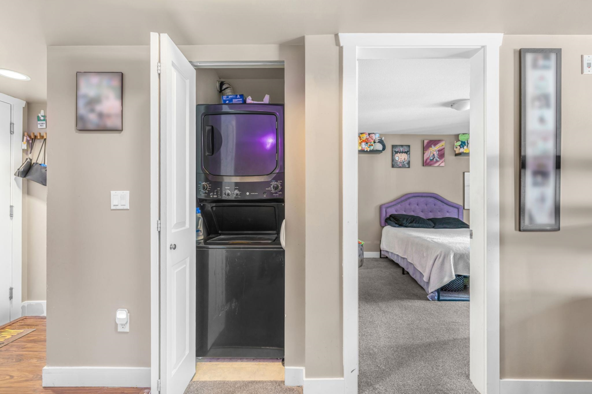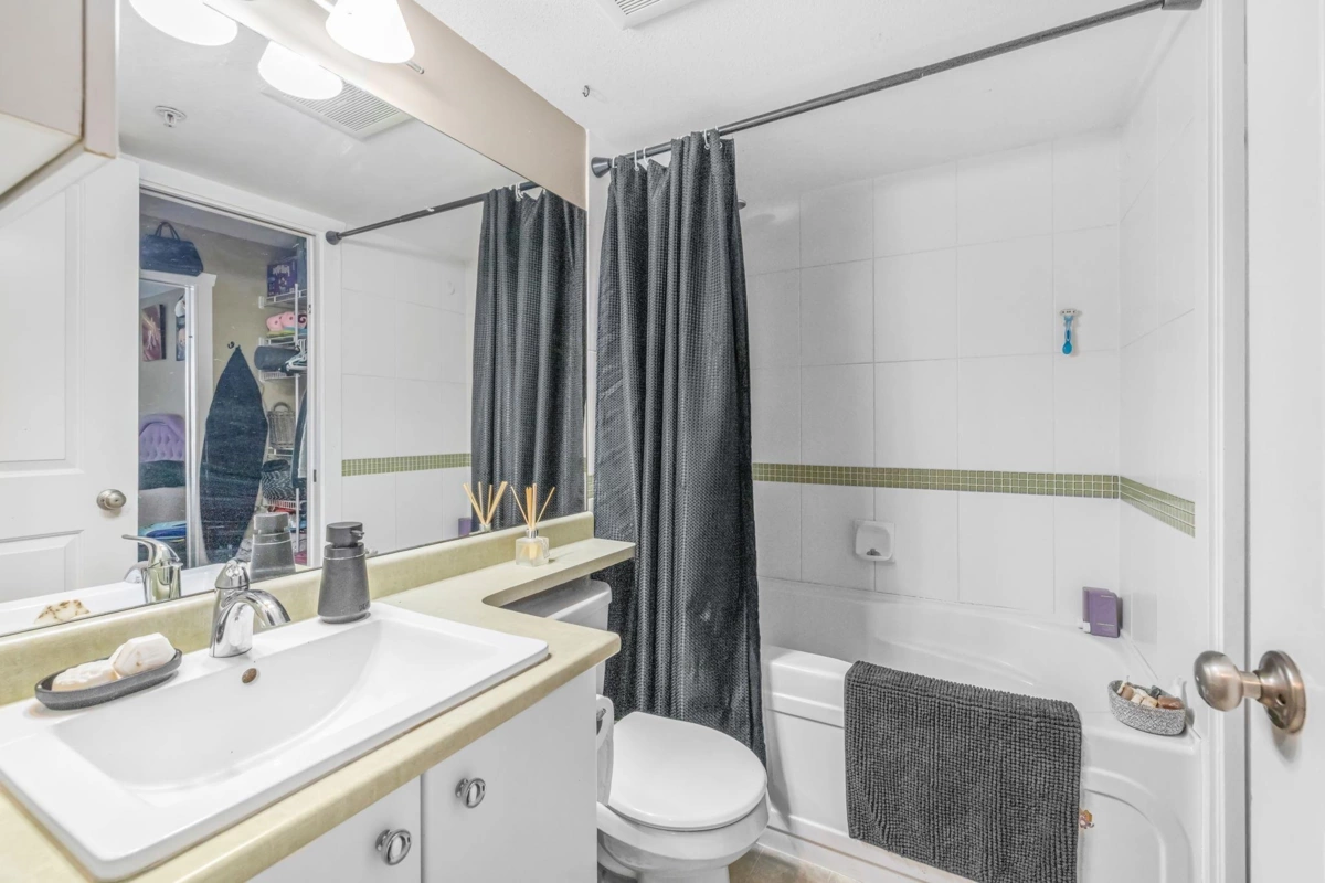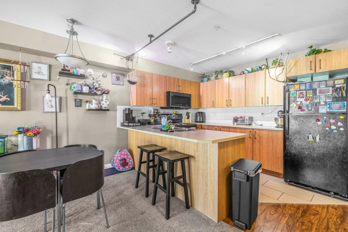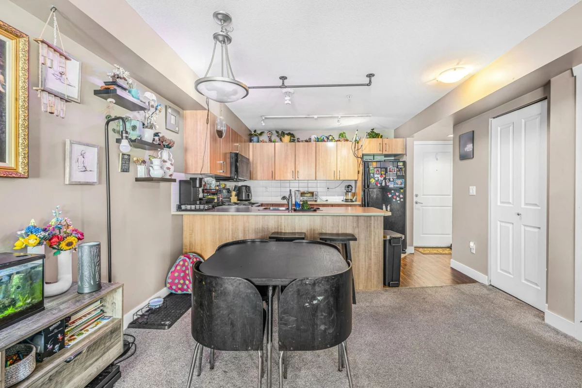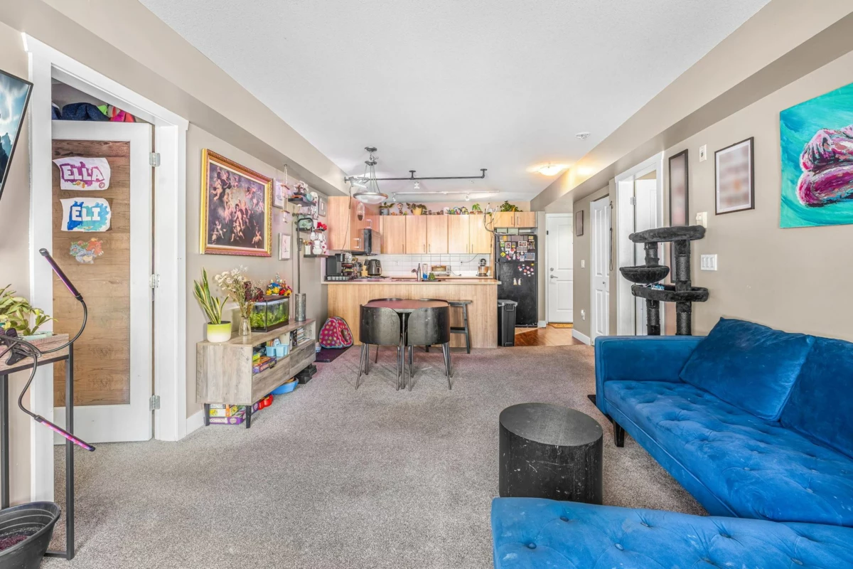 Welcome to The Vibe! Great for Investors or first-time buyers. This 2-bedroom Open concept design. Kitchen features dark rich cabinets with a large breakfast bar. The good-sized master bedroom has a walk-in closet and a cheater ensuite. Ins uite laundry, 1 parking stall and storage locker. Close to Cottonwood Mall, restaurants and 1/2 a block to public transit. The unit is on the quiet side of the building.