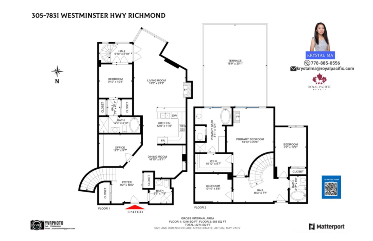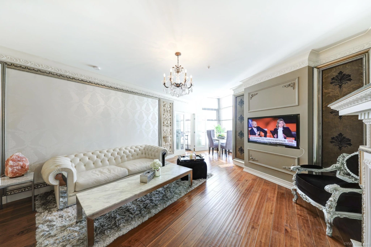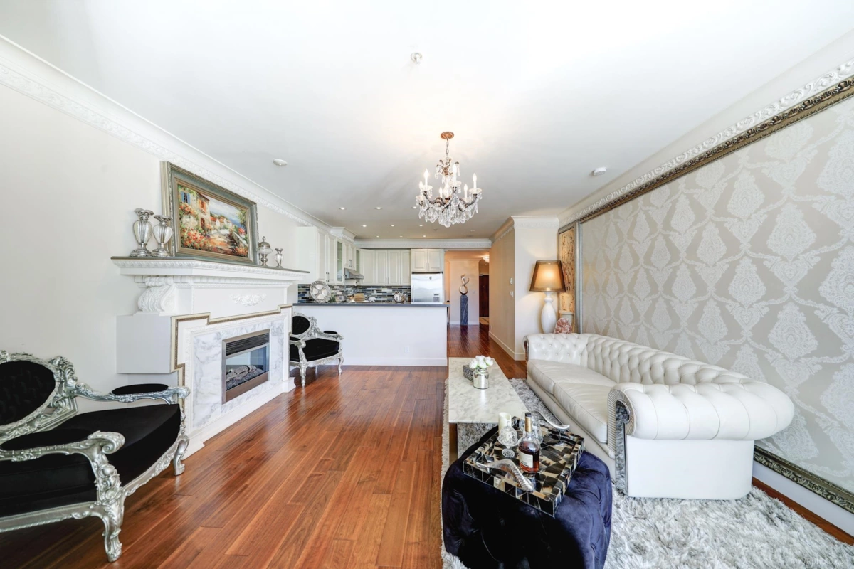 The Capri – Rarely available 2-level concrete luxury residence in the heart of Richmond! Over 2,200 sq ft with 2 primary bedrooms (1 up, 1 down), 2 additional bedrooms, a den, and 3 full baths. Professionally renovated in 2013 with luxury finishes including engineered hardwood, limestone tile, crown moulding, custom white cabinetry, and designer Schonbek chandeliers. Bright living room with floor-to-ceiling windows, elegant dining area, and quality kitchen appliances. Wrought-iron spiral staircase leads to a private patio and upper terrace, making it feel like a luxury detached home. This well-maintained building has an impressive contingency reserve fund of $1.28 million, ensuring peace of mind for owners. Includes 4 parking stalls + 1 locker. Steps to Richmond Center. Open house 3 - 4pm