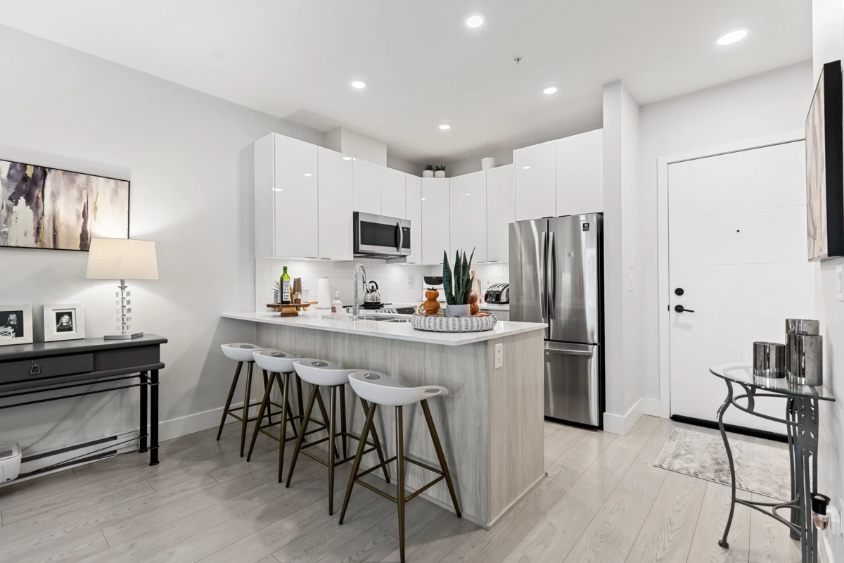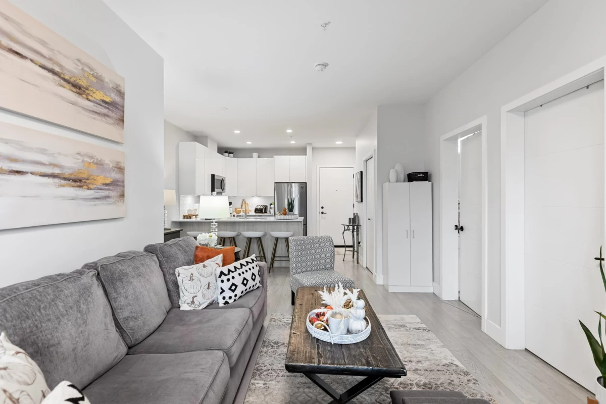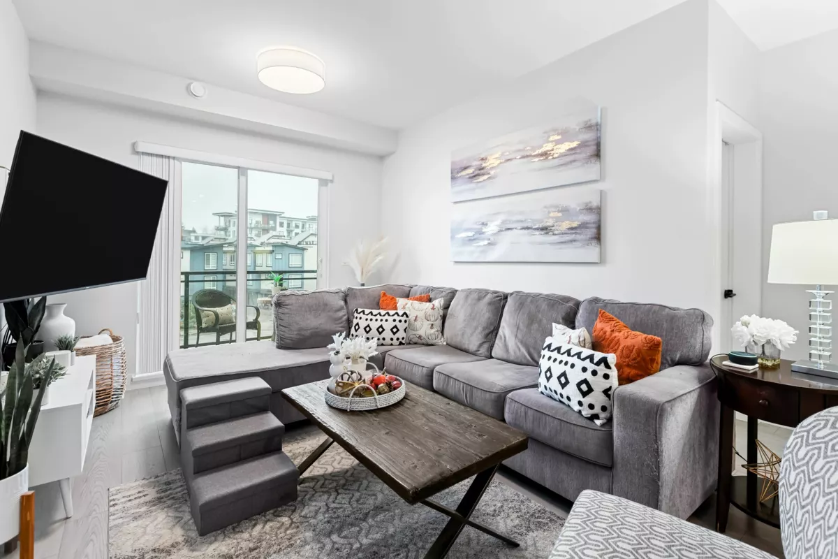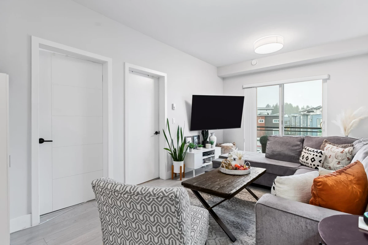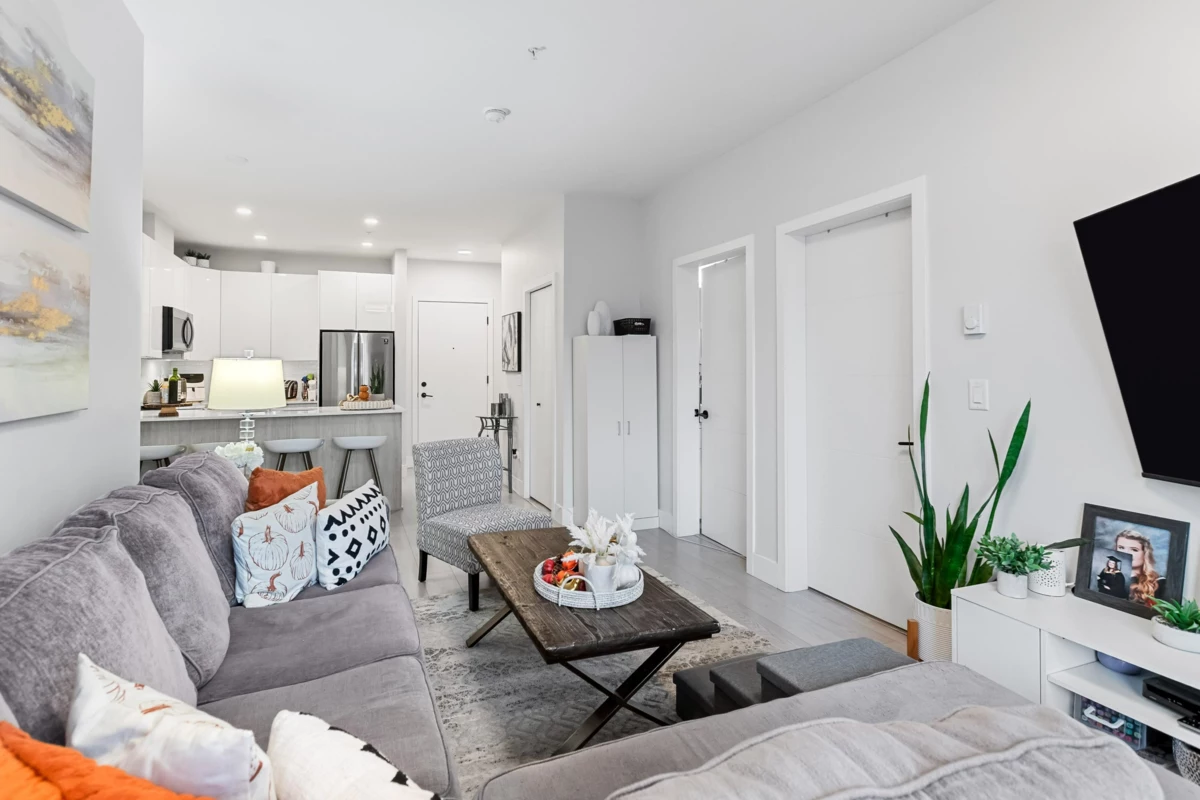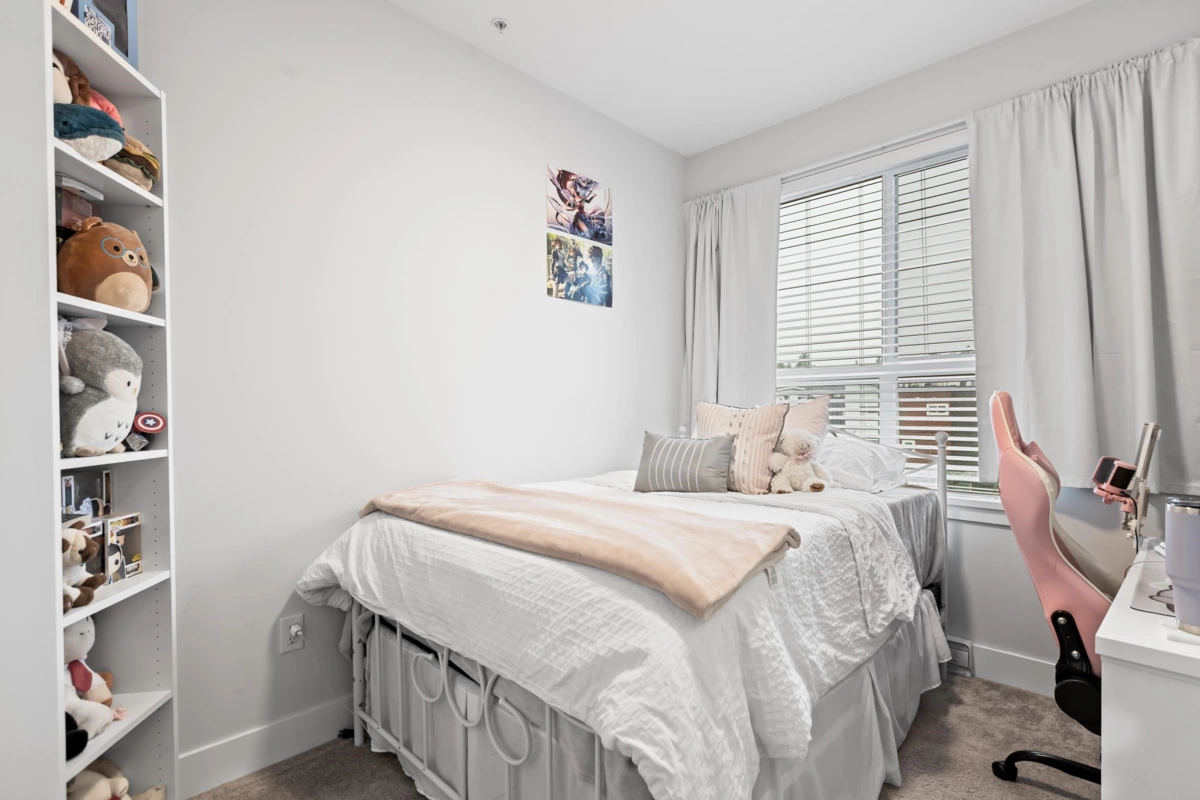 HELLO GORGEOUS! Celebrating a bright+spacious 912ft designer home just steps to Brydon Lagoon, Nickomekl river trails & close to the FUTURE SKYTRAIN expansion! An expansive 2 bedroom + den/office/nursery and 2 bath home w/9ft ceilings to invite abundant natural light throughout modern and high quality living. A stunning kitchen w/premium finishing to cook and entertain, set over open living and spacious west exposed patio for morning coffees and evening sunsets! Functional as a 3 bed if needed! Revitalize at Ezekiel’s residents-only gym, yoga studio or relax & unwind in the fully equipped theatre room. BUILT TO LAST by the Fraser Valley’s multi-family specialist Whitetail Homes, and only a few years young for peace of mnind living and excellent long term investment! VACANT DEC 1!