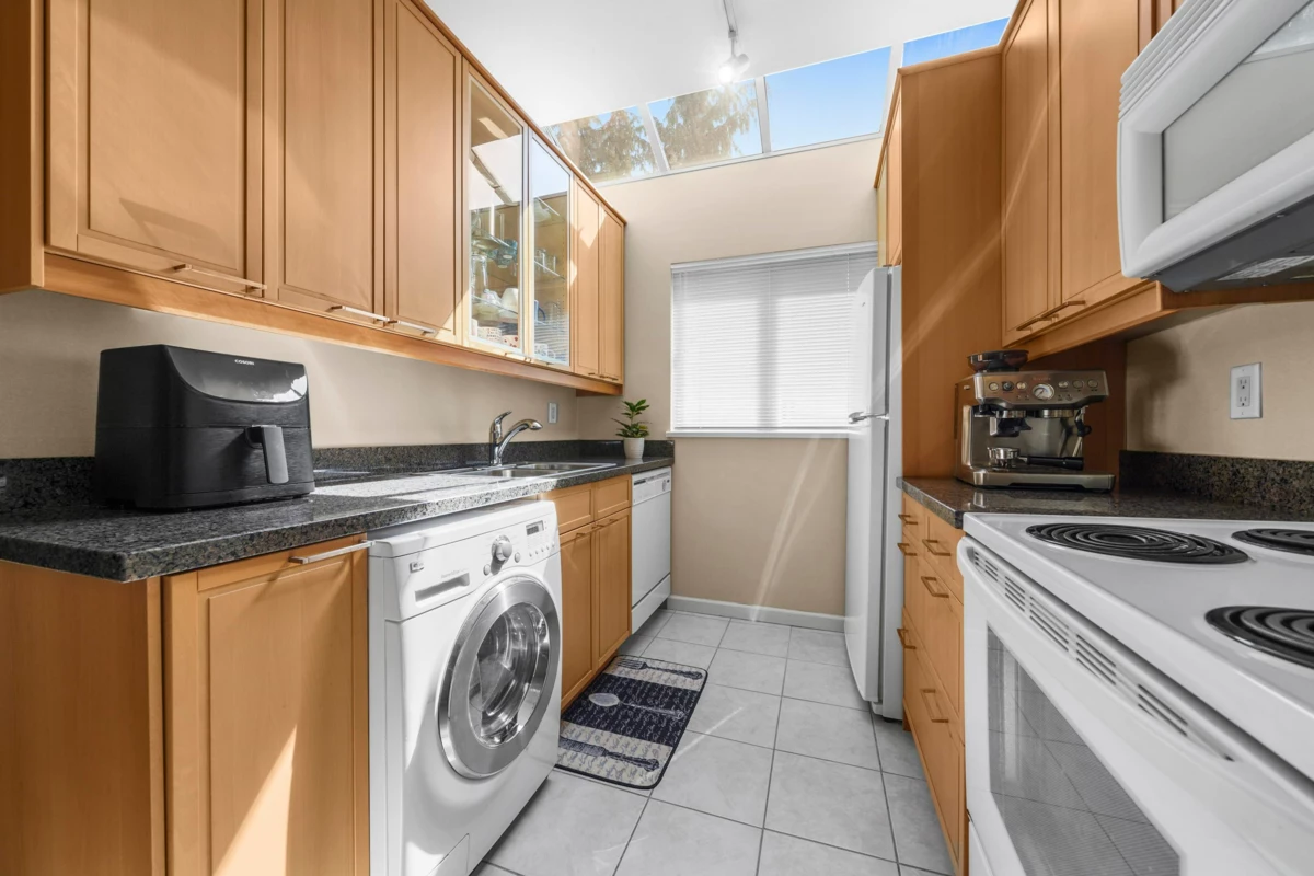 Cedarcrest, across from Mosquito Creek Park (great for walkers & dogs). This lovely TOP FLOOR – CORNER UNIT home has 9 FOOT ceilings & a window plus skylight in kitchen making this home a bright delight. You will also enjoy the oversized private balcony (115 SF) looking out to trees! The building had a full exterior modernization in 2006, including rainscreen, vinyl siding, windows, balcony membranes & guardrails & all suites had interior renovations with custom wood kitchen cabinets, granite counters, flooring, & a European laundry machine. In 2011 - bathroom tile, soaker tub. In-suite storage, 1 secured underground parking & 1 locker. Near Capilano Mall, Shopping, dining, transit, professional services. Families of 3 persons welcome. Two pets allowed.