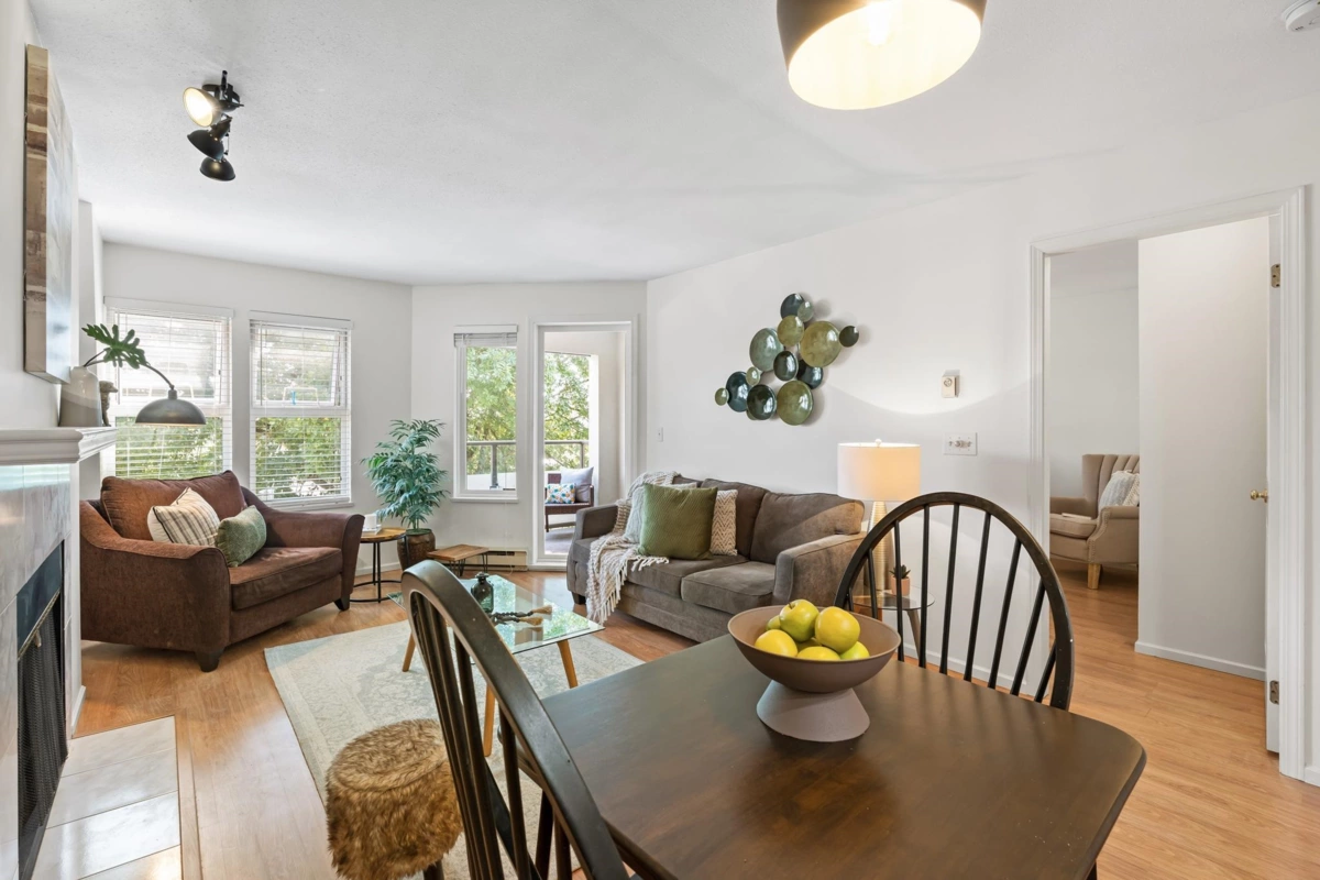 Welcome to Le Chateau II, Maillardvilles hiddem gem! Situated in a very quiet setting, this quality building has a newer roof, windows, balconies & has been rain screened! This bright, top level, south facing condo is very private & faces a treed setting. Freshly painted with brand new (2023) blinds, lighting & kitchen appliances. Cozy gas f/p in living area with gas included in the strata fee. Comes with 1 parking & storage locker. Walking distance to Cactus Club, VIP theatres, bowling, shopping & transit. Quick Highway access. This fantastic home is awaiting its next chapter… could it be you?