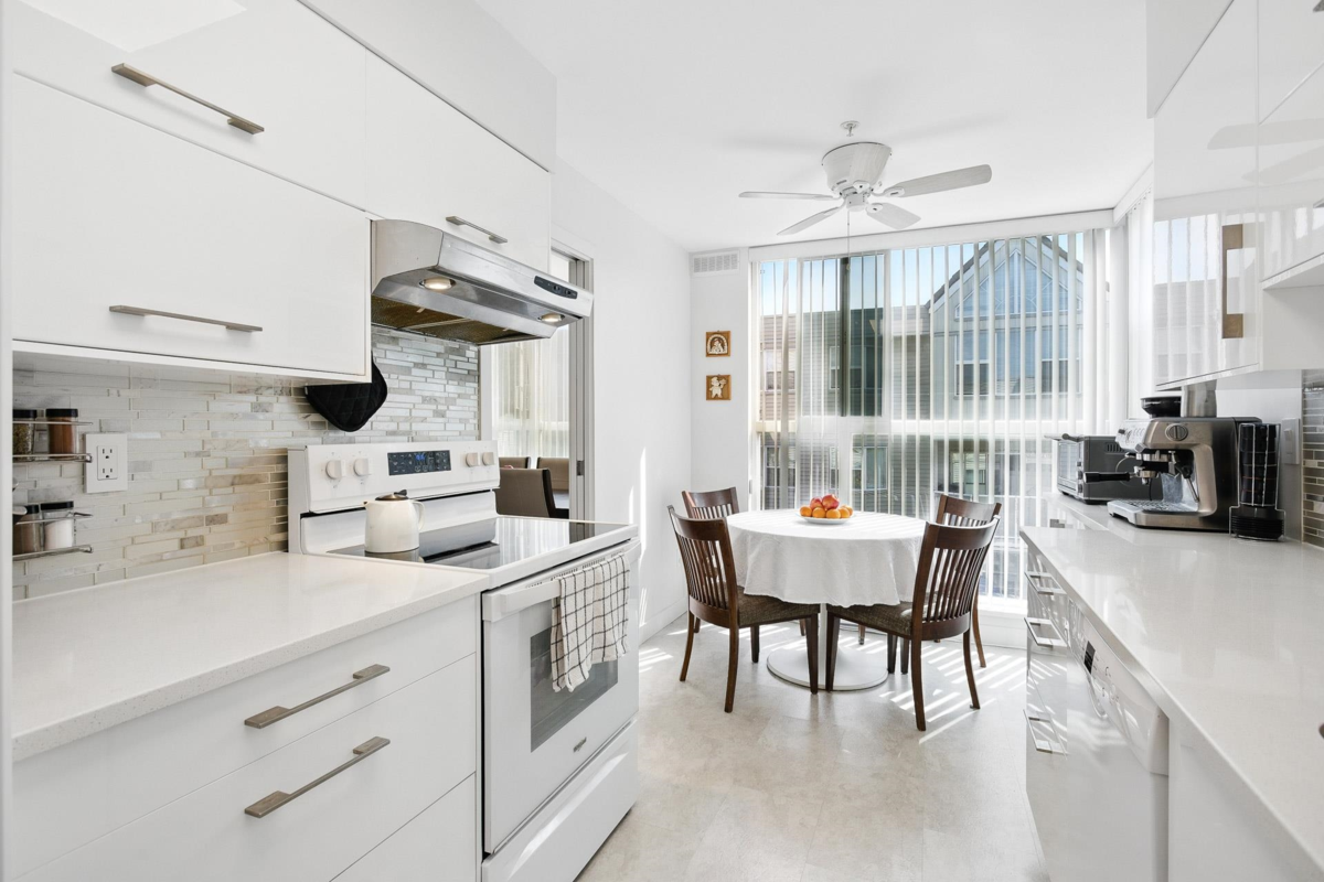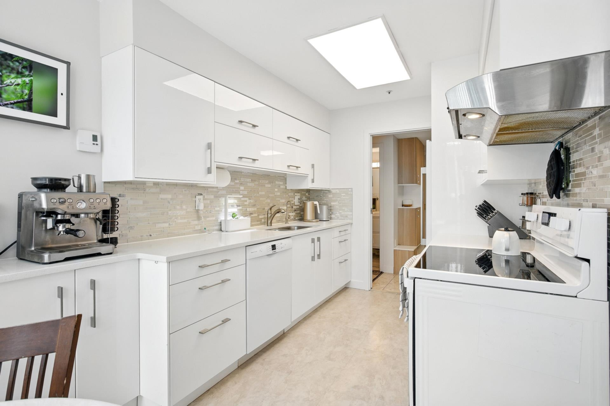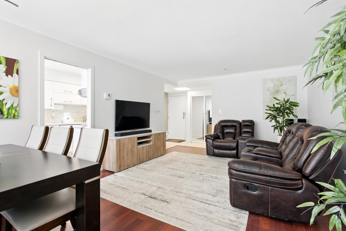BEAUTIFULL PENTHOUSE on quiet side of building in desirable Brighouse South. Offering bright & spacious living, this 3-beds, 2-baths home features renovated timeless white kitchen w/quartz countertops, newer appls, & cozy dining area.The entire unit has been freshly painted & boasts updated baths & durable laminate flooring throughout. Generously sized living & dining rooms create welcoming space for relaxation & entertaining. Enjoy 2 balconies, including impressively large one perfect for hosting family gatherings /creating your own urban garden. 2 parking spots & storage locker. Building has been updated w/large windows, new hallway carpets, & fresh paint. Conveniently located w/ bus stop right at the front door this S/E facing unit centrally located.