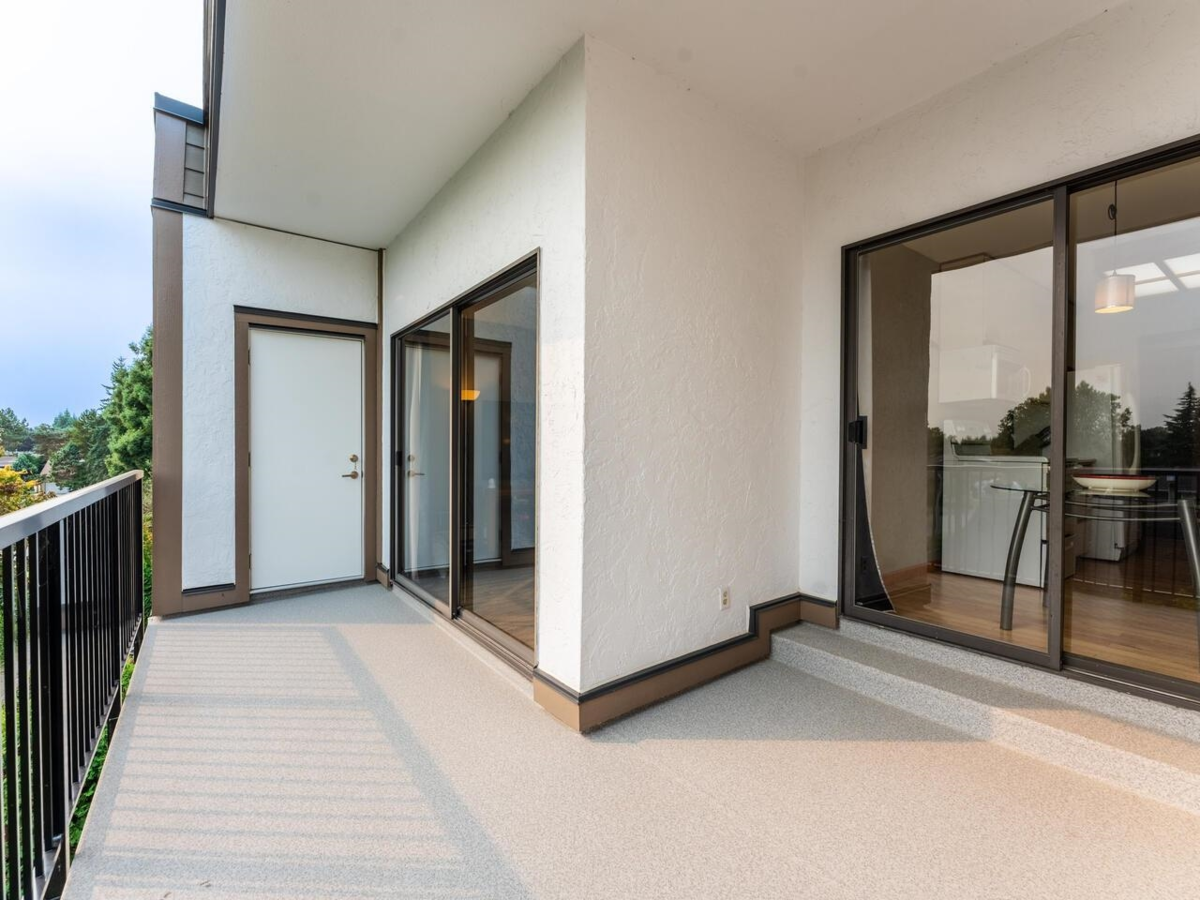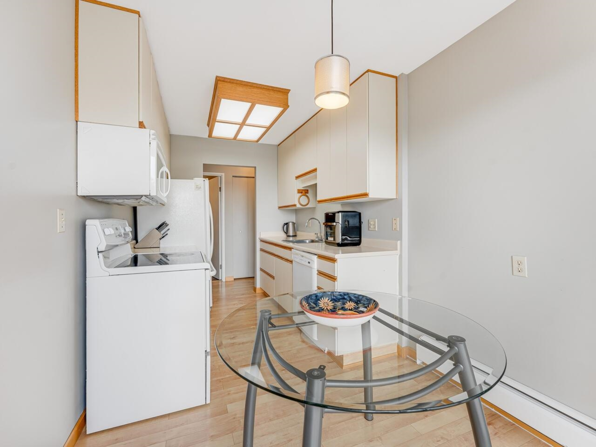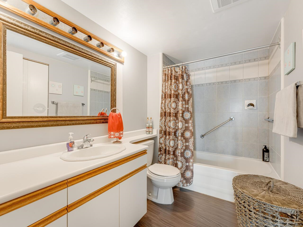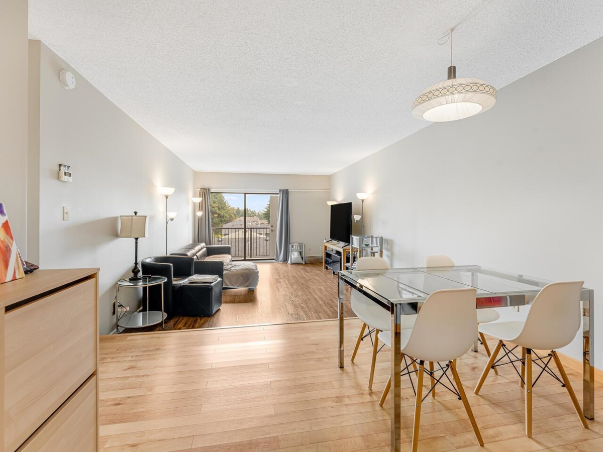 Top floor at Apple Greene Park! This over 1,000 sq ft 2-Bedroom corner unit offers spacious and comfortable living areas, bright kitchen and eating area, Extra Storage Room on the balcony and In-Suite Laundry. Laminate flooring in living and dining room. Balcony, building envelope, roof, all bedroom windows and both doors access to the balcony upgraded in 2022. Excellent amenities include gym, indoor and outdoor pools, sauna room and hot tub. BONUS: 1 parking stall & 1 locker. PLUS, heat, hot water and city utilities are included in the strata fees.