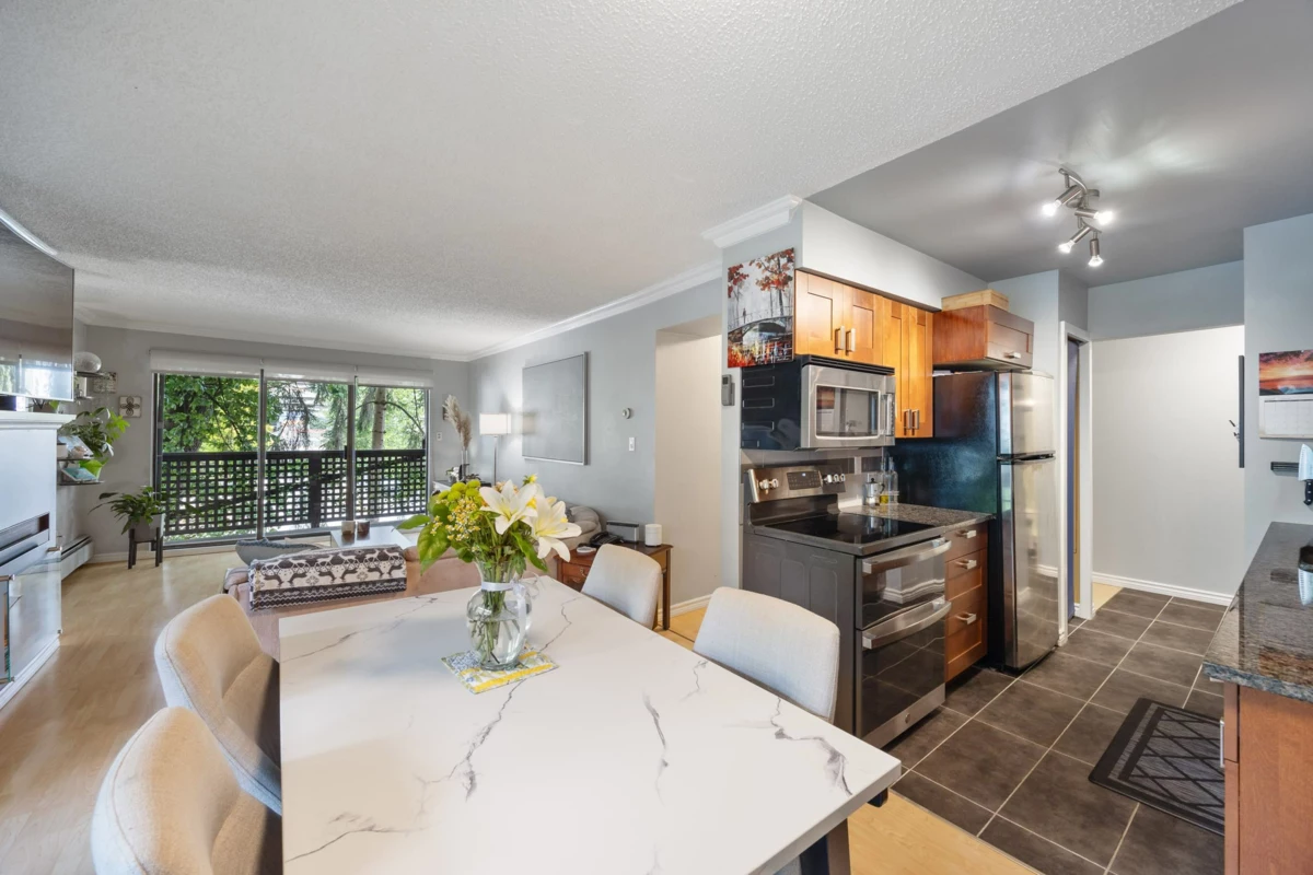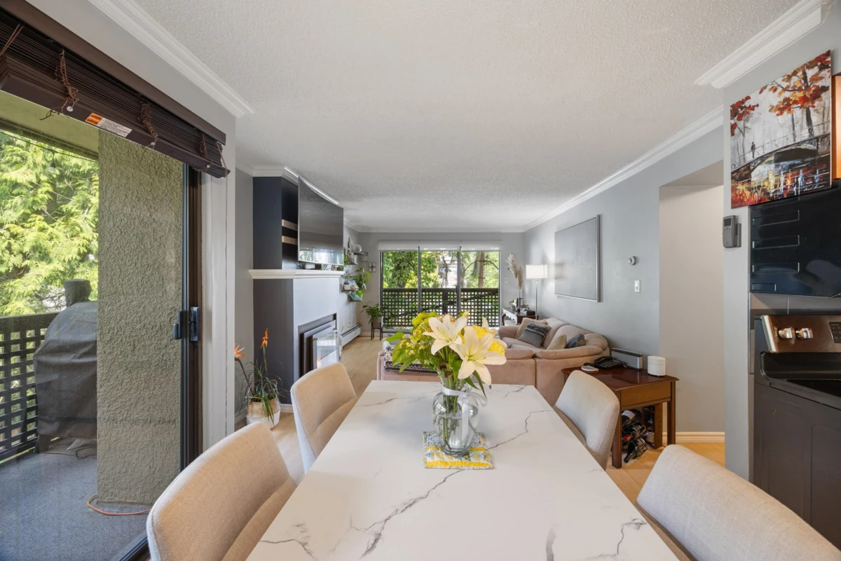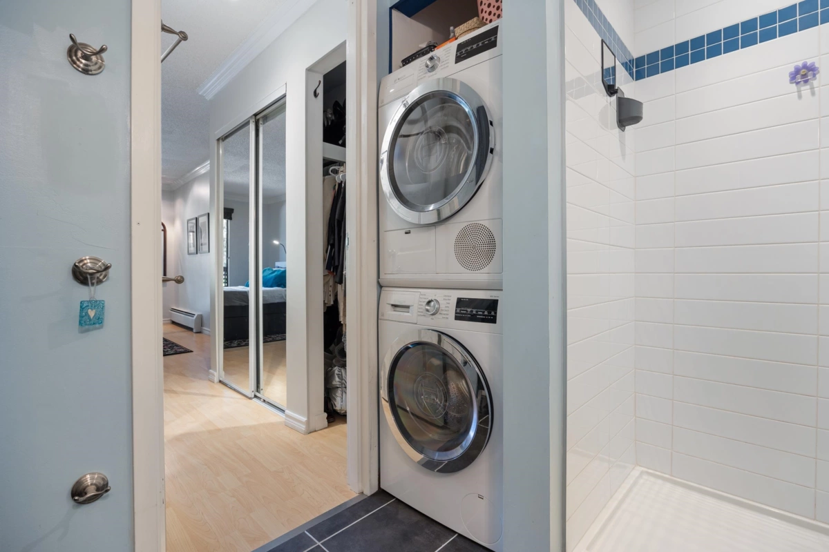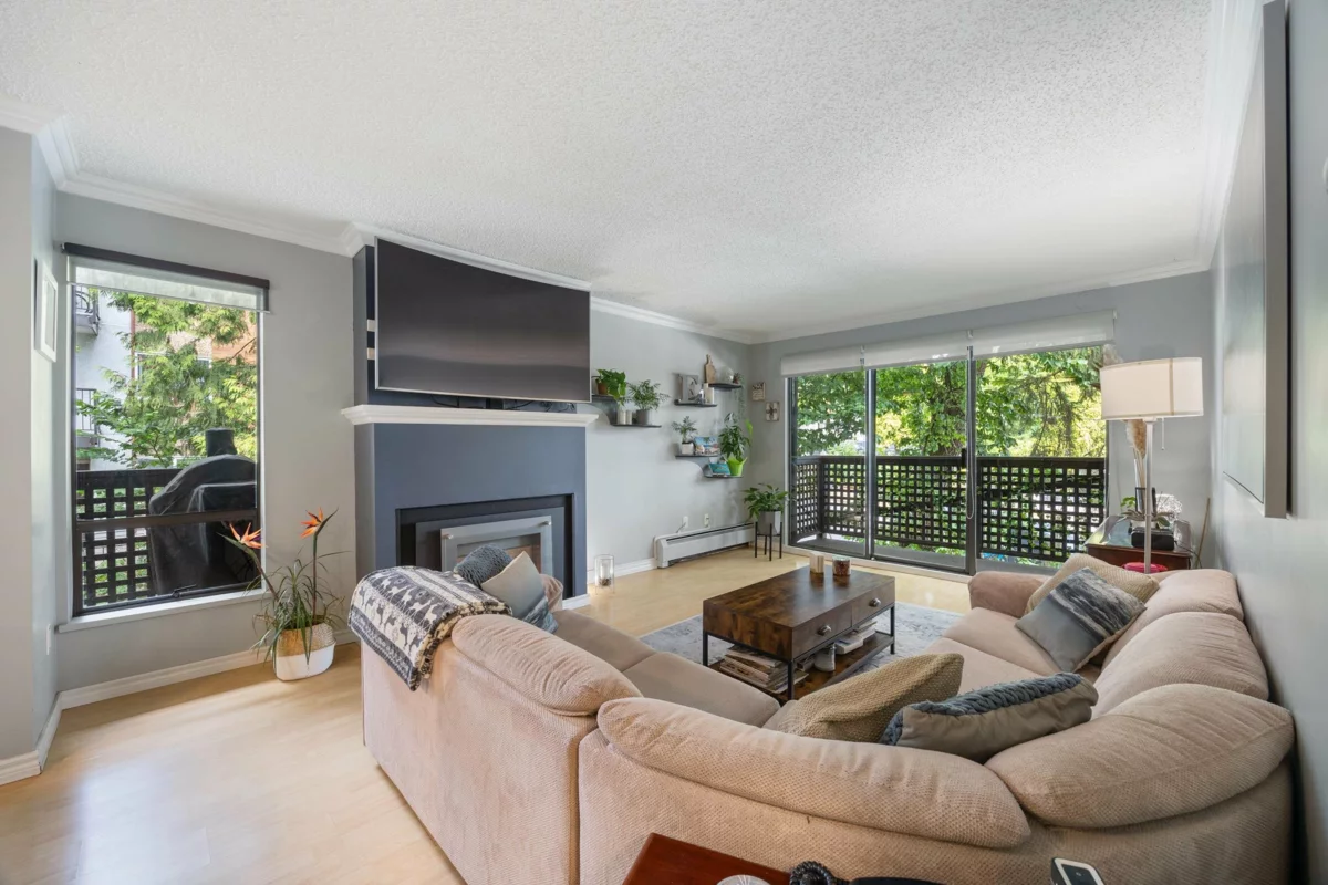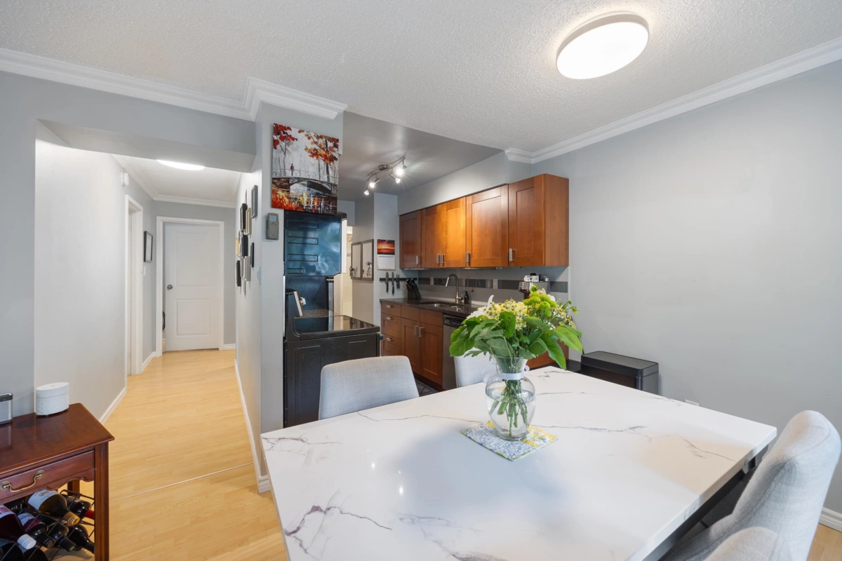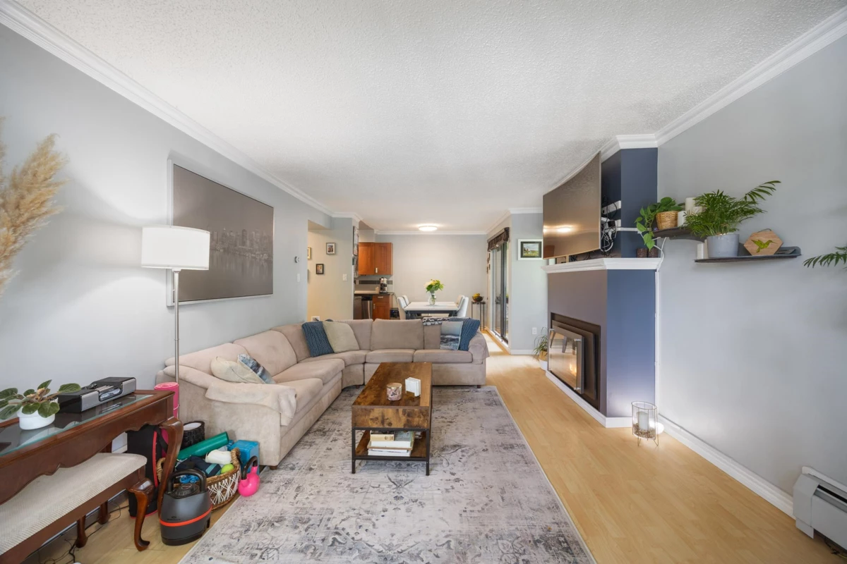 2-Bedroom Corner Unit – 905 sq ft. 8ft Ceilings. Updated bright corner suite with in-suite laundry! Enjoy a modern kitchen with updated appliances, a renovated bathroom featuring a custom glass rain shower, laminate flooring, crown mouldings, cozy gas fireplace. Two balconies offer great outdoor space: 31’6” x 3’11” and 11’8” x 5’10”, complete with a custom storage bench. Recent building updates include plumbing (2007), roof (2008), and balconies (East 2023, North 2024). Maintenance fees cover heat, hot water, gas & water. Includes 1 parking stall and storage. Pets welcome! Conveniently located 10-min walk to SkyTrain, near bus transit, New Westminster Quay, Royal City Centre, Queenspark, Douglas College, and close to highways. Perfect for first-time buyers, downsizers, or investors.