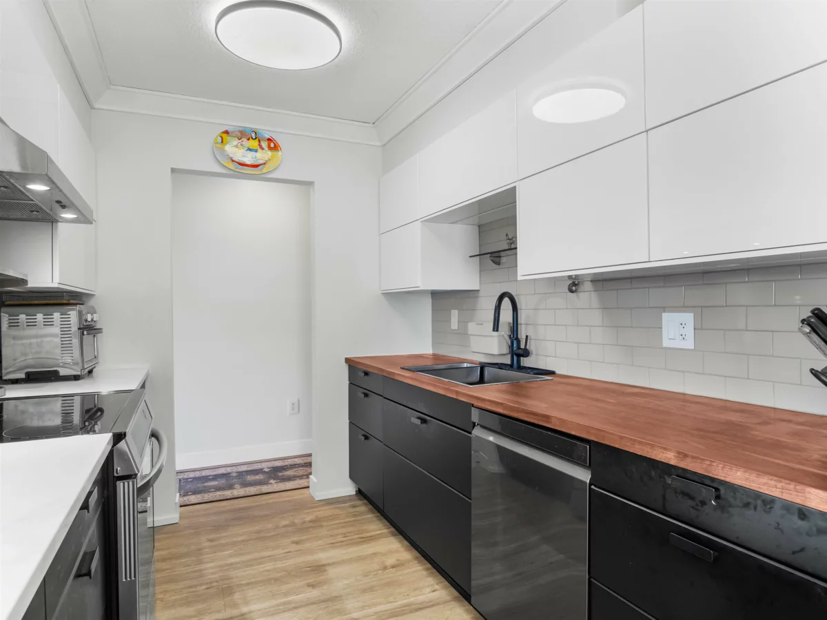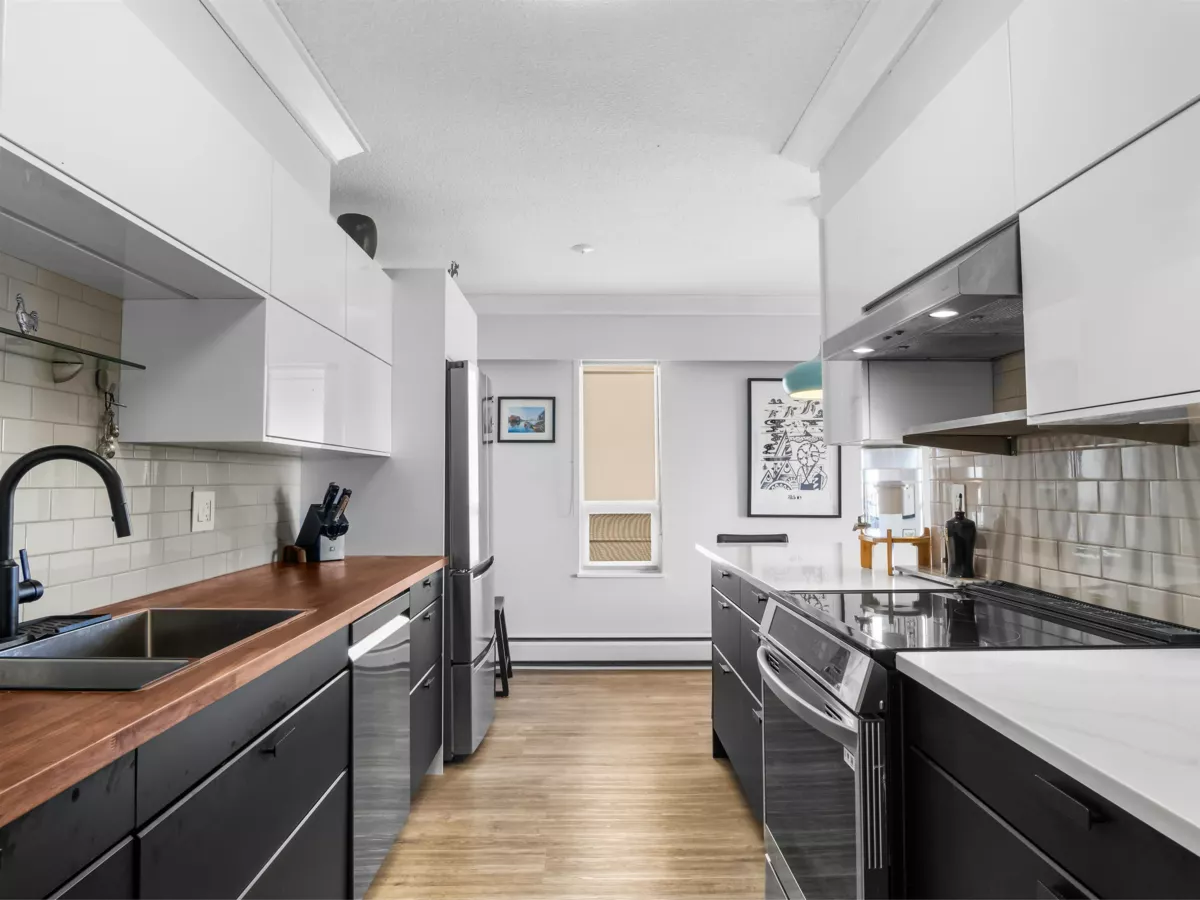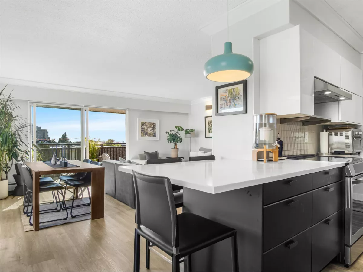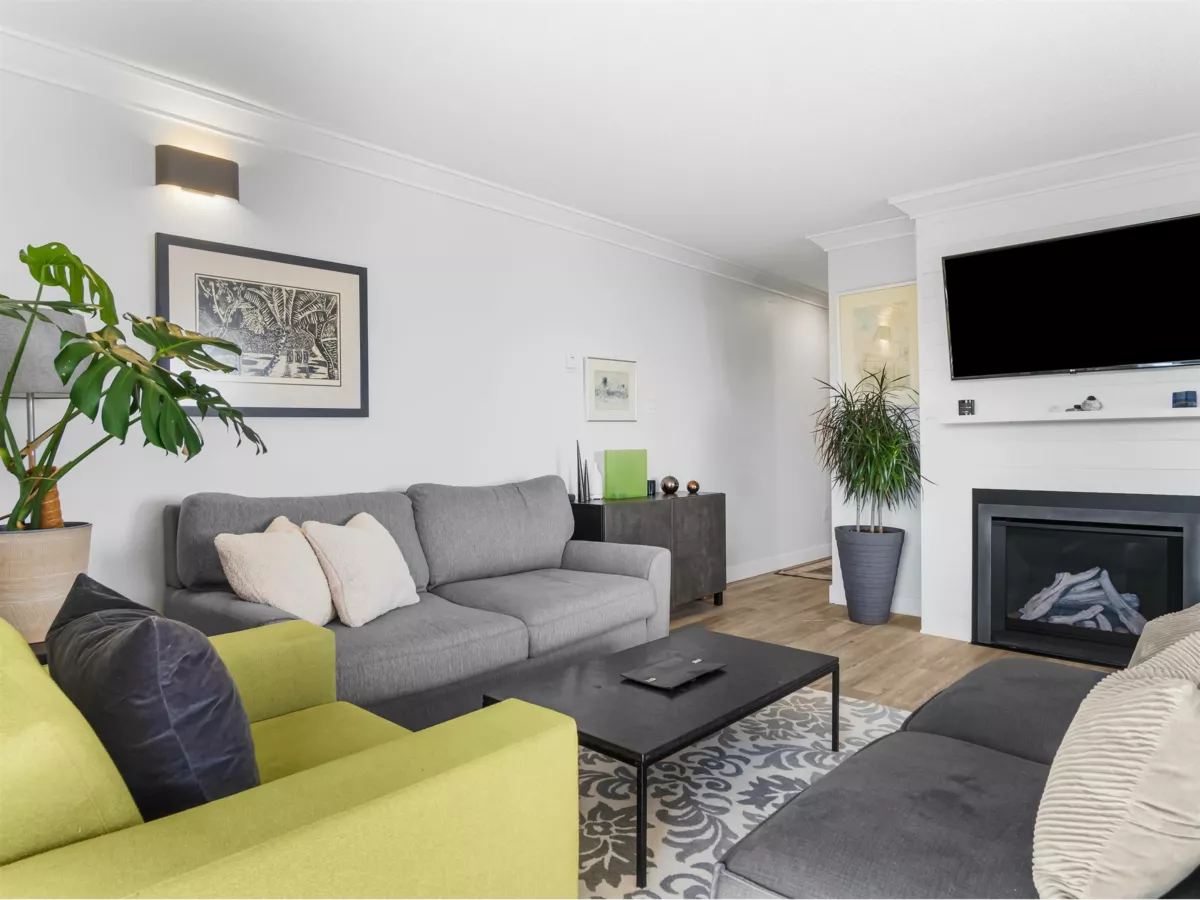 Gorgeously renovated, south facing 2BR/1BA condo in Central Lonsdale! This top floor, corner unit has extensive updates. In the kitchen, recent appliances with induction stove plus all new cabinets, wood and stone countertops extended to an eating area. The large, bright living/dining area features durable wide plank vinyl floors, plus an updated gas fireplace and looks out to a huge and sunny wrap around balcony that overlooks the treed street. Beautifully tiled bathroom has an updated shower with inset nooks for storage. Recent closet doors, light fixtures. The well-run building has many upgrades including balconies, windows, sliding doors, electrical, plumbing. Steps away from all Central Lonsdale shops, medical, new Harry Jerome and minutes to the highway. 1 pkg, 1 stg, dog or cat ok.