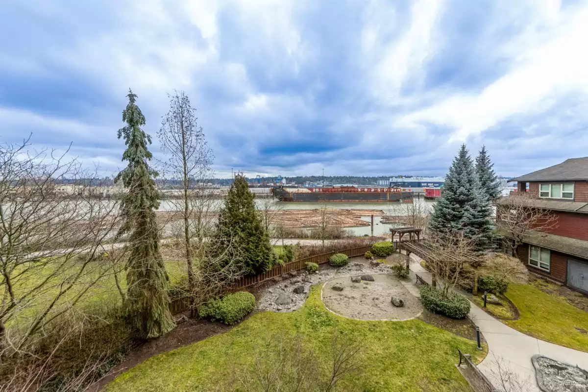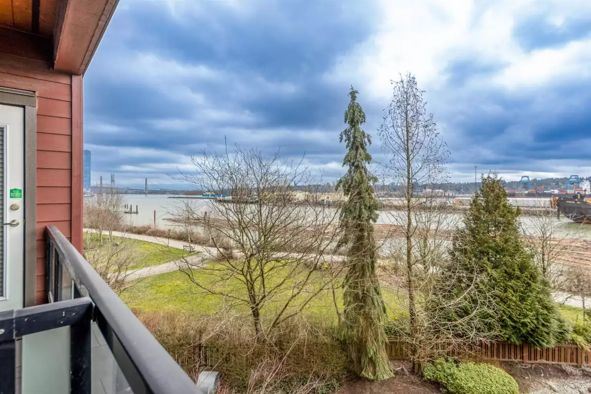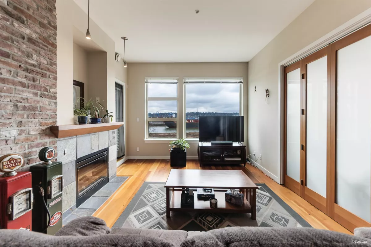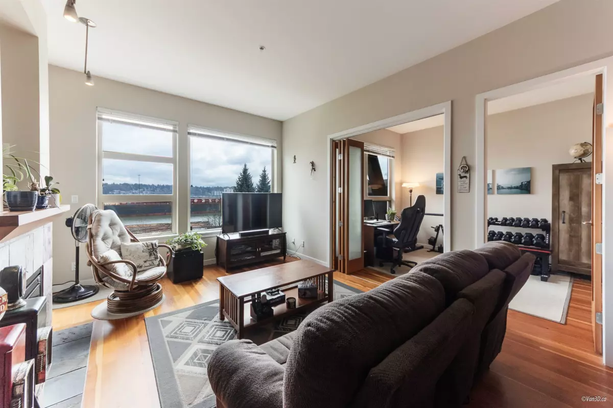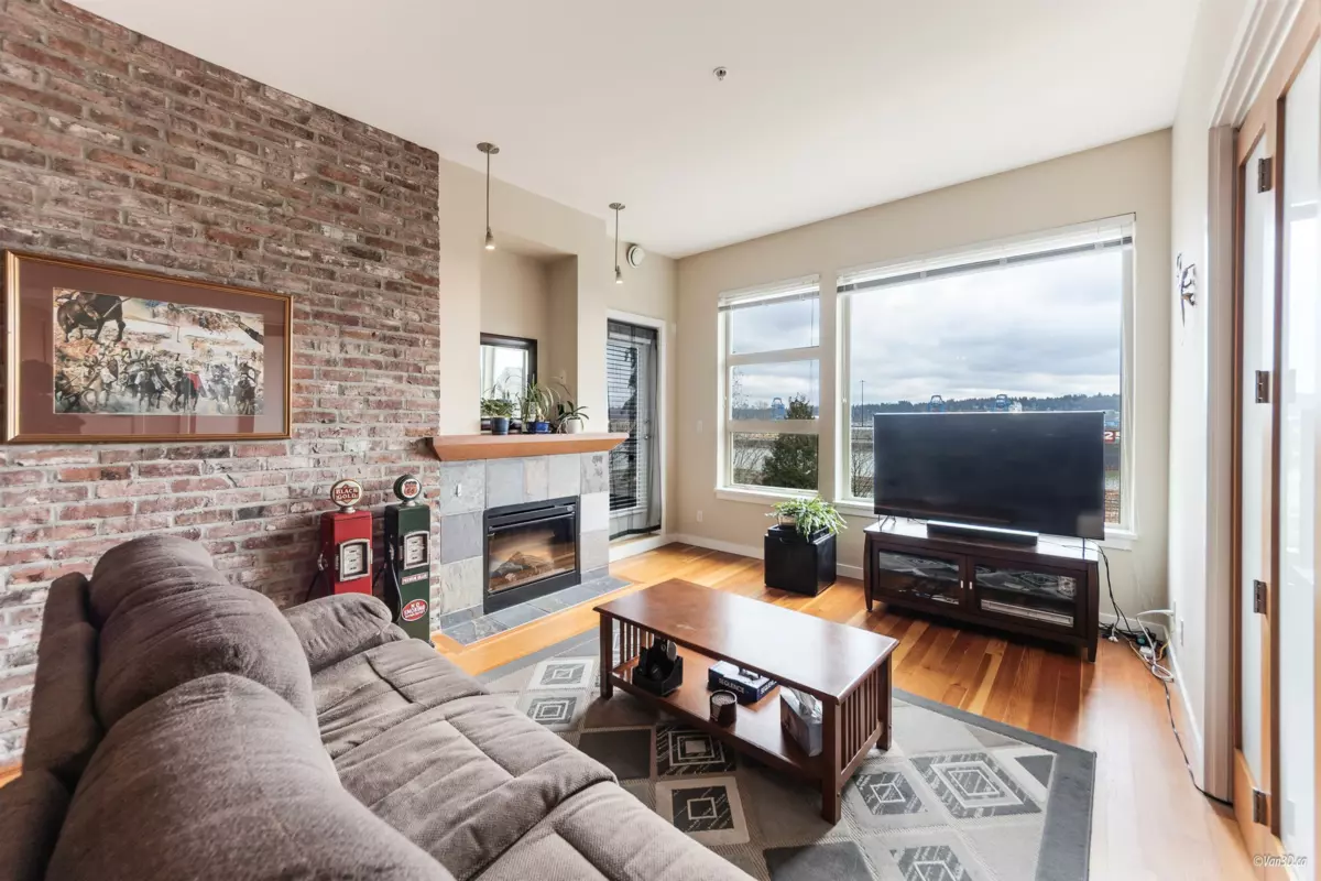 Waterfront living at The Regatta! Spacious 2 bed, 2 bath condo with water views of the Fraser River. Over 1,000 sqft with overheight ceilings, exposed brick & fir floors. Bedrooms on opposite ends, each with walk-in closet & ensuite. Kitchen features S/S appliances, gas range, island, and newer dishwasher. Includes 2 parking + in-suite storage. OPEN HOUSE SUN OCT 5 (2-4PM)