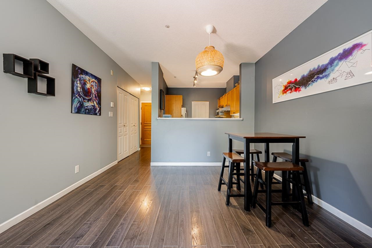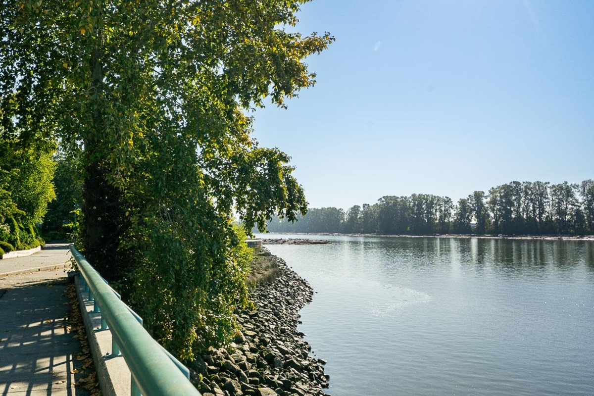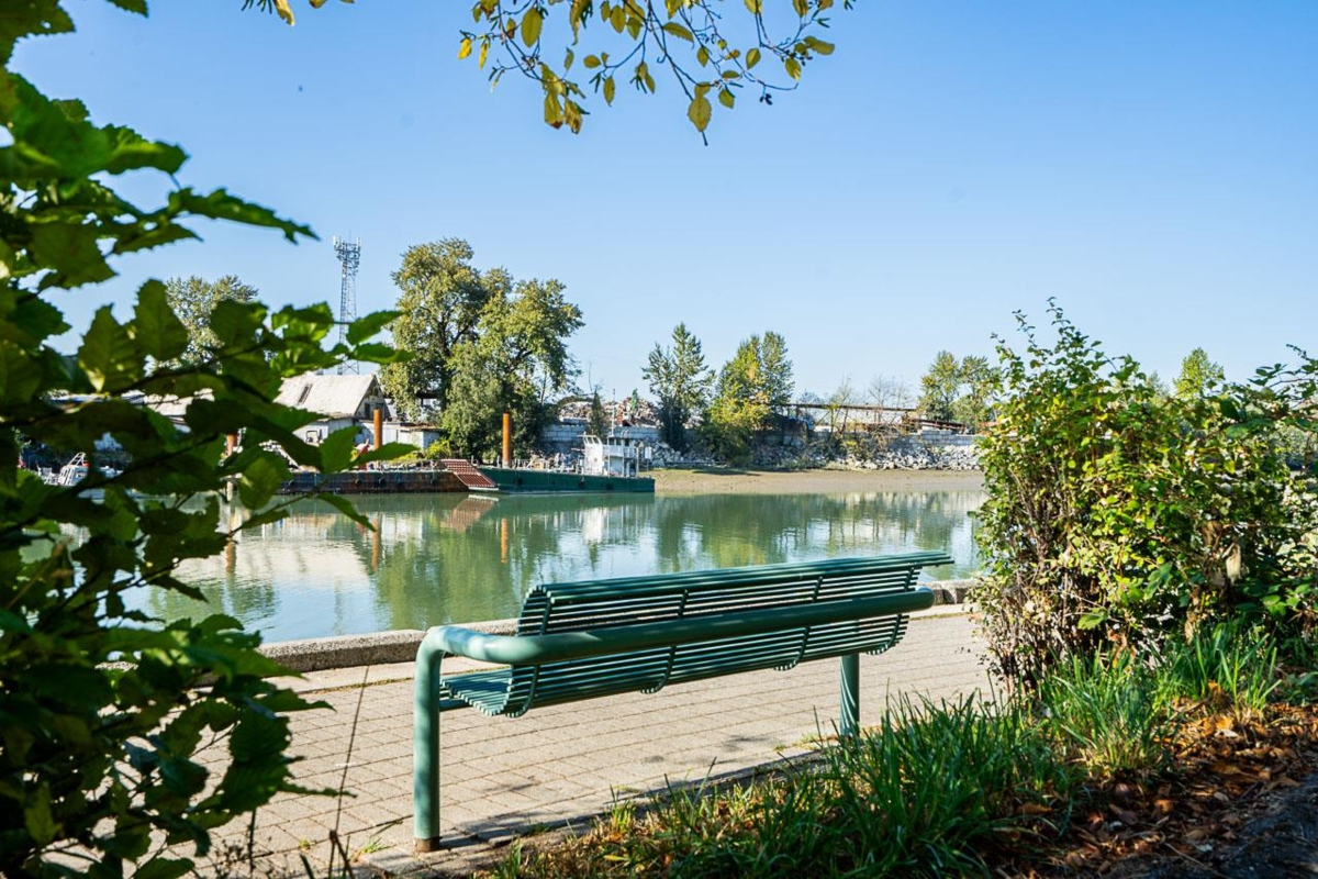 Waterfront Living! Introducing this lovely large 1 bedroom and 1 bathroom condo with private, treed views overlooking the pathway with peek-a-boo views to the Fraser River (more with winter views!). This updated home offers comfortable living with a gas fireplace, in-suite laundry, an open kitchen with pantry, and bedroom with sliding doors to large covered balcony, with walk in closet leading to the bathroom. There are fantastic amenities including a large fitness center with hot tub/balcony upstairs, and party room on main. Two Pets are welcome, 1 parking and bike room. Shopping at River District, Champlain Square, walk the sea walk along Fraser River, or walk to Riverfront Park, while easy access to get to YVR Airport. Great value!