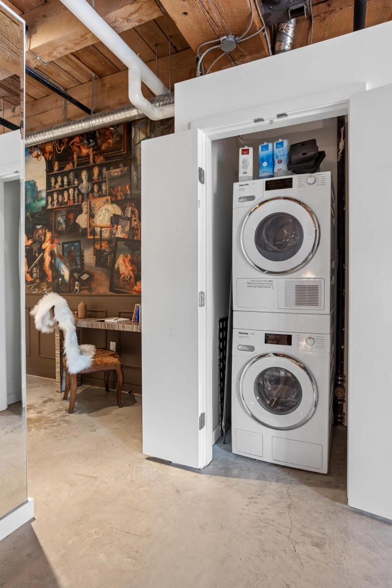 KORET LOFTS – Gastown's iconic live/work warehouse conversion, designed by award winning Yumi Murayama of YU+ME Design Inc. This home boasts a customized renovation. The open concept layout has ample storage, a beautifully crafted kitchen with custom white birch millwork, glass paneling, & marine edged stainless steel countertops & backsplash. The kitchen has top of the line MIELE appliances & a Sub Zero fridge/freezer. The bathroom exudes sophistication with Cosentino Dekton stone countertops from Spain, an angled matching stone sink, a stunning double walk in terrazzo tiled shower, Brizo fixtures, and BOCCI lighting. Cutting edge LED Philips Hue smart lighting creates the perfect ambiance throughout the space. Ideal for live/work or rental opportunities.