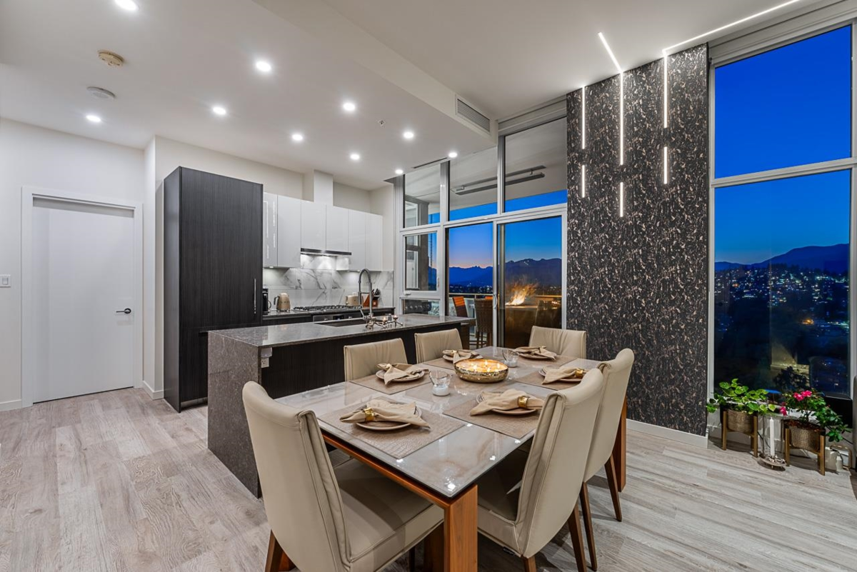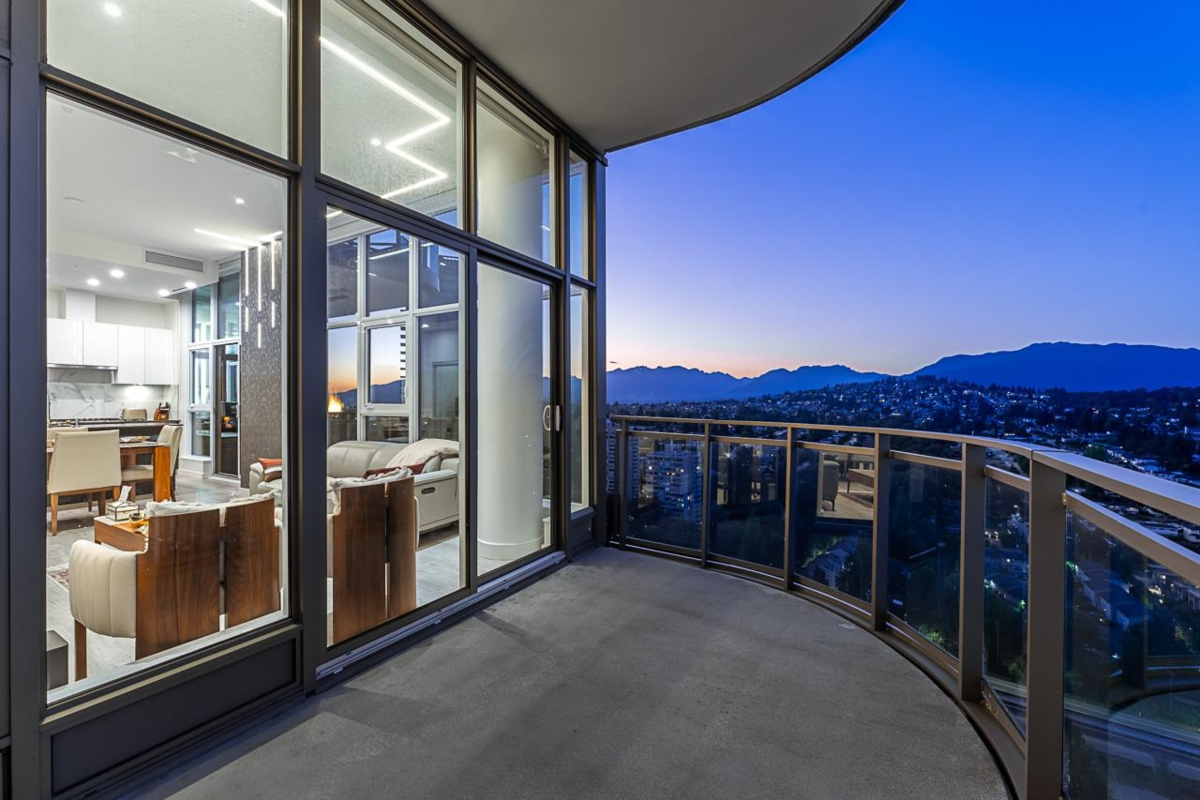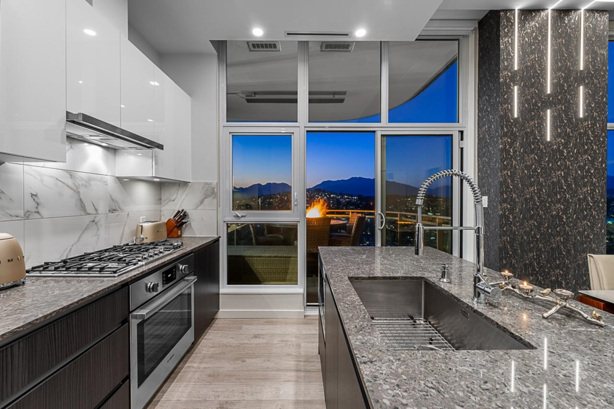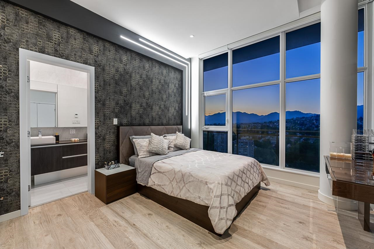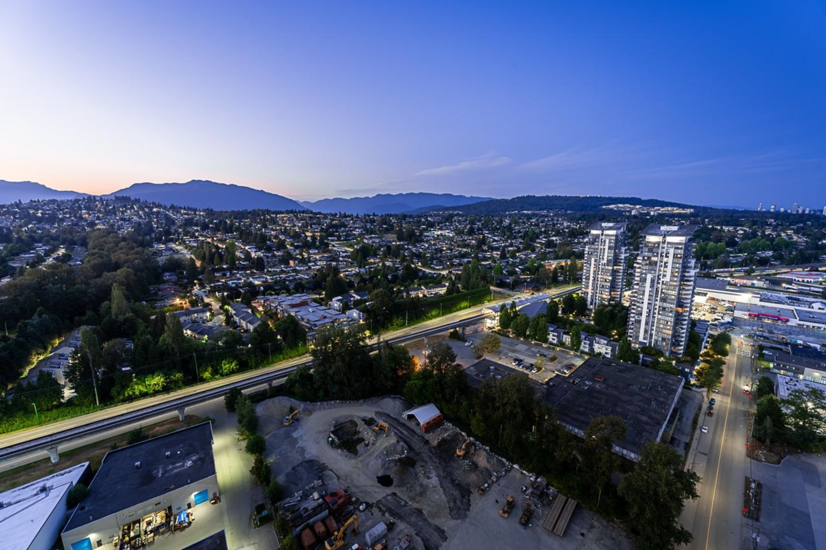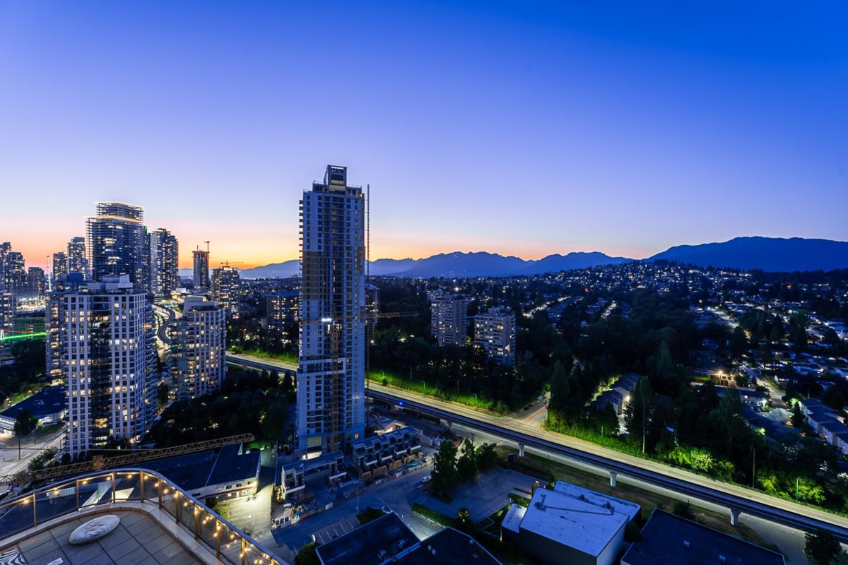 Sophisticated Sub-Penthouse in Brentwood, built by the reputable Millennium Development Corporation with 70 years of experience! This 2 Bed + Large Den NE Corner Unit offers 10’6” ceilings, floor-to-ceiling windows, and panoramic mountain & city views. Enjoy 2 large balconies with over 350 SF, Bosch appliances, and over $20K in custom upgrades: LED lighting, accent wall, pot lights, smart switches, floating media console, designer wallpaper, and custom closet organizer. Spa-inspired ensuite, heat pump A/C, 2 EV-ready side-by-side parking + locker. Resort-style amenities. Steps to SkyTrain & Brentwood Mall.
