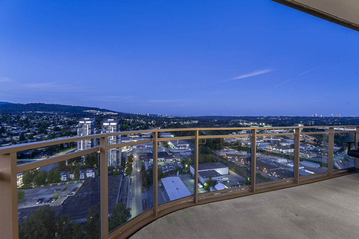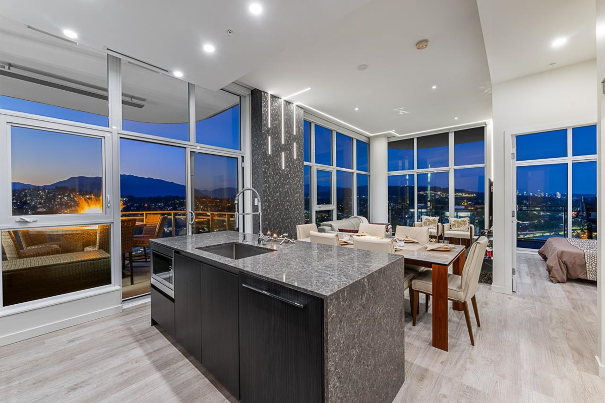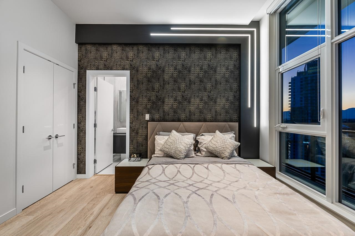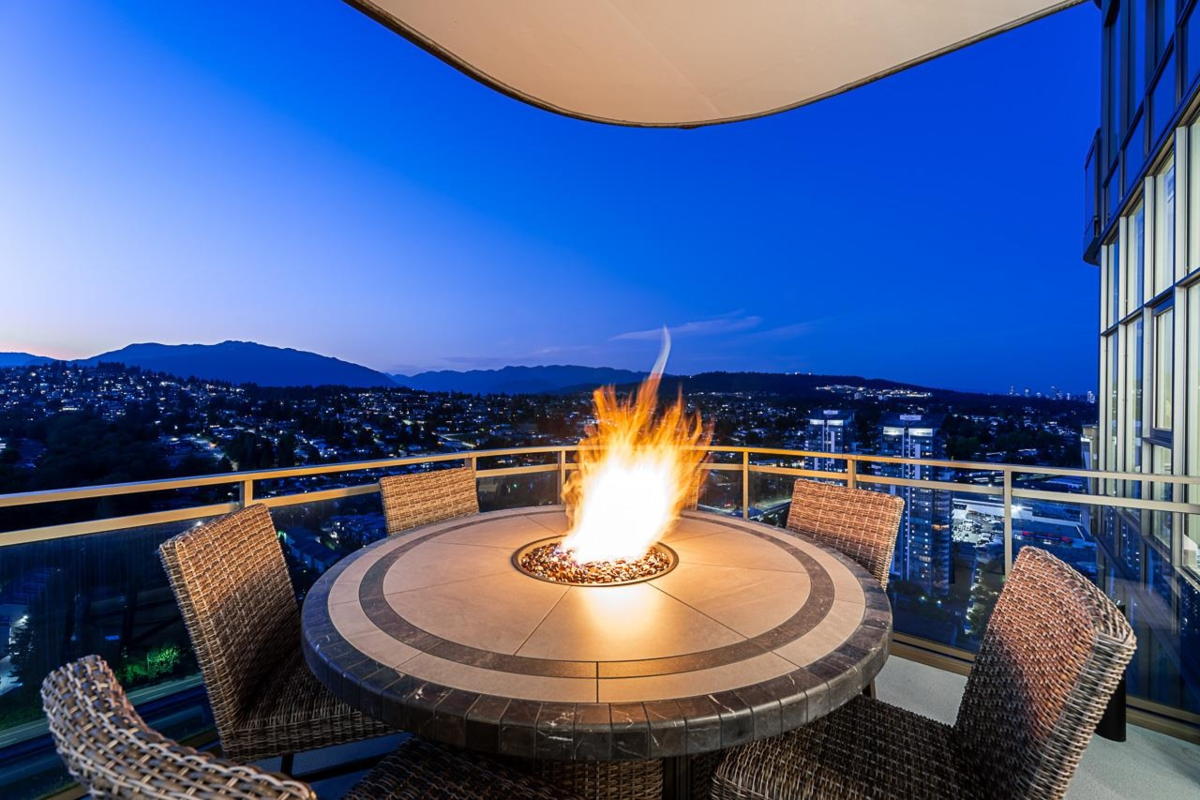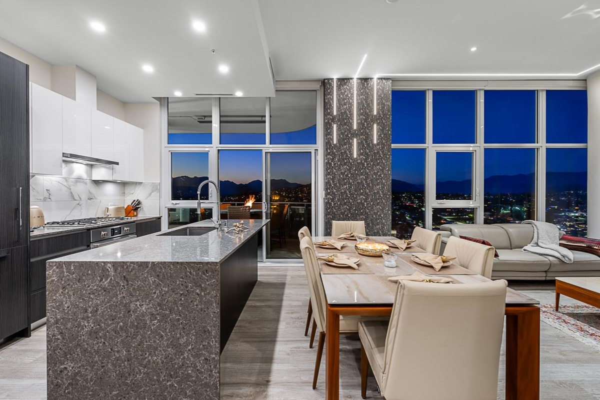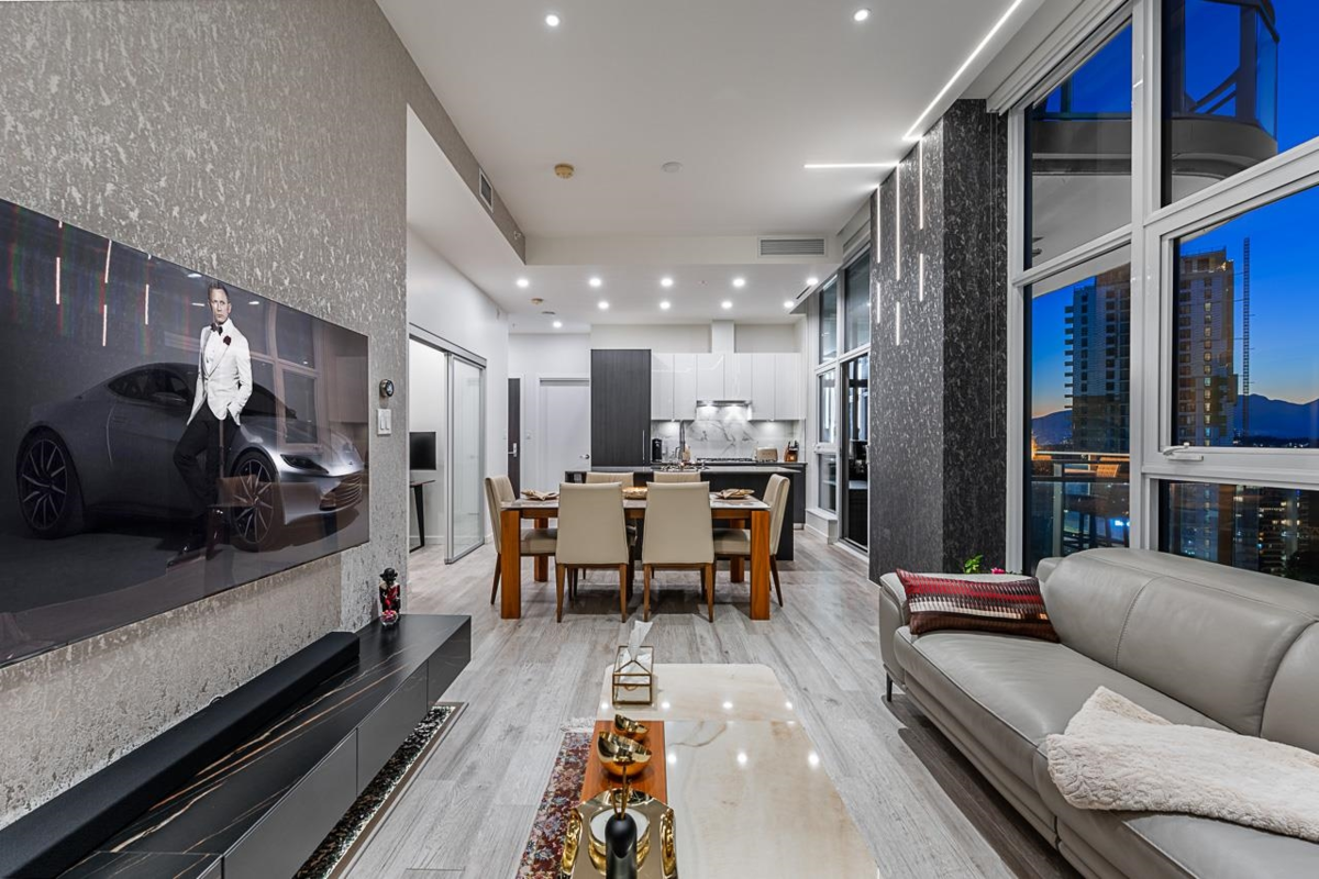 Sophisticated Sub-Penthouse in Brentwood, built by the reputable Millennium Development Corporation with 70 years of experience! This 2 Bed + Large Den NE Corner Unit offers 10’6” ceilings, floor-to-ceiling windows, and panoramic mountain & city views. Enjoy 2 large balconies with over 350 SF, Bosch appliances, and over $20K in custom upgrades: LED lighting, accent wall, pot lights, smart switches, floating media console, designer wallpaper, and custom closet organizer. Spa-inspired ensuite, heat pump A/C, 2 EV-ready side-by-side parking + locker. Resort-style amenities. Steps to SkyTrain & Brentwood Mall.