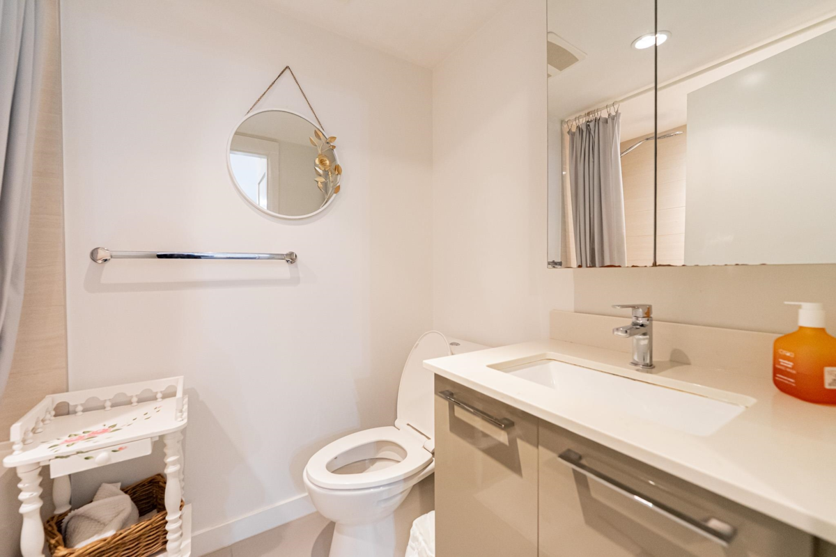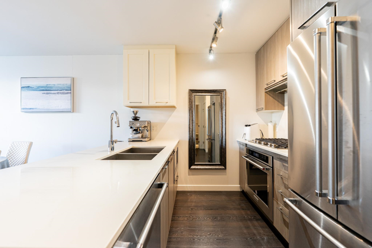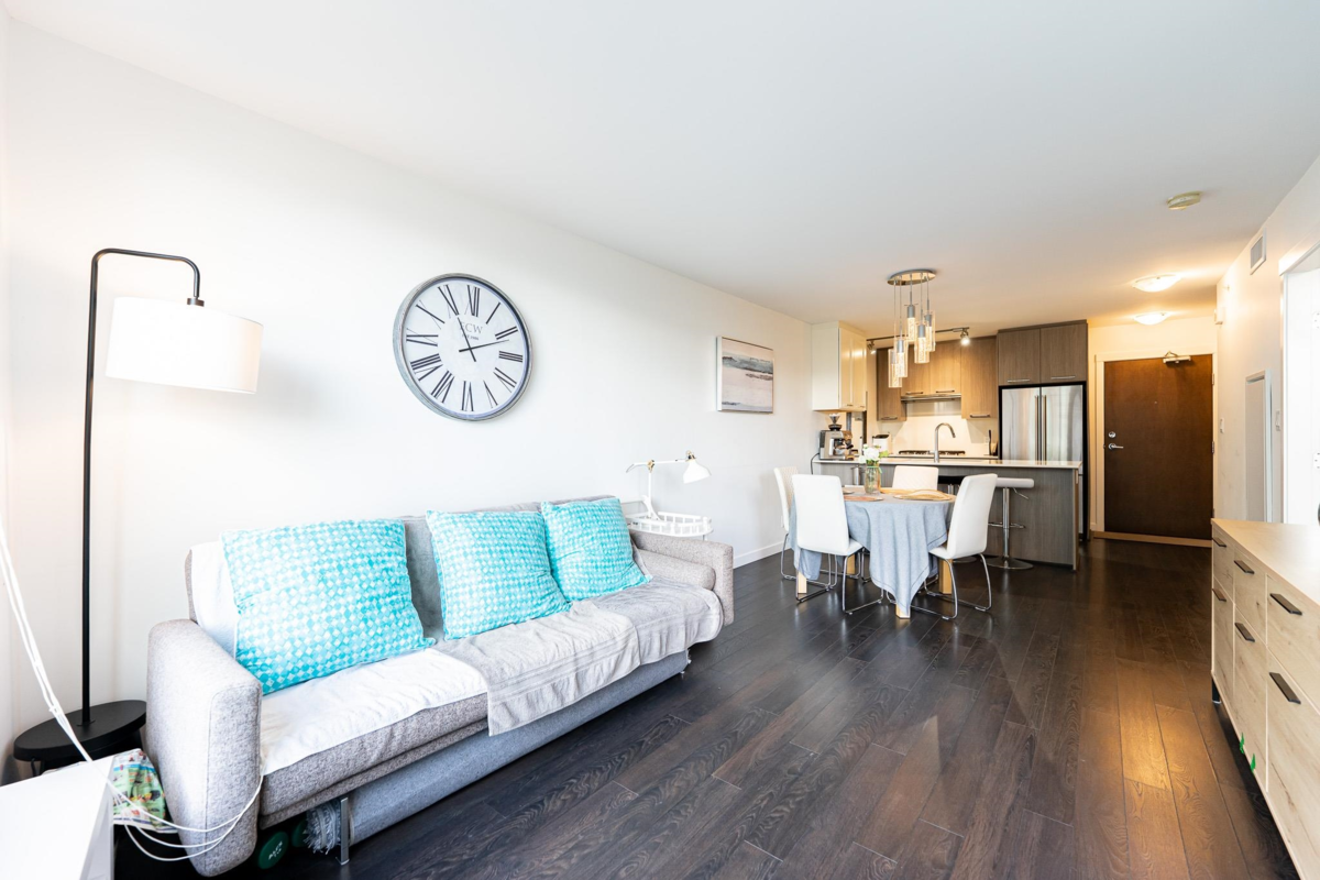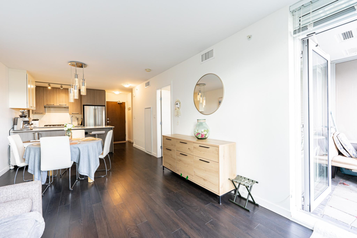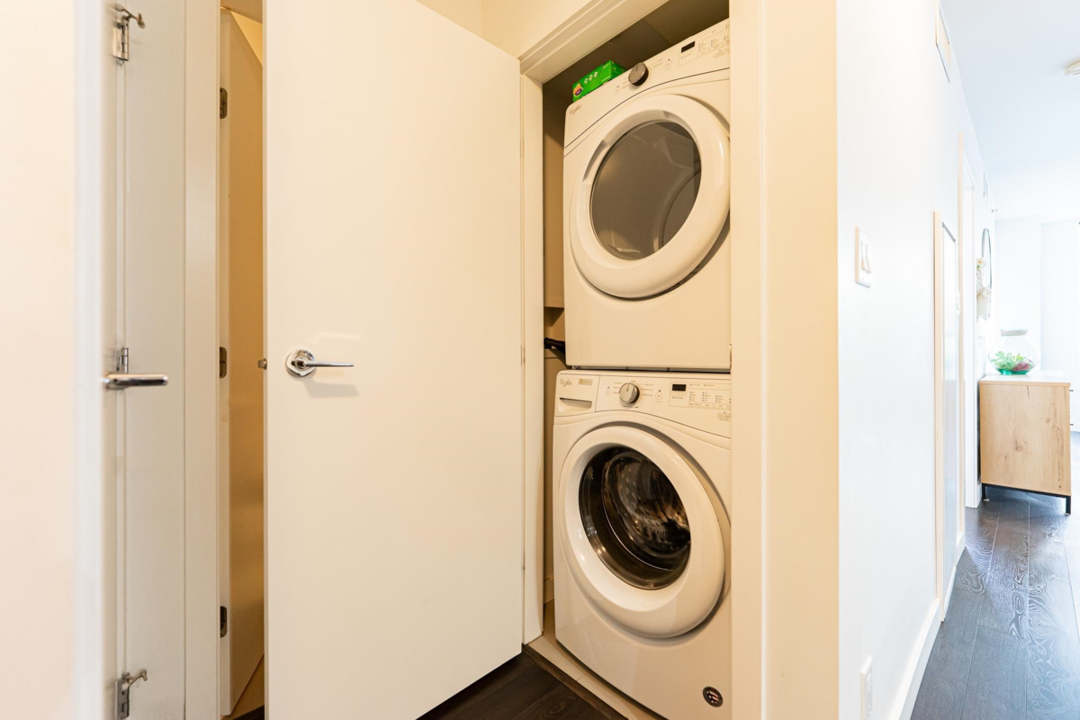 This Air Conditioned, well maintained, South-facing 1 Bedroom & 1 bath concrete home located on the quite inner side of the building. Directly walk-out to the stunning view Rooftop courtyard. It features 567 SF spacious living, open gourmet kitchen, quartz countertops, stainless steel appliances, gas cooktop, laminate floors, in-suite laundry, large walk-in closet and comes with 1 parking and 1 locker. The complex offers excellent amenities including concierge service, an indoor swimming pool, hot tub, gym, recreation centre, dance/yoga studio. Convenient location, steps to Lansdowne Mall/Canada Line Lansdowne Station, Olympic Oval Village, various famous restaurants and other services. An Excellent Choice!