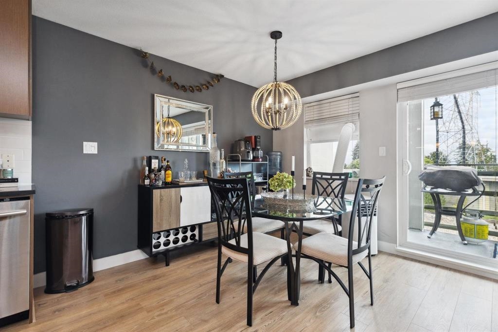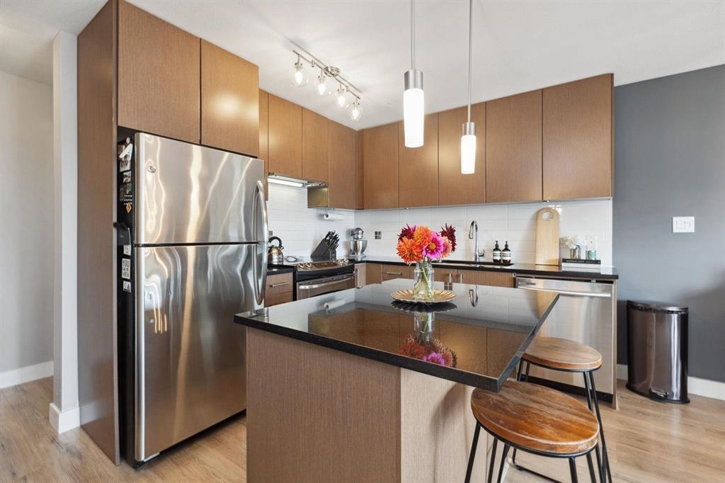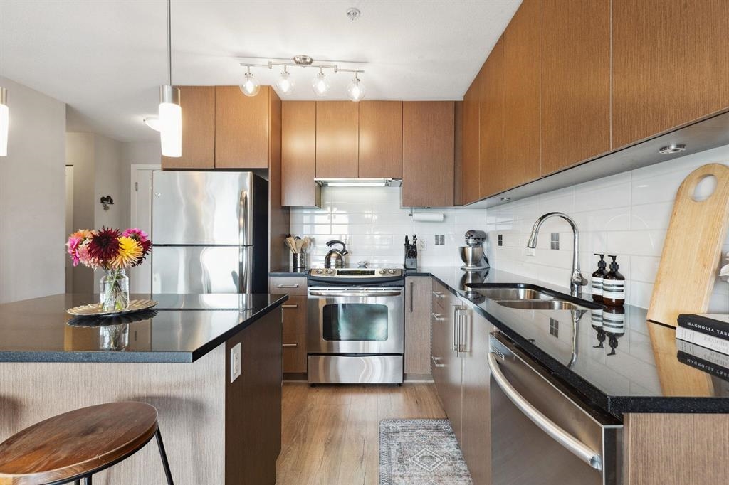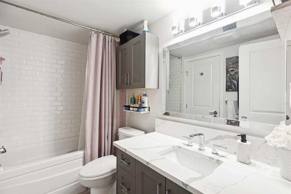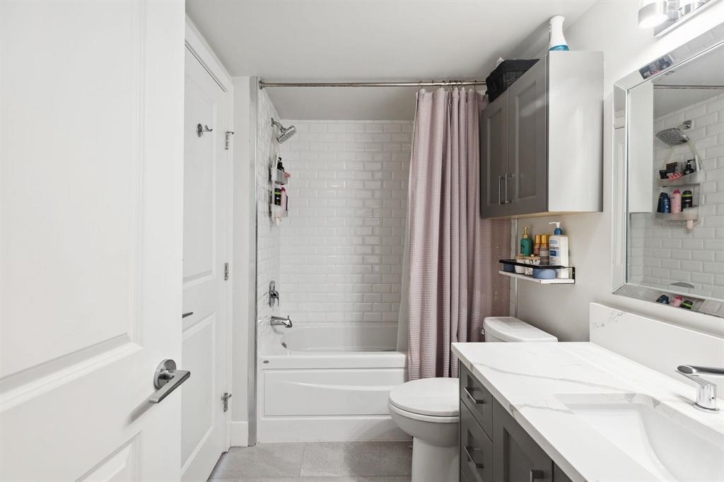 BRIGHT 1 bedroom & den unit has just hit the market and you are not going to want to miss it. Located in the ideal Morgan Crossing area this home offers a superb layout and has been well maintained over the years. Facing north, offering a stunning backdrop of the mountains & is on the quiet side of the building, this is the place you want to call home. This home has undergone an extensive, stunning bathroom renovation with new subway tiles, flooring, vanity/sink and shower head. Along with new laminate flooring throughout & a full size Washer/Dryer & Dishwasher. Enjoy the large eating bar, open floor plan, generous sized windows, ample closet space, granite countertops and upgrades. Your new home is conveniently situated among all "The Shops" that Morgan Crossing offers!