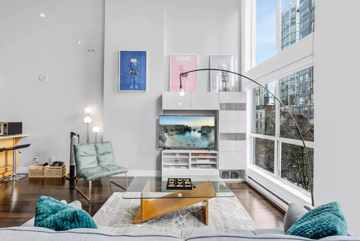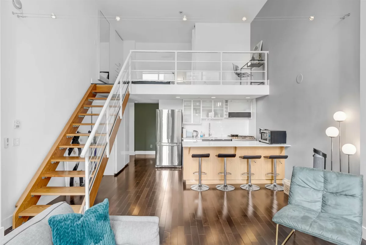 Beautiful loft in THE SPOT building in the heart of downtown. Step into this home featuring soaring double-height ceilings and expansive windows, maximizing bright natural light. The open-concept layout seamlessly connects living, dining, and a sleek, modern kitchen boasting an island with bar seating – ideal for entertaining. Upstairs space features a walk-in closet as well as an area for office set up. The home includes 1 secure parking stall & visitor parking for guests. The building offers a gym & shared rooftop deck w/ a BBQ area and panoramic city views. Shopping and restaurants just steps away. Short term rentals allowed by the building.