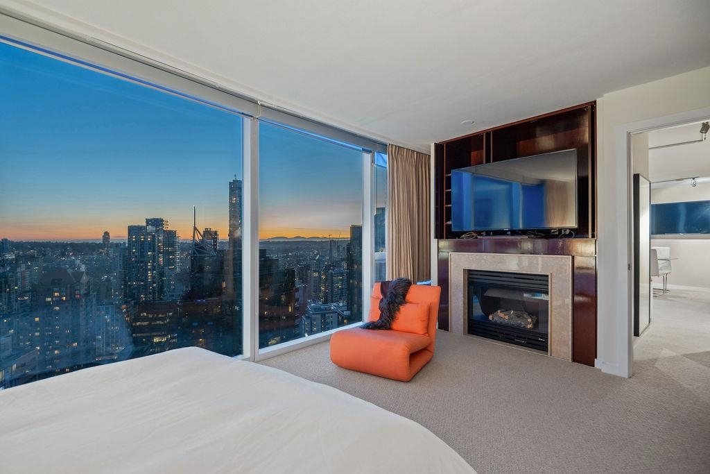 Experience panoramic views of Vancouver's skyline and ocean from this air-conditioned 32nd-floor skyhome spanning 794 sqft with 1.5 bathrooms. Floor-to-ceiling windows flood the space with natural light and frame the breathtaking scenery, while the layout ensures comfort and functionality. The expansive primary bedroom is a private sanctuary featuring mesmerizing city views, a cozy gas fireplace, and a luxurious ensuite with a soaking tub and separate shower. Residents enjoy exclusive access to premium amenities, including a fitness centre, indoor pool, housekeeping, room service, and 24-hour concierge. Step outside and find Vancouver's finest dining, shopping, and entertainment just moments from the lobby. This exceptional home is complete with two EV-ready parking stalls. OPEN Sat 2-4pm
