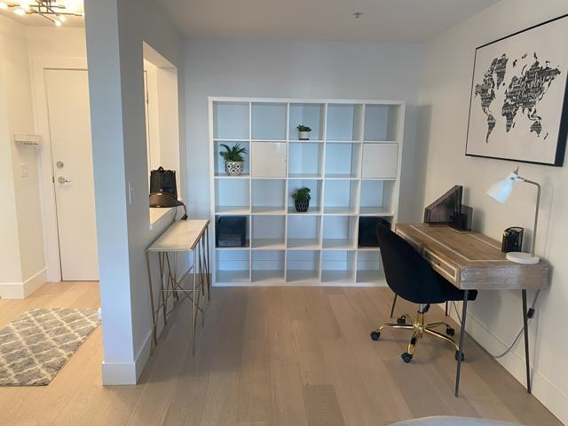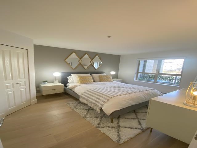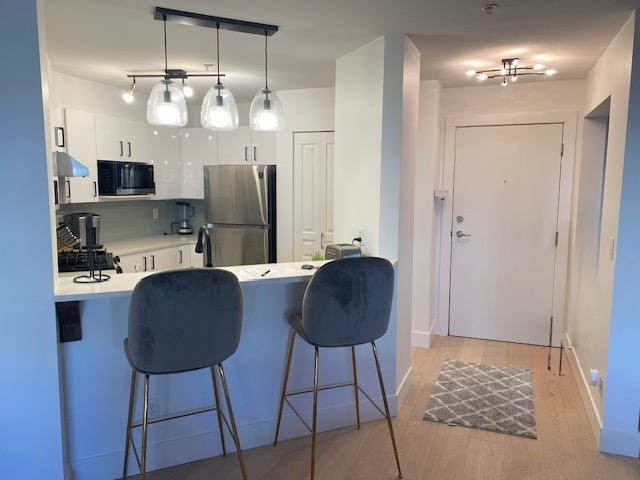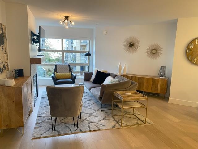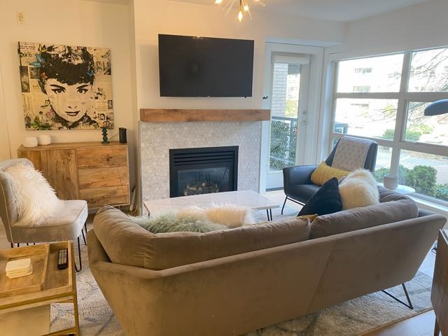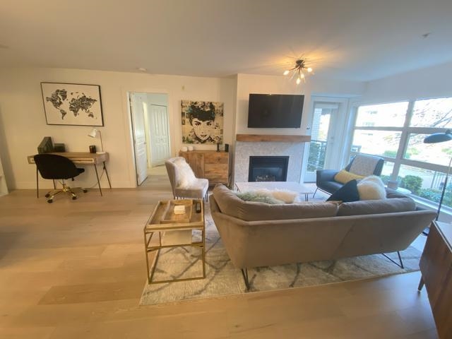 Welcome to HARMONY by Polygon! This Beautifully updated 705 sqft residence offers the perfect blend of style, comfort, and convenience. Features: Open Concept Layout, 1 Large Bedroom with Walk-In Closet & 4 pc Ensuite + Den. Updates include: Elegant Hardwood Flooring, Refreshed Kitchen w Quartz Counter Tops (Kitchen/Bathroom), Stylish Tiled Backsplash, White Cabinetry, Fresh Paint. Fireplace with Designer Tile & Custom Wood Mantel. New Blinds (Living Room & Bedroom) + New Washer/Dryer. Prime Location just Steps to Shops, Restaurants, Parks, Walking/Hiking/Bike Trails and the vibrant #1 Canadian Comprehensive University* SFU. Quick 11 min drive to Lougheed Shopping Centre or Burnaby Mountain Golf Course. Amenities include a well equipped gym, meeting room, bike storage & guest parking.