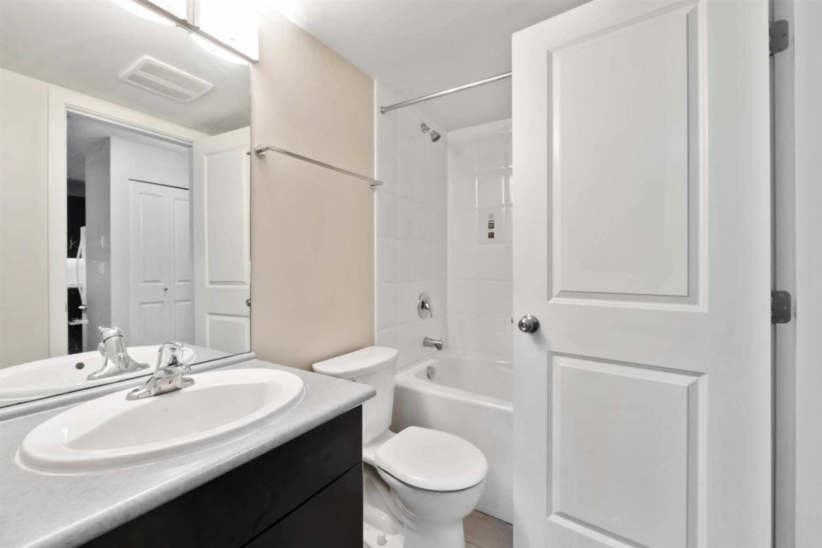 Ready for you to move in!!! Welcome to Access, a desirable community with beautifully landscaped green spaces & tree lined street. This one bedroom home is meticulously maintained and cared for. Open concept living with cozy electric fireplace and access to your deck with a view of the green space. Kitchen has plenty of storage and counter space including an eating bar and center island. Large windows provide lots of natural light. Close to Gateway Skytrain station, shopping & restaurants. Fantastic amenities room with fireplace and seating in the common area/party room, fully equipped exercise room, whirlpool & sauna. Perfect for your downtown commute or for a student at SFU, KPU or Douglas College. 1 parking & Locker