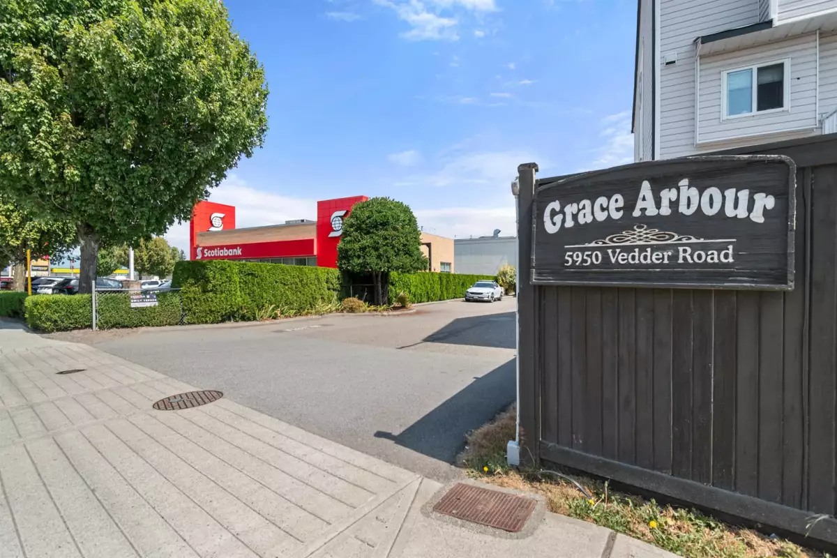 Superb location! Minutes from shopping, recreation, transit, schools, parks, and amenities. This 3-story townhouse features an attached garage, 3-level, add'l parking, and a fenced yard. The expansive LR showcases a gas fireplace, and the kitchen balcony provides views of the mountains and city. The 2021 renovations included updated kitchen cabinets, quartz countertops, new backsplash, flooring, stainless steel appliances, new lighting, updated bathrooms, customized closet, and a spacious walk-in closet in Primary BR. A rare opportunity to own a well loved and well maintained Sardis townhouse at Grace Arbour, ideal for families or investors seeking a turn-key property. Schedule a showing to experience its excellence. Roof replacement levy is being paid with 4 months left.