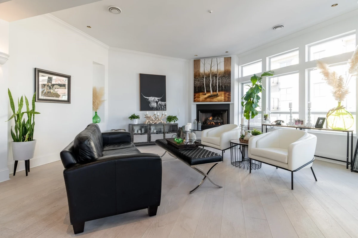 Great opportunity @ James Court! This executive PENTHOUSE features 2 bedrooms, 2.5 bathrooms, den & office in 2185 sqft. with panoramic views, overlooking Douglas Park. This home shares no walls, offering privacy, security, and over 2000 sq.ft. of balcony. There are many quality features including, 2 gas fireplaces, expansive windows providing natural light, hardwood flooring, 2 ensuites, wet bar, 9, 10, and 13 ft ceilings, A/C & much more. The master bedroom includes a lounge, spa like ensuite, and walk in closet. Fabulous kitchen with new granite counters, cupboard facings, white cabinetry, stainless appliances. 4 parking stalls in a pet friendly building only 1 block from the planned skytrain station. NO age restriction. CENTRAL LOCATION!