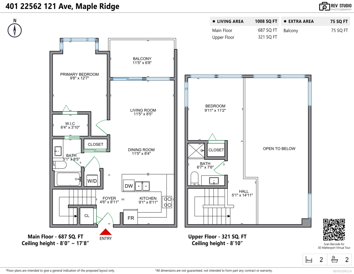 Loft unit, 2 bedrooms, 2 full bath. North facing, top floor, on a quiet inside street, A functional layout, 2 spacious bedrooms, 1 on loft area in an open area bedroom and 1 on main floor. Loft open space could be used as bedroom, exercise area, home office. Ample of natural sunlight all year long. Mountain view on balcony. Substantial renovation in 2025. Brand new appliances, kitchen cabinet. Close proximity to WCE, library, elementary school, recreational center, golf park, shopping area to do your food shopping, banking and all other daily necessity.