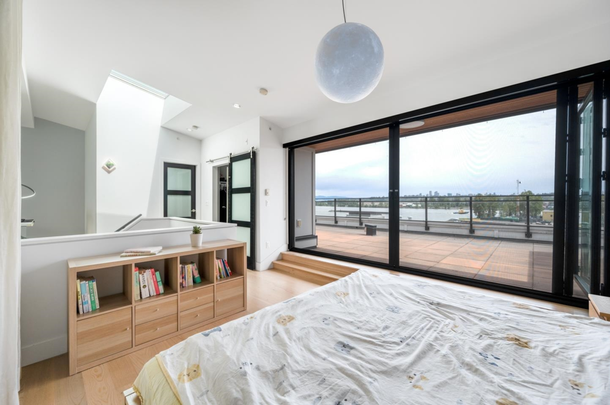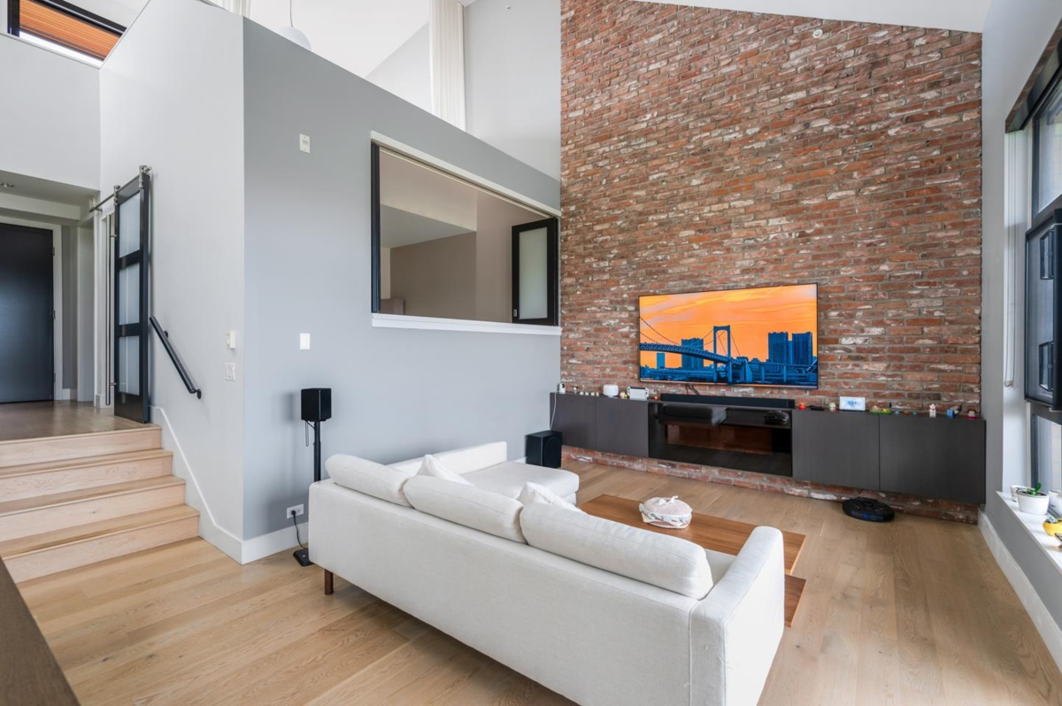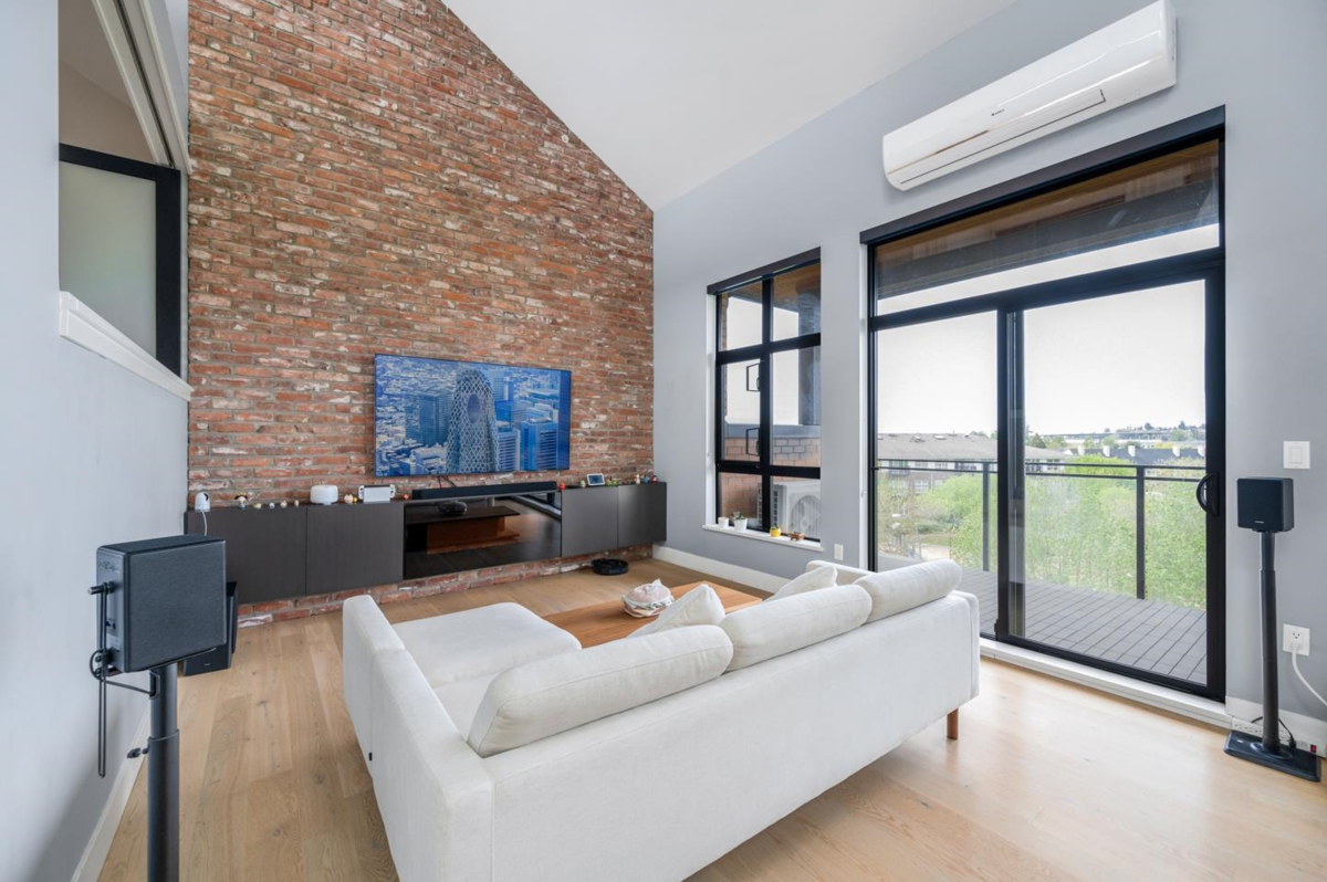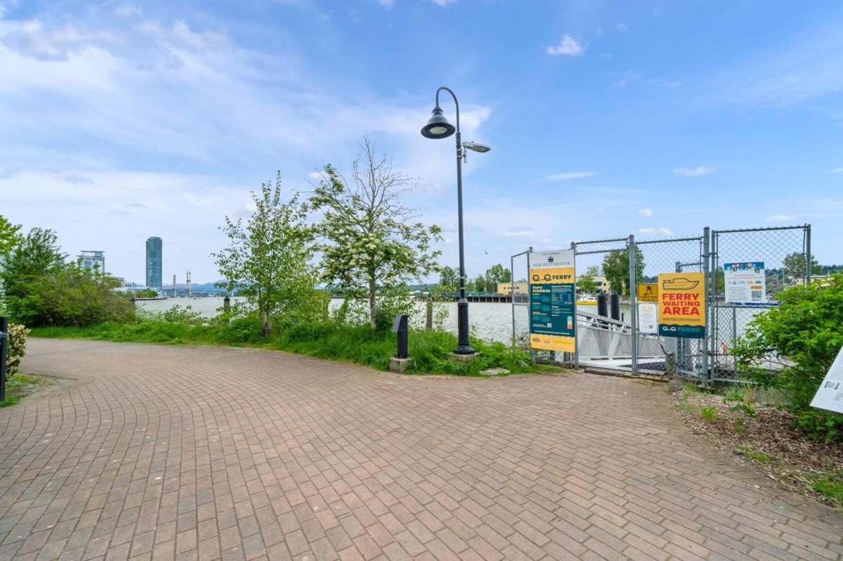 This rarely available penthouse offers a unique blend of modern elegance and urban charm. Featuring 2 bedrooms plus a loft (serve as the master bedroom), this residence boasts 20 ft ceilings, a stunning reclaimed brick feature wall, and an open concept kitchen equipped with quartz countertops and s/s appliances. The spacious dining/living room area provides the perfect setting for entertaining guests. The loft opens up to a magnificent 500 sqf rooftop patio, where you can enjoy mesmerizing water, mountain, and city views. With two parking stalls (one with EV charging rough-in) and one storage locker included, convenience is at your fingertips. Located steps away from the riverfront promenade and the Q2Q ferry, this penthouse offers unparalleled access to the best of New Westminster living.