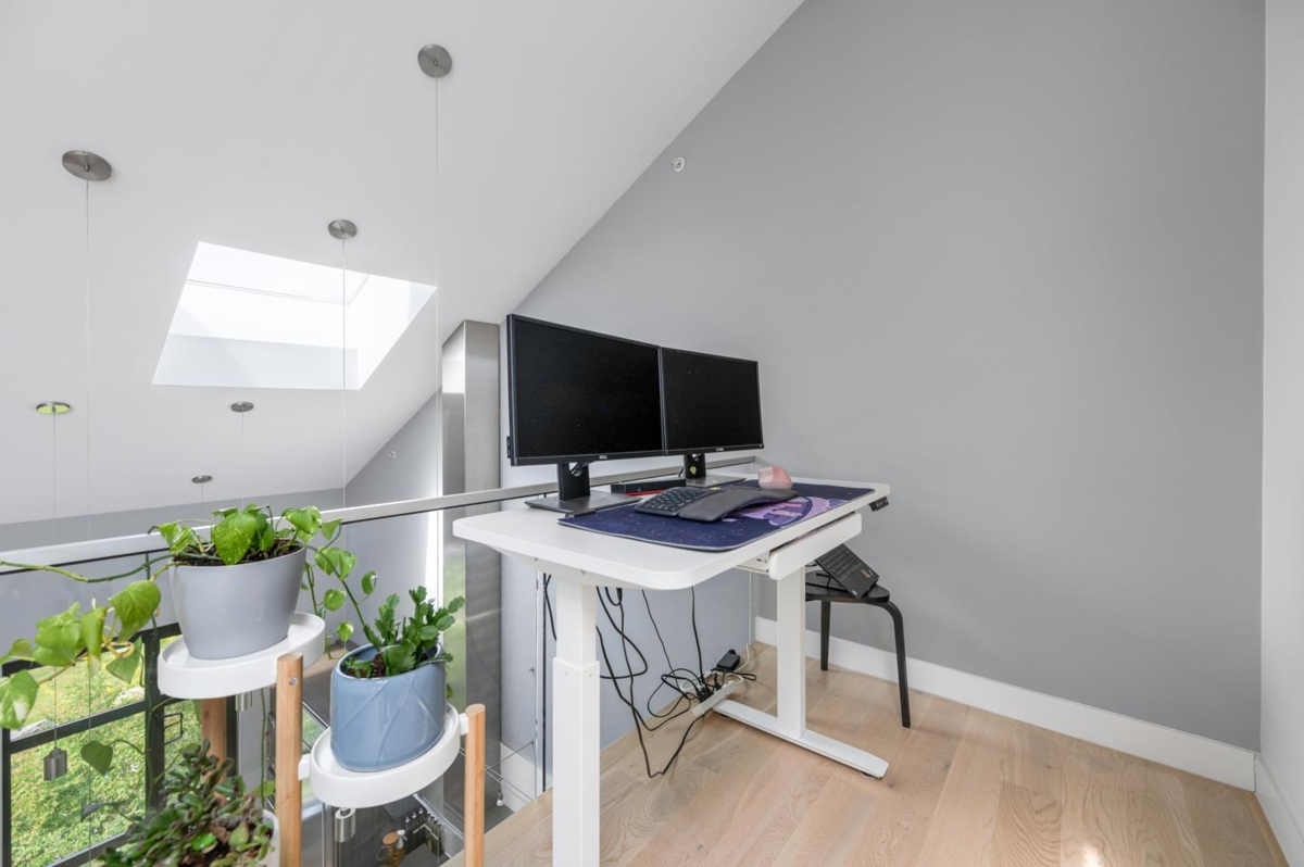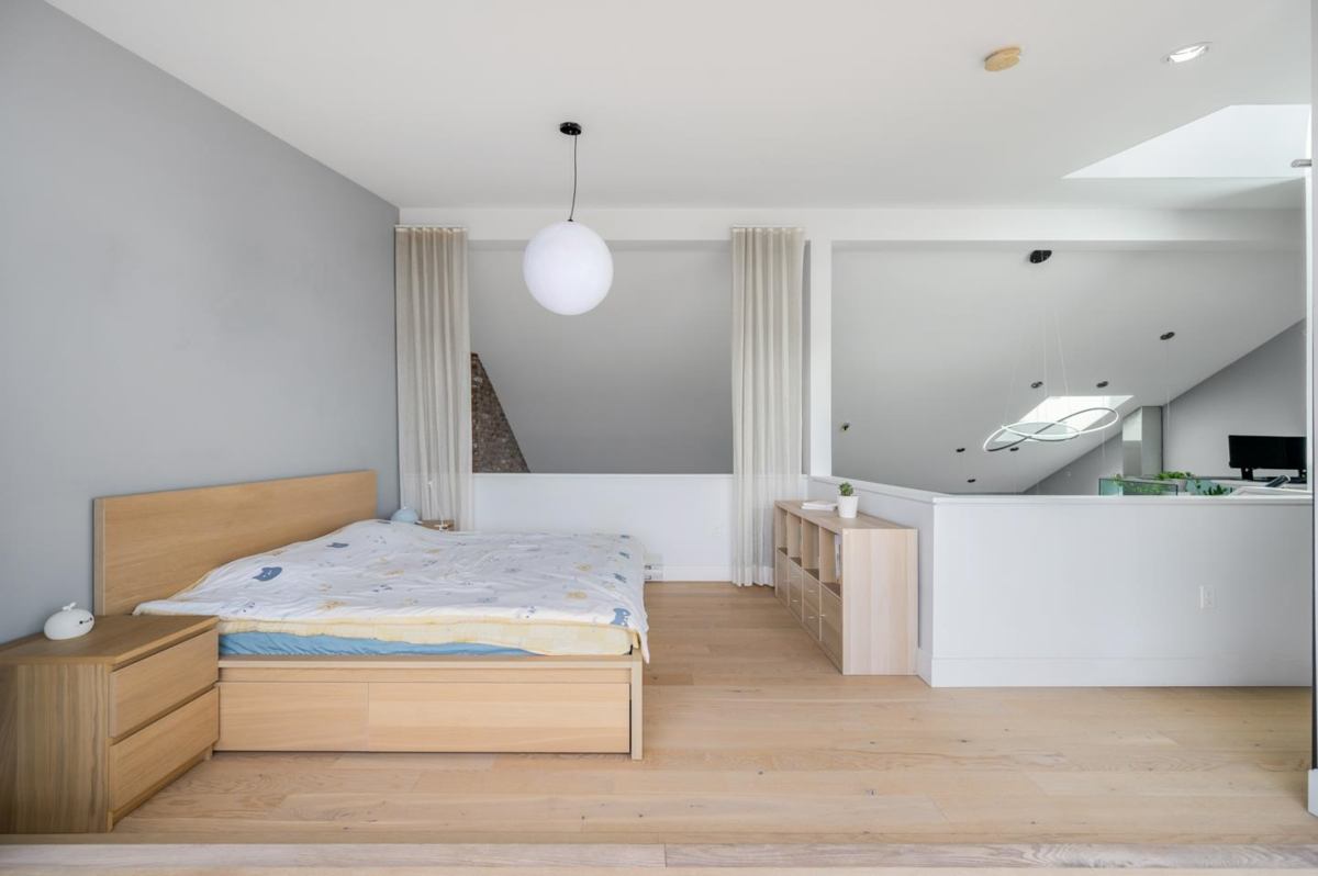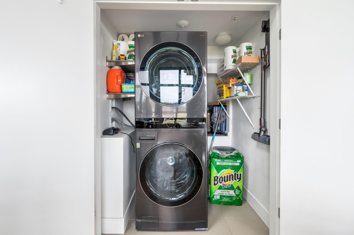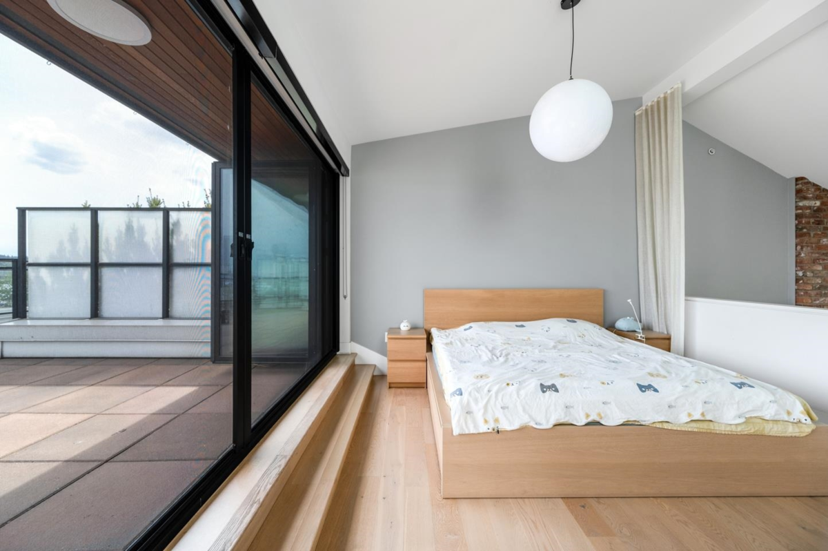 This rarely available penthouse offers a unique blend of modern elegance and urban charm. Featuring 2 bedrooms plus a loft (serve as the master bedroom), this residence boasts 20 ft ceilings, a stunning reclaimed brick feature wall, and an open concept kitchen equipped with quartz countertops and s/s appliances. The spacious dining/living room area provides the perfect setting for entertaining guests. The loft opens up to a magnificent 500 sqf rooftop patio, where you can enjoy mesmerizing water, mountain, and city views. With two parking stalls (one with EV charging rough-in) and one storage locker included, convenience is at your fingertips. Located steps away from the riverfront promenade and the Q2Q ferry, this penthouse offers unparalleled access to the best of New Westminster living.