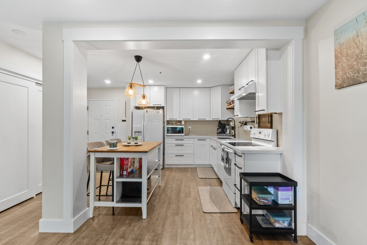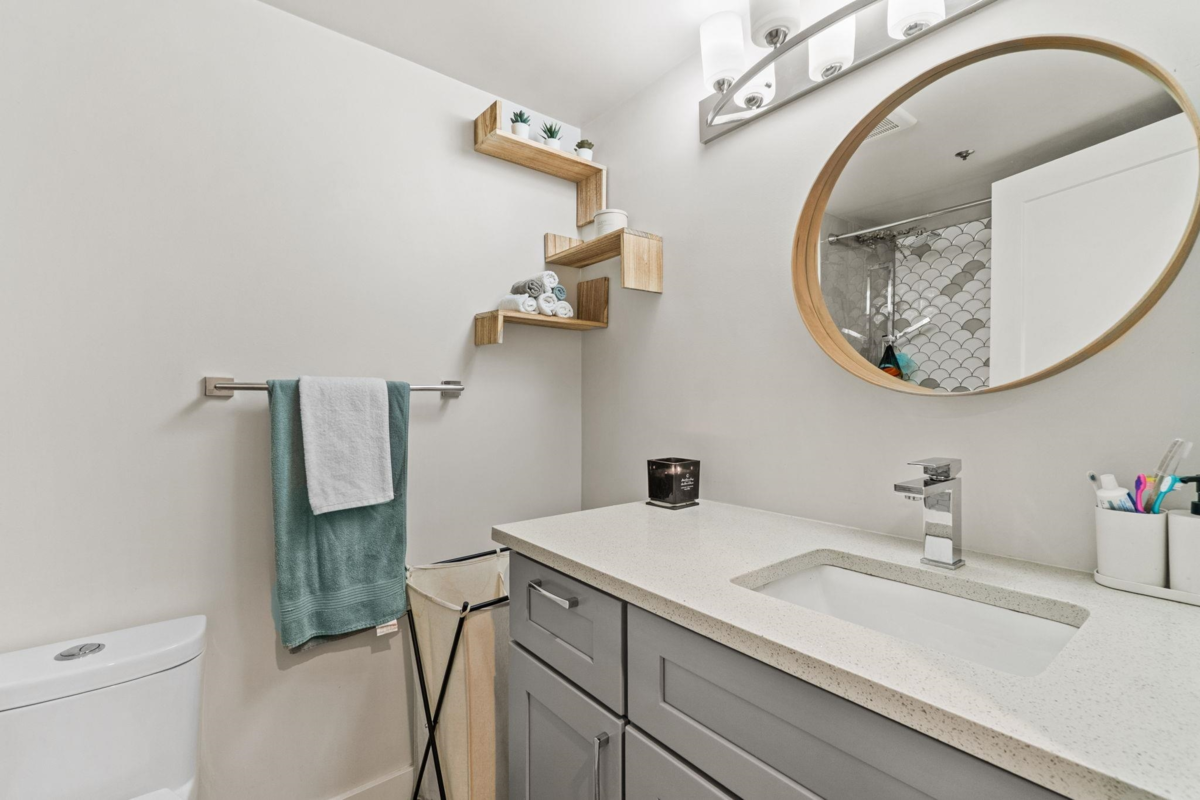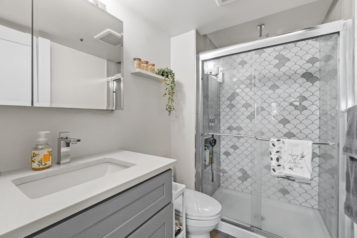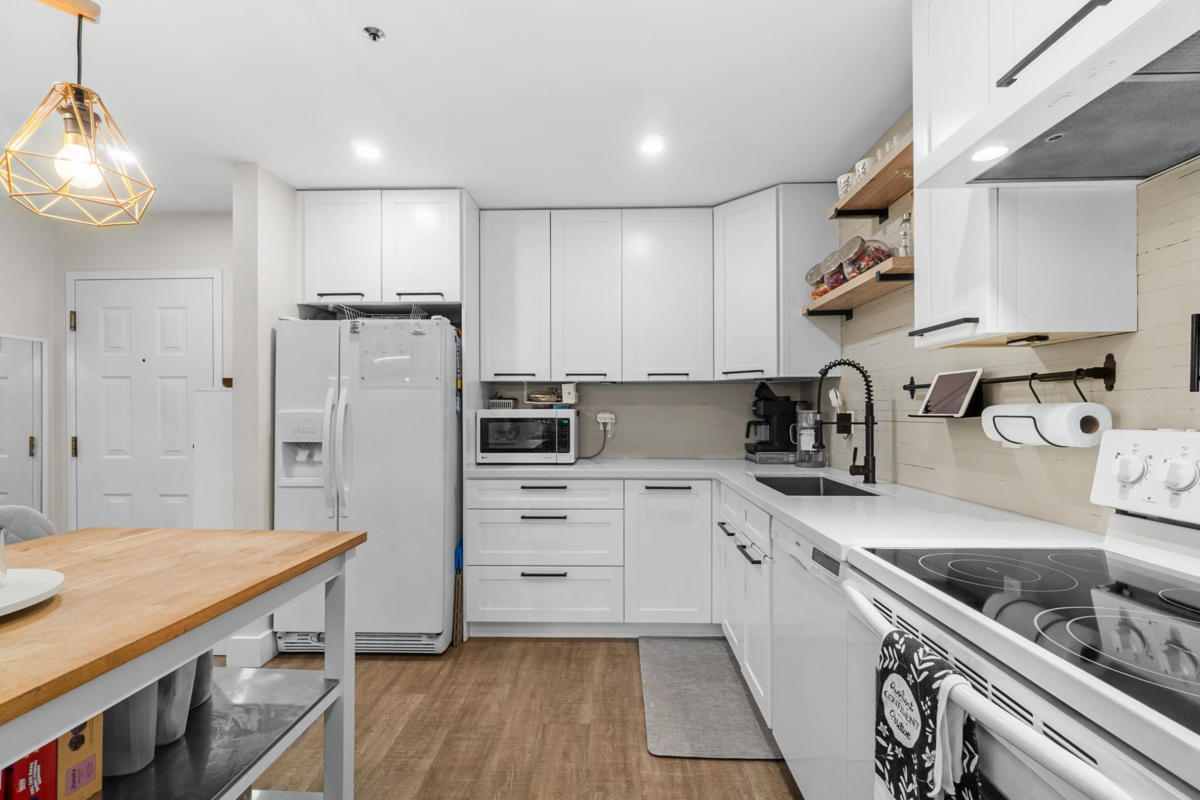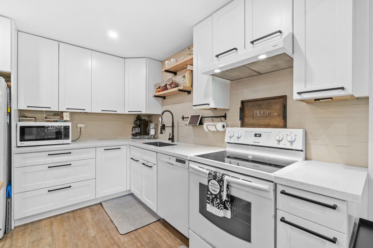 Nicely renovated 2 bedroom & 2 bathroom condo in great New Westminster location . Open, spacious & bright floor plan enhanced with quality upgrades .You will definitely be impressed by the beautiful kitchen featuring quartz counters.The bathrooms have high end finishes and quality fixtures. The home has Polk Audio in ceiling speakers and LED light throughout. Primary bedroom is generously sized and will easily accommodate a king size bed & additional furniture . S/E east facing covered balcony facing into mature tree tops for privacy.As a bonus there is a large laundry room with additional storage space . Well managed building with newer balconies & new elevator . One parking & storage locker included . Short walk to Skytrain & Douglas College.
