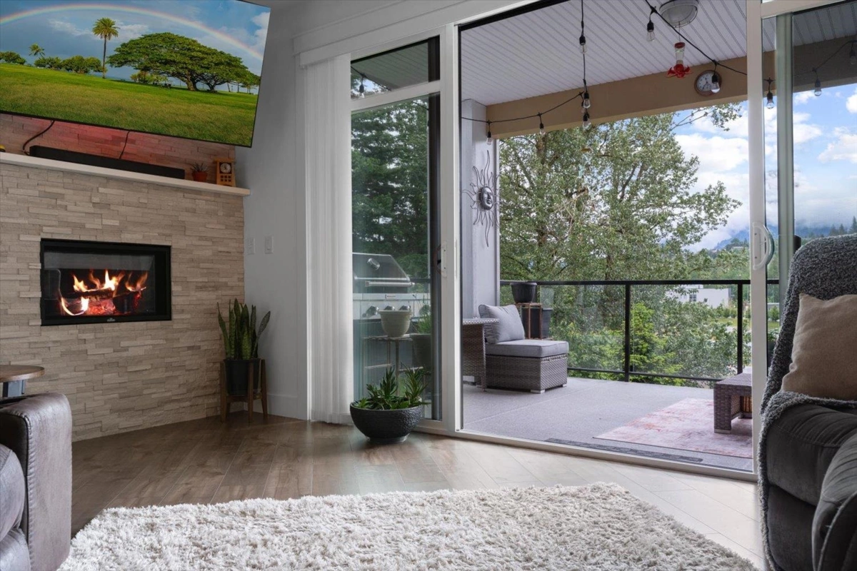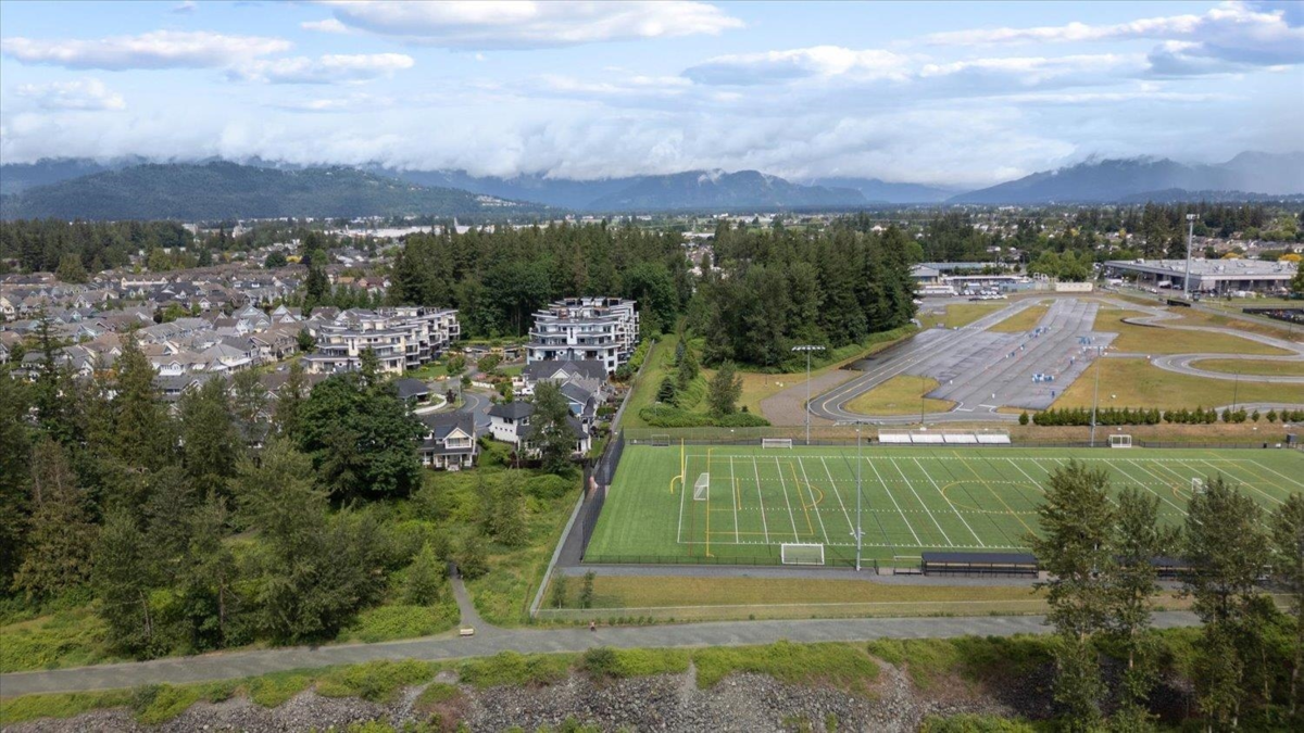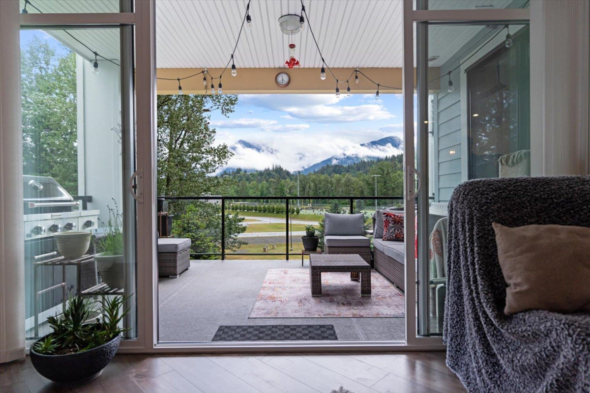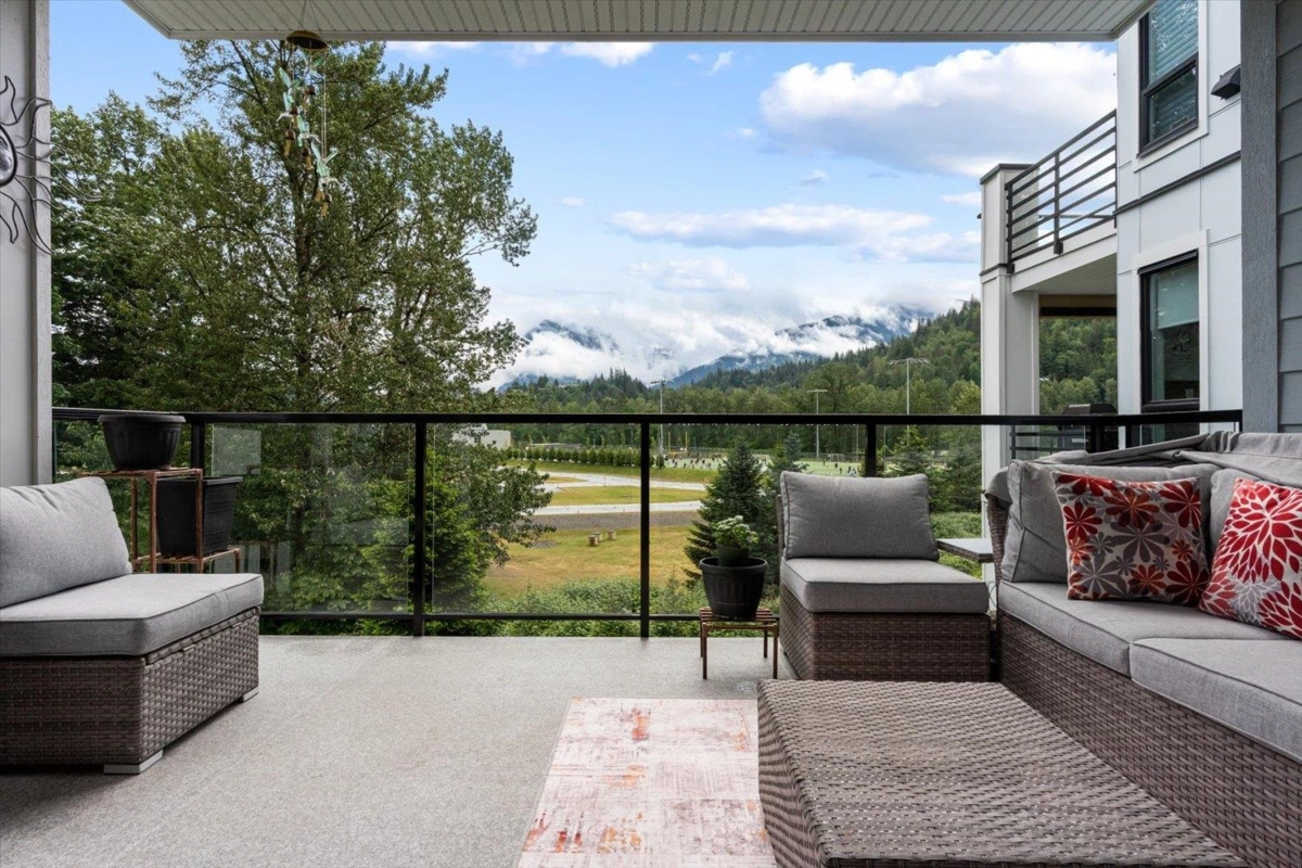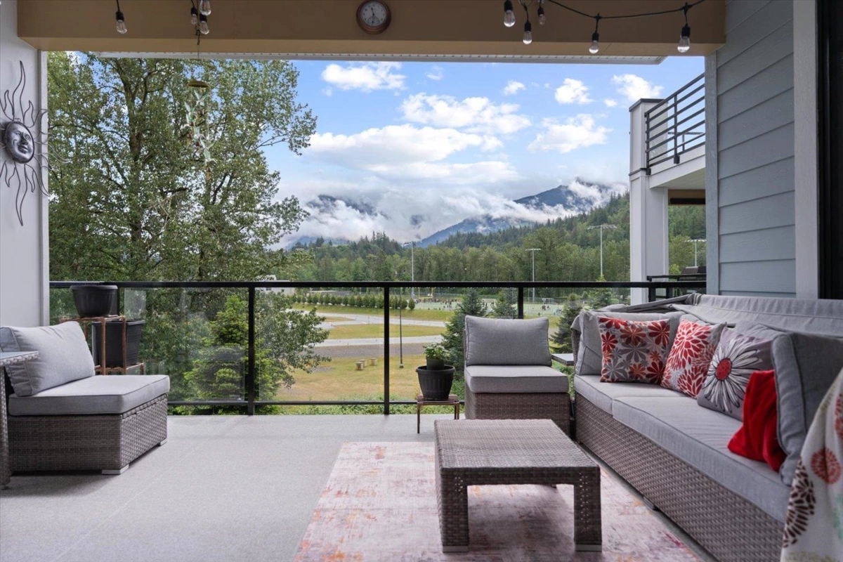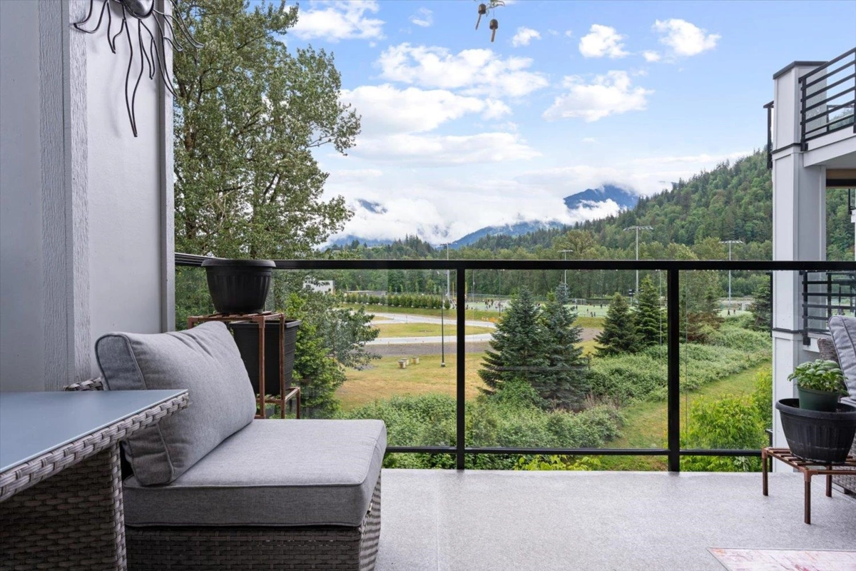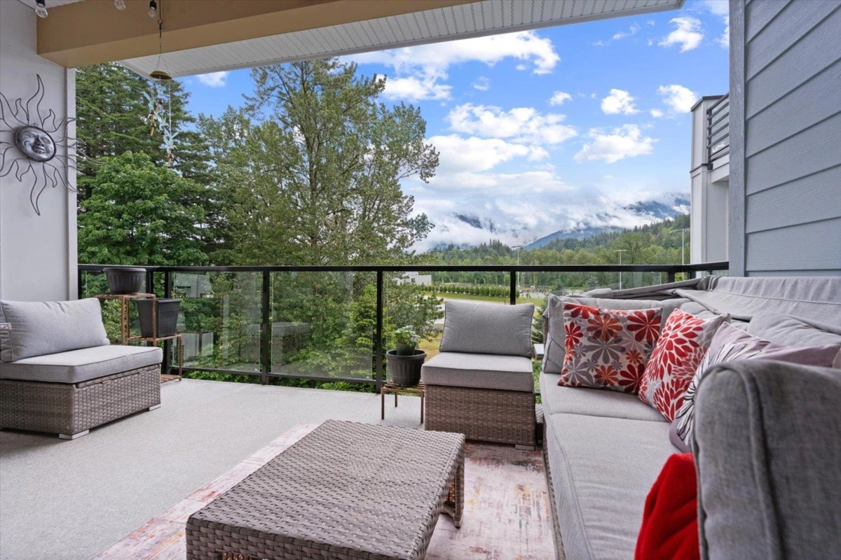 PRIME REAL ESTATE OPPORTUNITY! Live or invest in one of the most desirable locations steps from the Rotary Trail, Vedder River & Garrison Crossing! This modern & spacious like-new 1 bdrm condo features an open-concept layout & a stunning gourmet kitchen equipped w/ KitchenAid Black Stainless appliances, gas stove, subway tile backsplash, quartz counters, soft-close cabinetry & under-cabinet lighting. Bdrm has huge luxury ensuite w/ a soaker tub, frameless glass shower & double sinks plus w/i closet & custom shelving. Addt features incl a/c in the living room & bedroom, a large semi-private covered patio w/ a million-dollar mountain views, 1 secured underground parking stall & a large storage unit. Beautiful finishes, low strata fees & pet-friendly bylaws make this condo a win! Call today!
