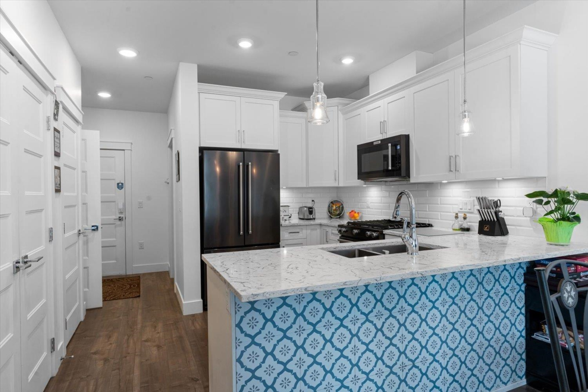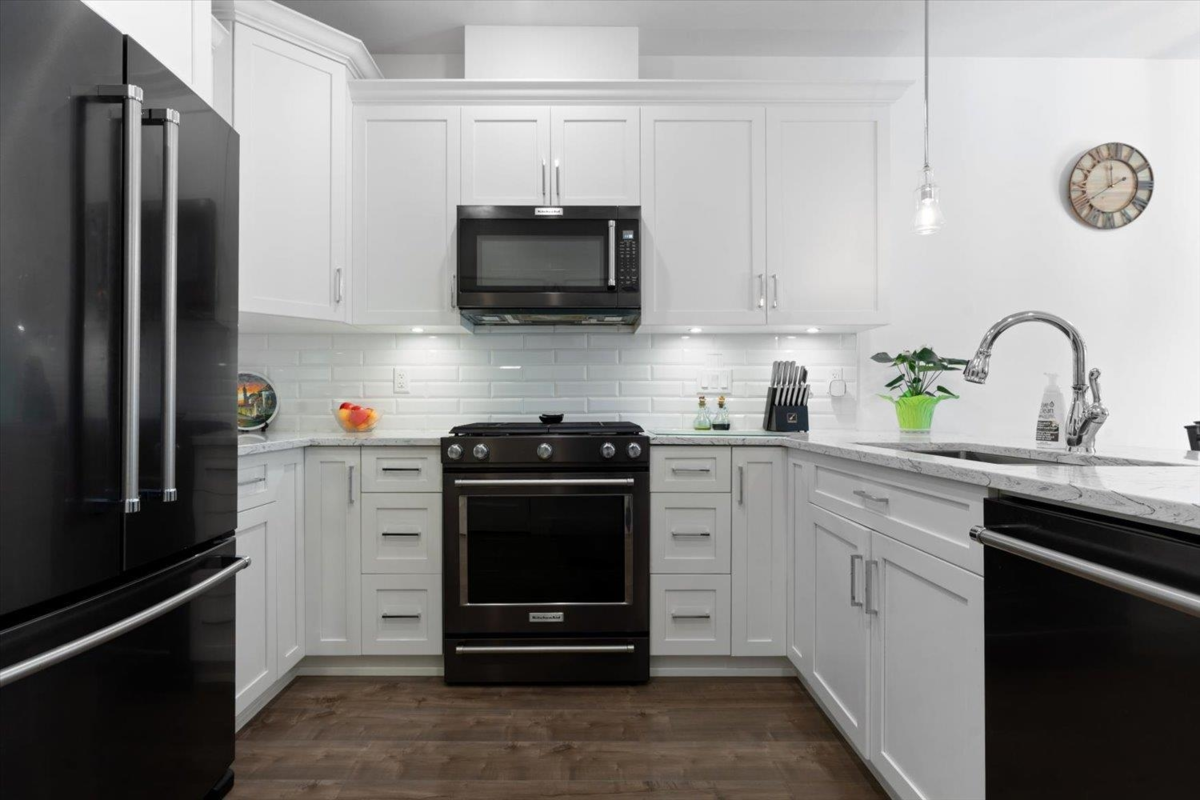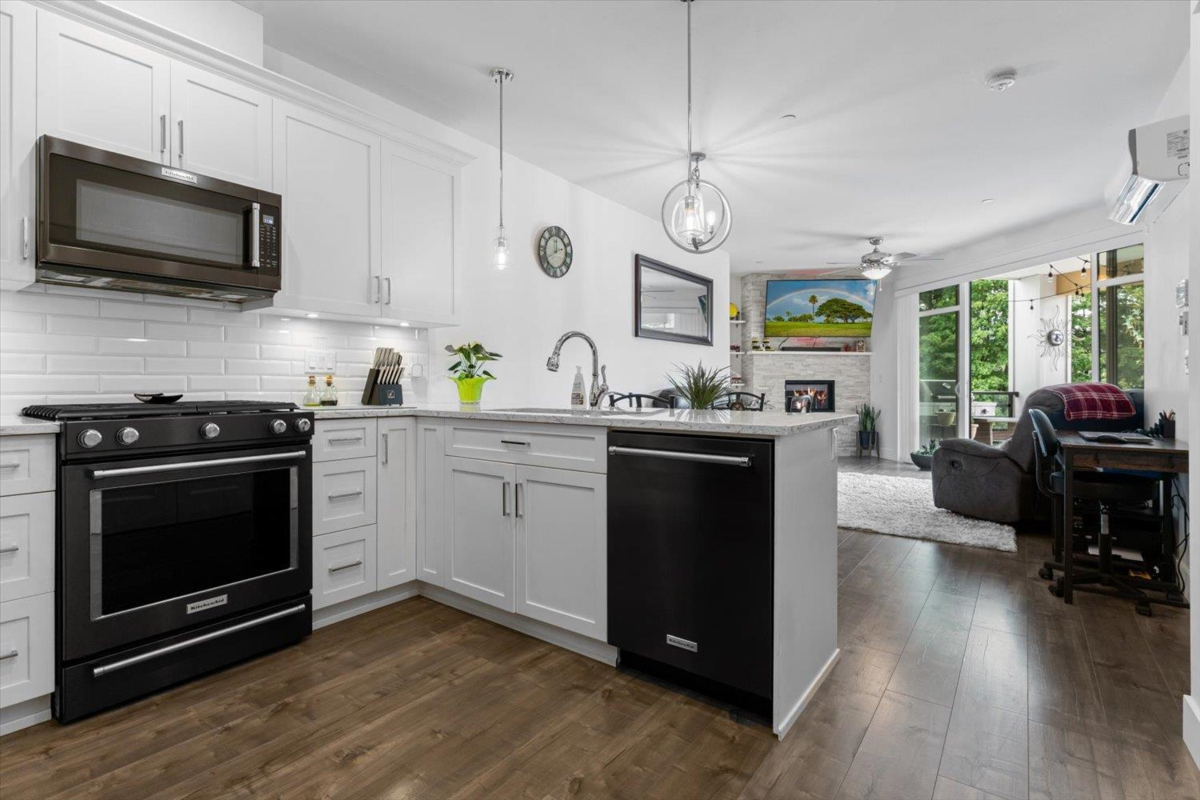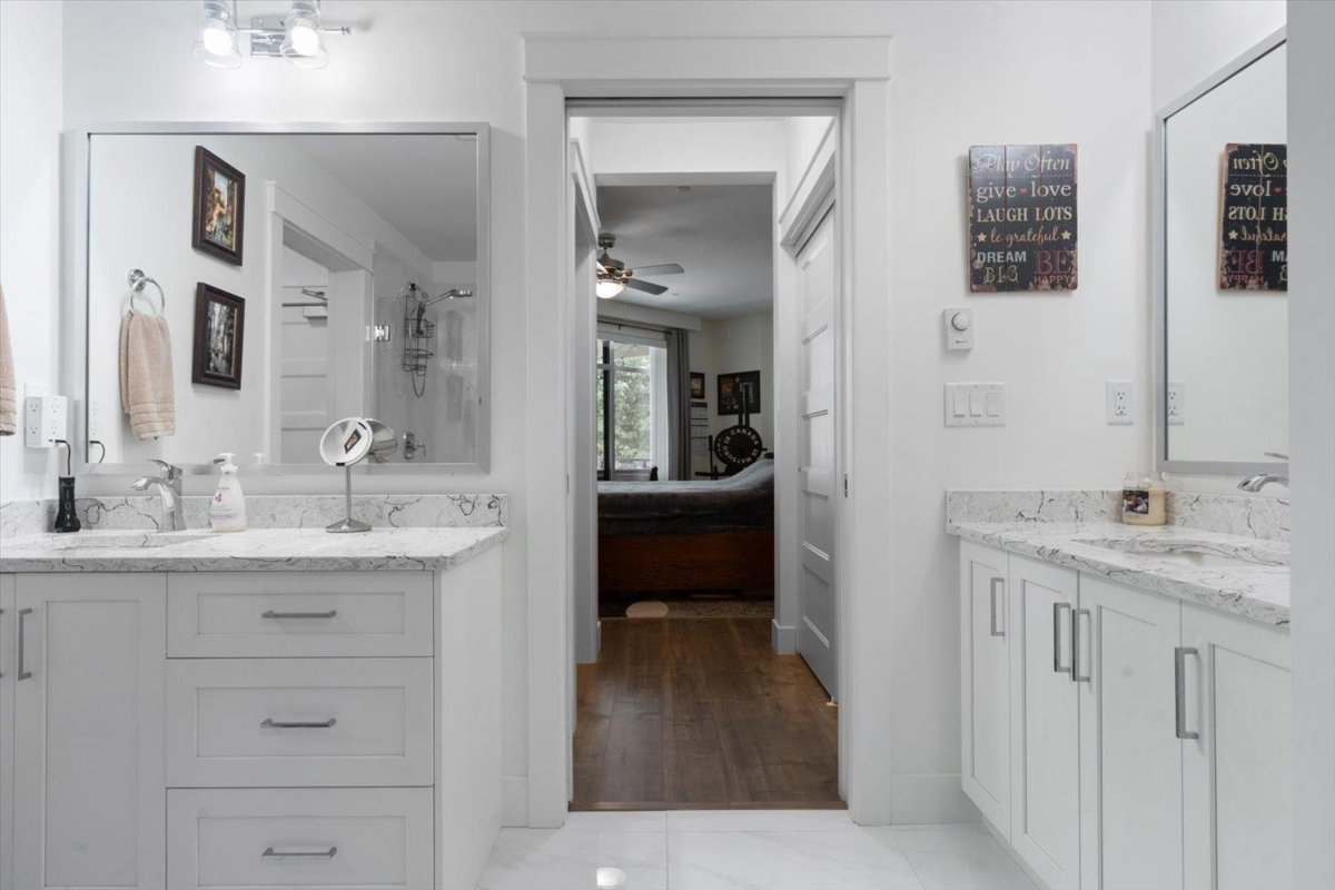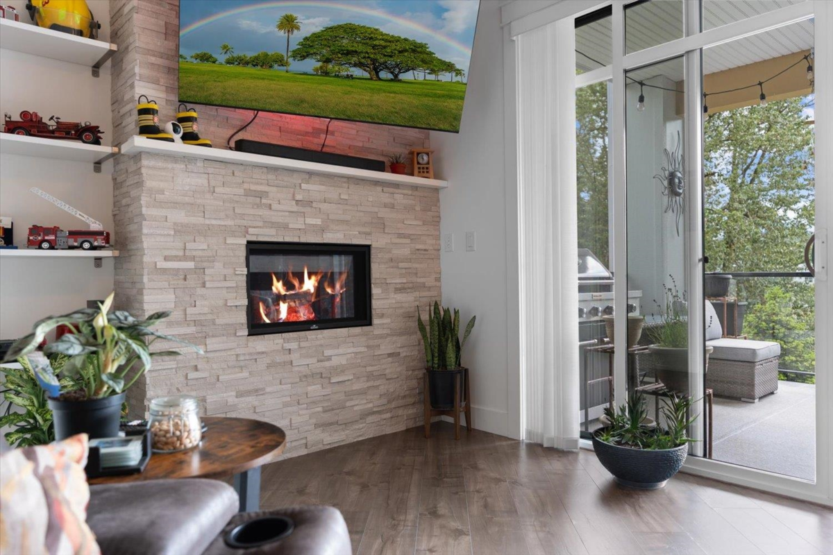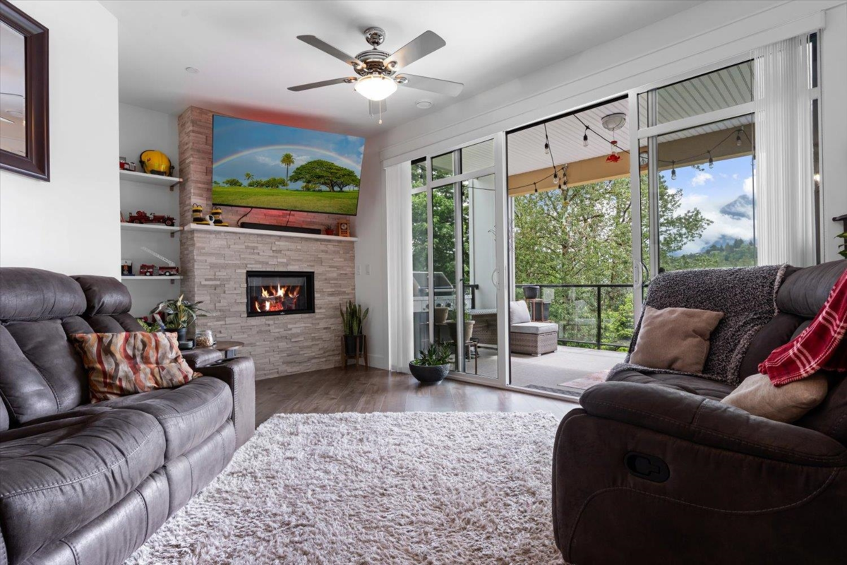 PRIME REAL ESTATE OPPORTUNITY! Live or invest in one of the most desirable locations steps from the Rotary Trail, Vedder River & Garrison Crossing! This modern & spacious like-new 1 bdrm condo features an open-concept layout & a stunning gourmet kitchen equipped w/ KitchenAid Black Stainless appliances, gas stove, subway tile backsplash, quartz counters, soft-close cabinetry & under-cabinet lighting. Bdrm has huge luxury ensuite w/ a soaker tub, frameless glass shower & double sinks plus w/i closet & custom shelving. Addt features incl a/c in the living room & bedroom, a large semi-private covered patio w/ a million-dollar mountain views, 1 secured underground parking stall & a large storage unit. Beautiful finishes, low strata fees & pet-friendly bylaws make this condo a win! Call today!