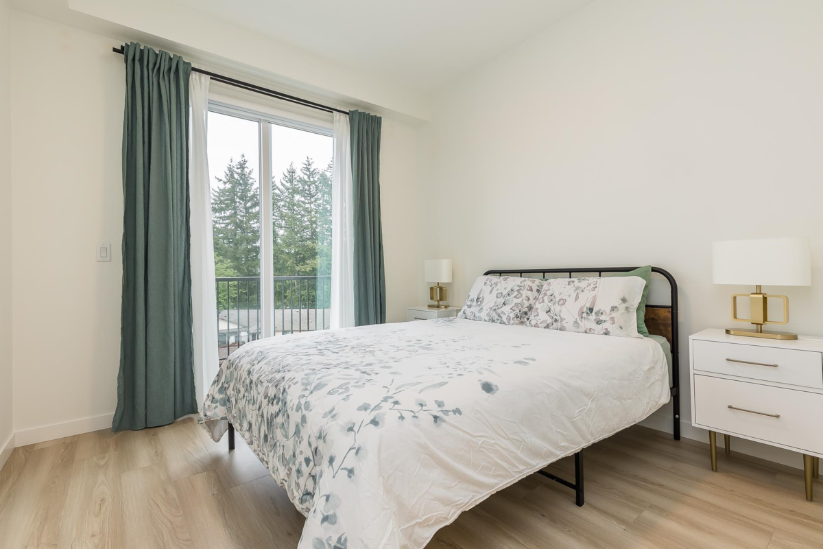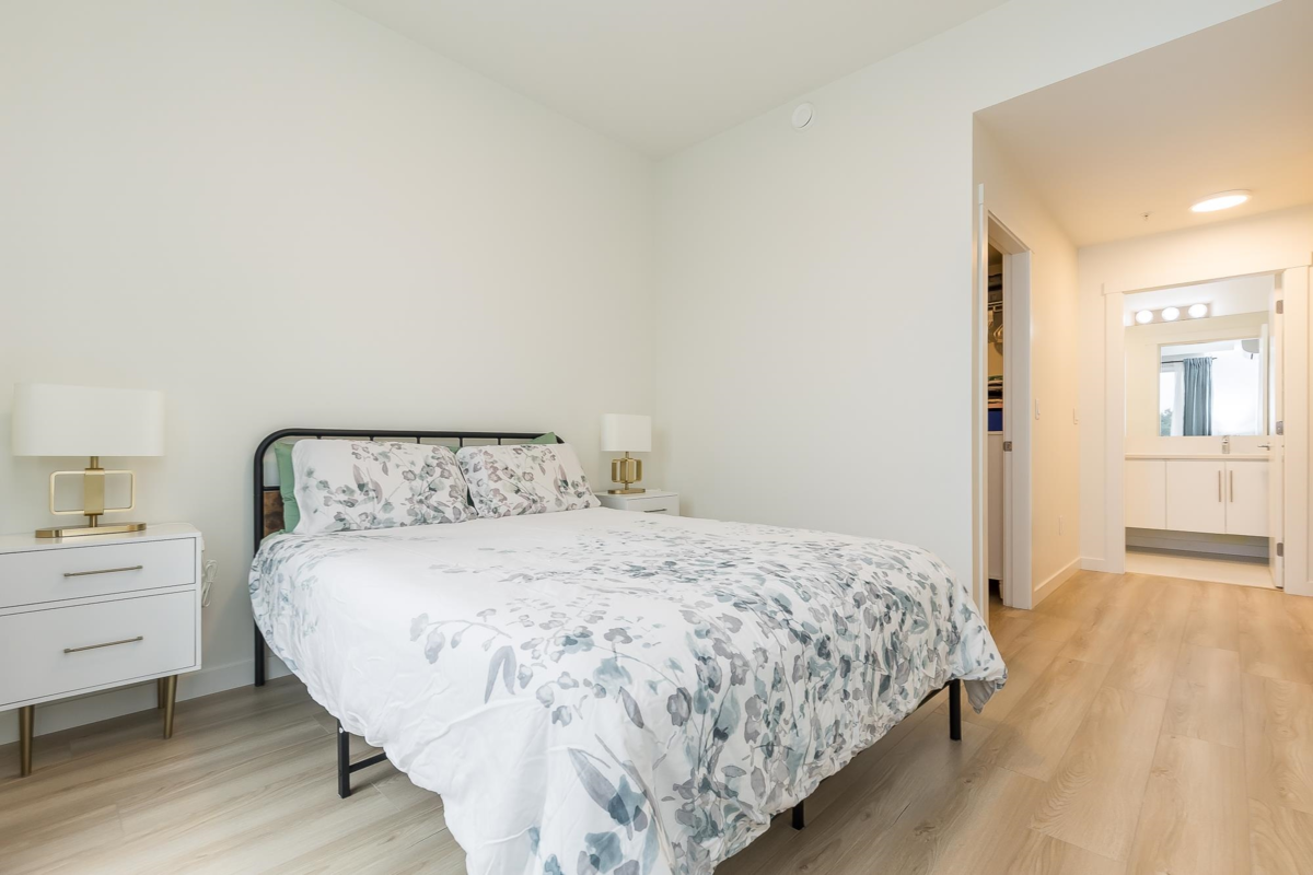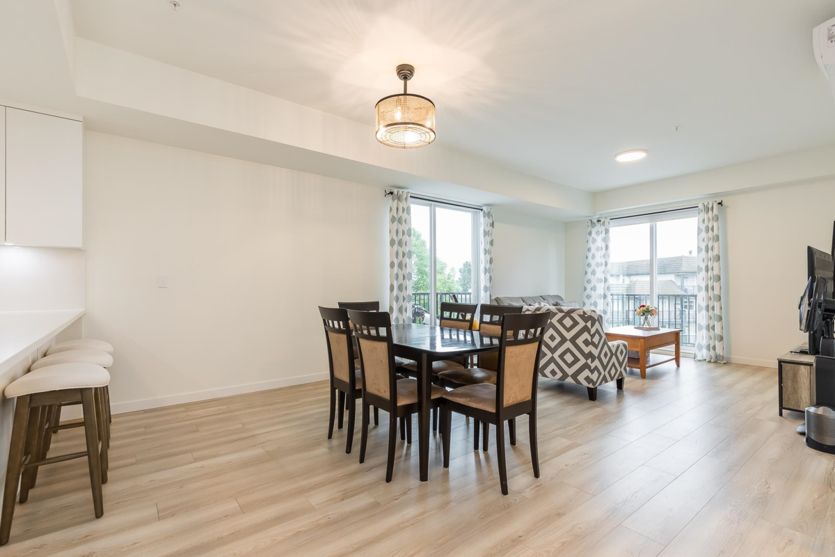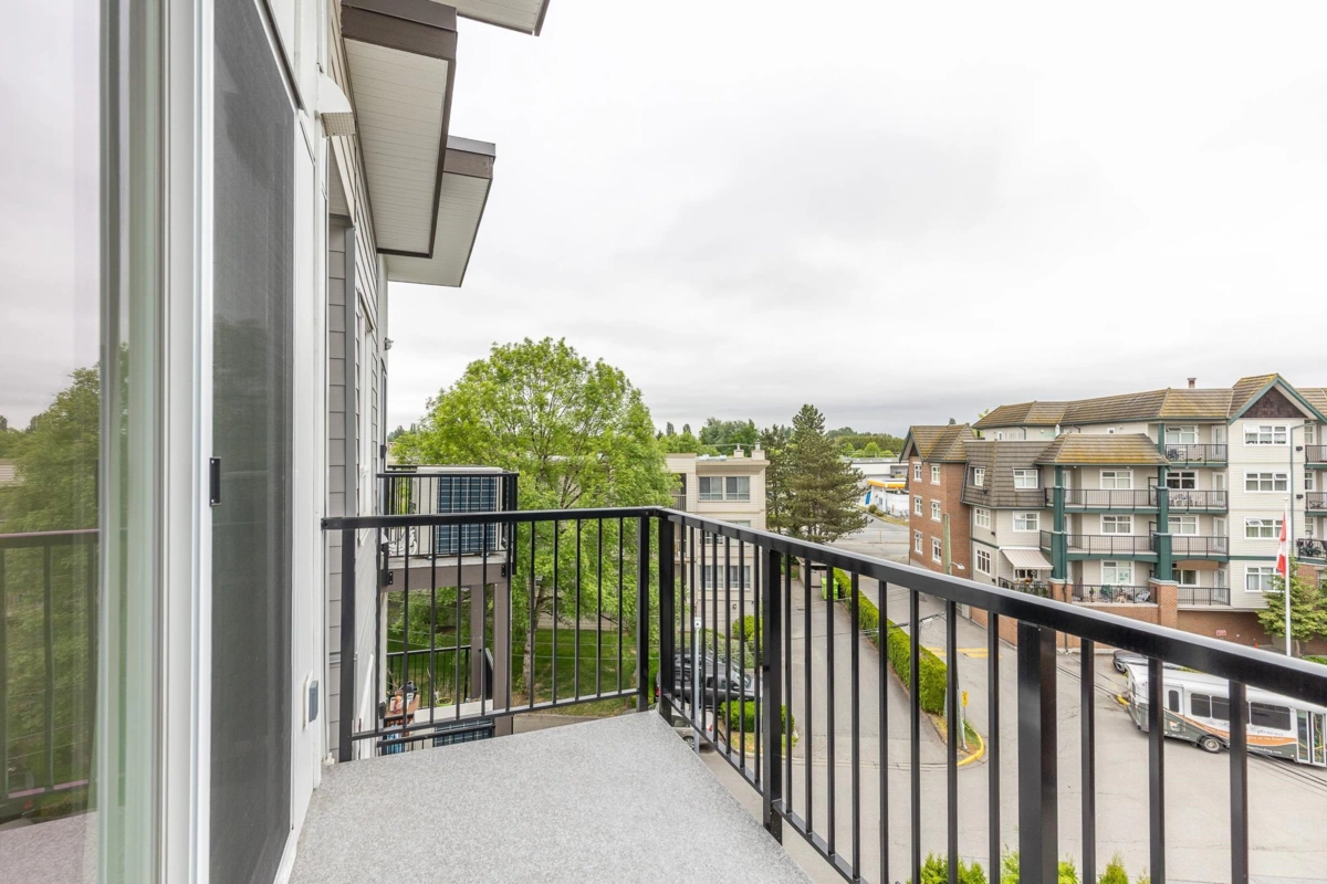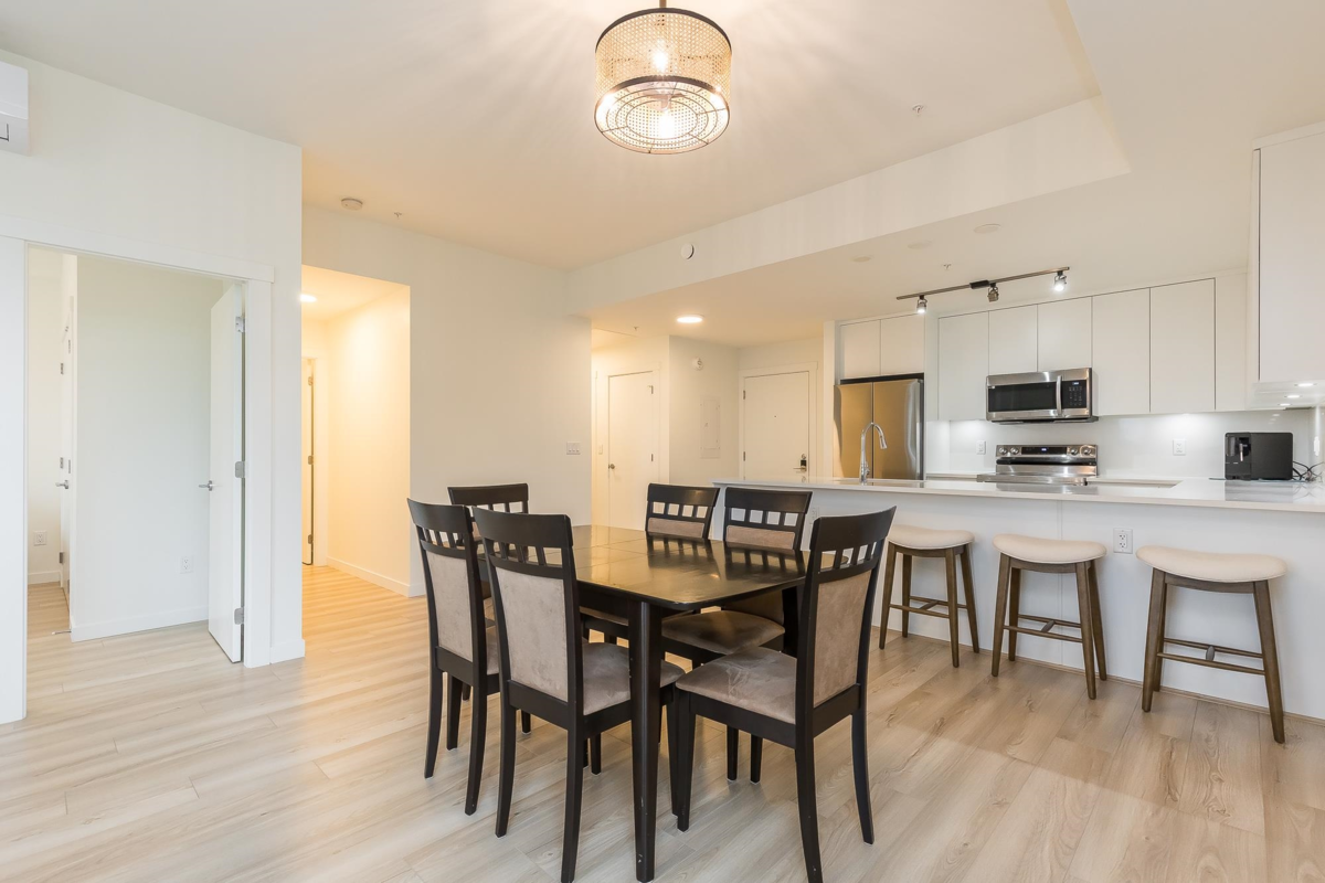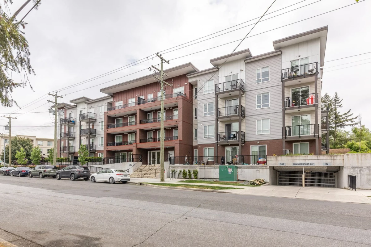 Penthouse corner unit at Nicomekl Garden! This 2 bed + den, 2 bath home offers mountain views, 3 patios, and a bright open layout with 9' ceilings. Enjoy stainless steel appliances, A/C, tons of counter space, and in-suite laundry. Only 40 units in this 4-storey boutique building. Pets allowed w/restrictions. Amenities include gym, playground, 1 locker, and 2 covered parking. Walk to parks, shops, leisure center, and the future SkyTrain. Fantastic walkability in the heart of Langley!