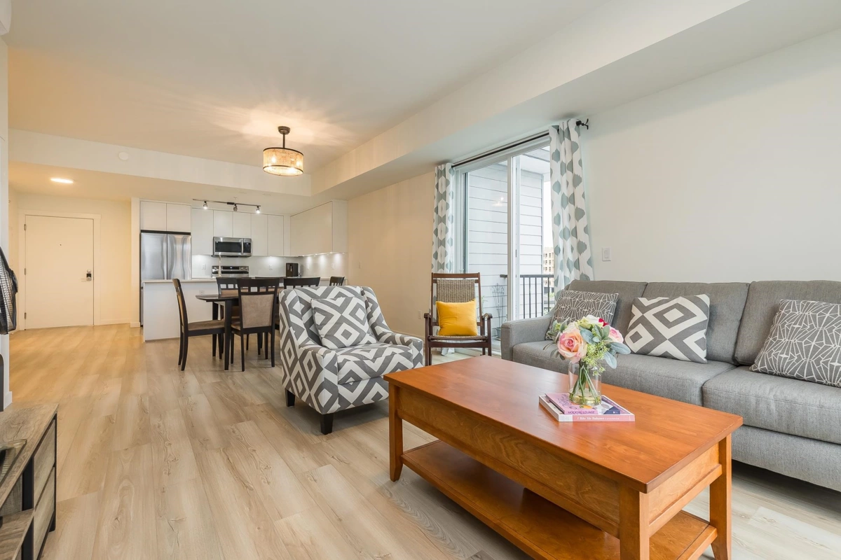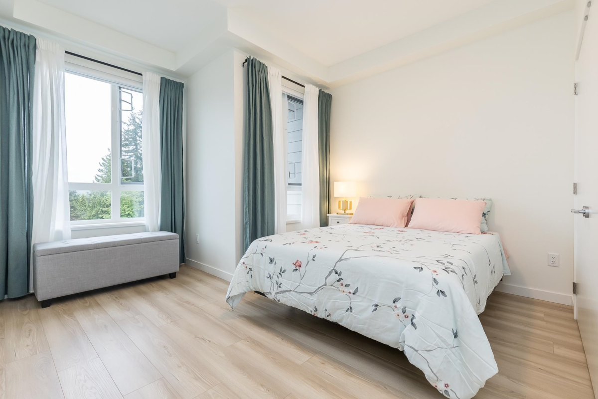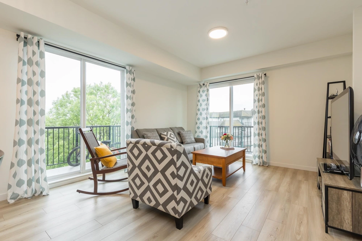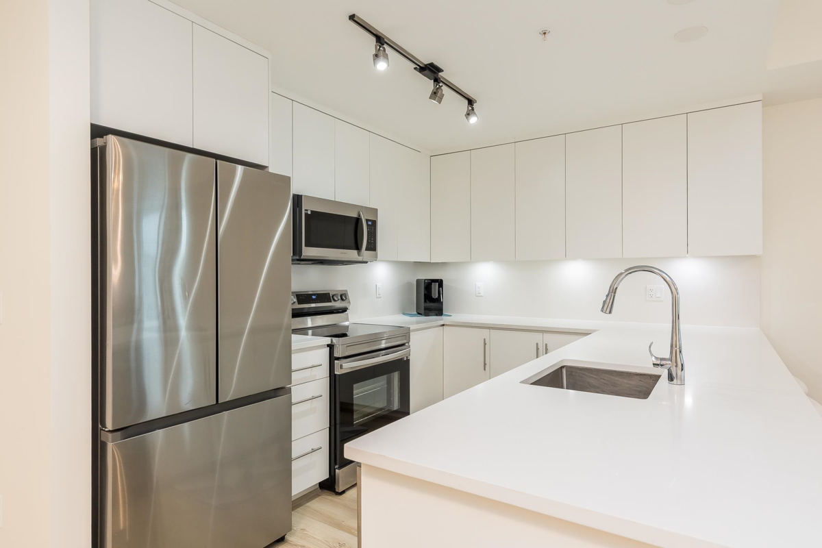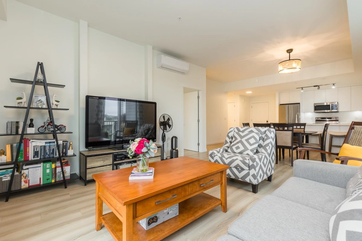 Penthouse corner unit at Nicomekl Garden! This 2 bed + den, 2 bath home offers mountain views, 3 patios, and a bright open layout with 9' ceilings. Enjoy stainless steel appliances, A/C, tons of counter space, and in-suite laundry. Only 40 units in this 4-storey boutique building. Pets allowed w/restrictions. Amenities include gym, playground, 1 locker, and 2 covered parking. Walk to parks, shops, leisure center, and the future SkyTrain. Fantastic walkability in the heart of Langley!