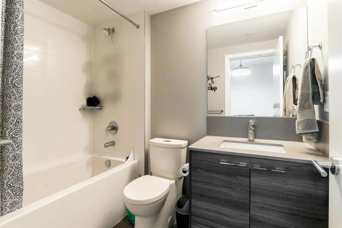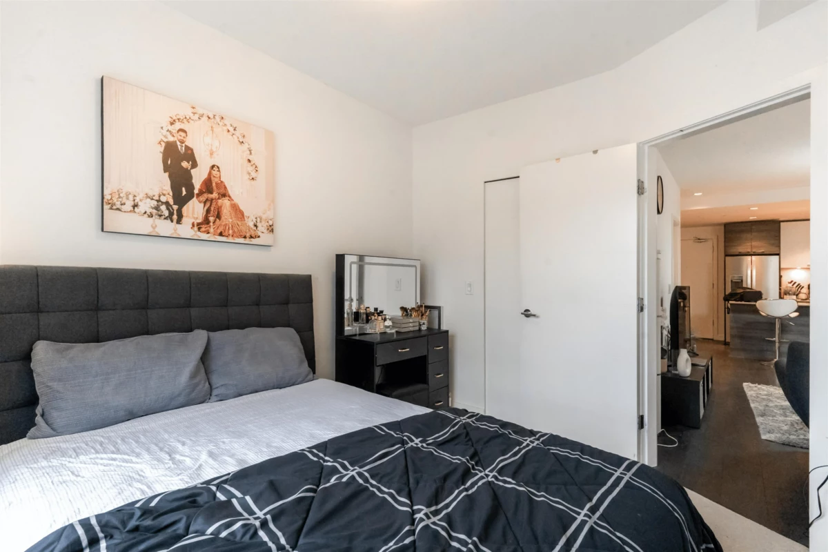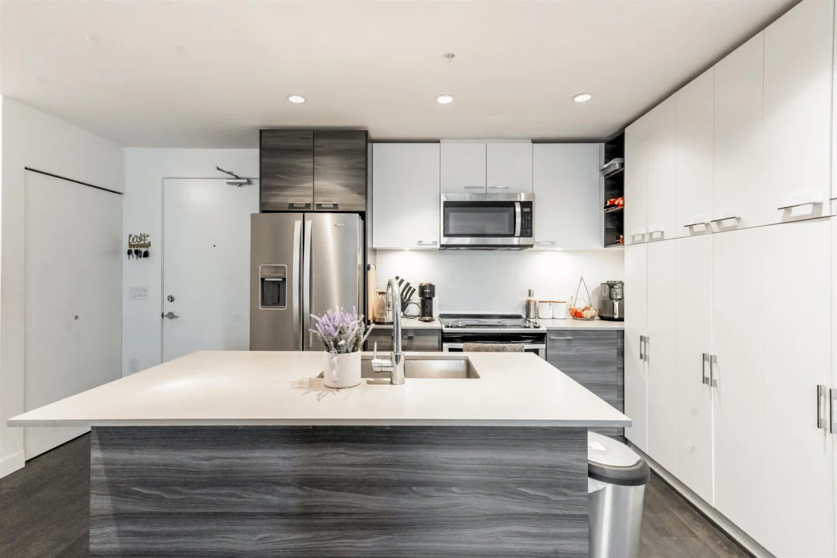 Welcome to this beautifully designed south-facing 1-bedroom suite, offering 628 sq. ft. of bright and open living space. Flooded with natural light through large windows and enhanced by high ceilings. The modern kitchen features sleek stainless steel appliances, elegant quartz countertops, and plenty of cabinetry for storage. Additional highlights include one secure parking stall and a convenient storage locker. A perfect combination of style, comfort, and functionality — ideal for first-time buyers or investors. OPEN HOUSE Oct 18 2-4PM.
