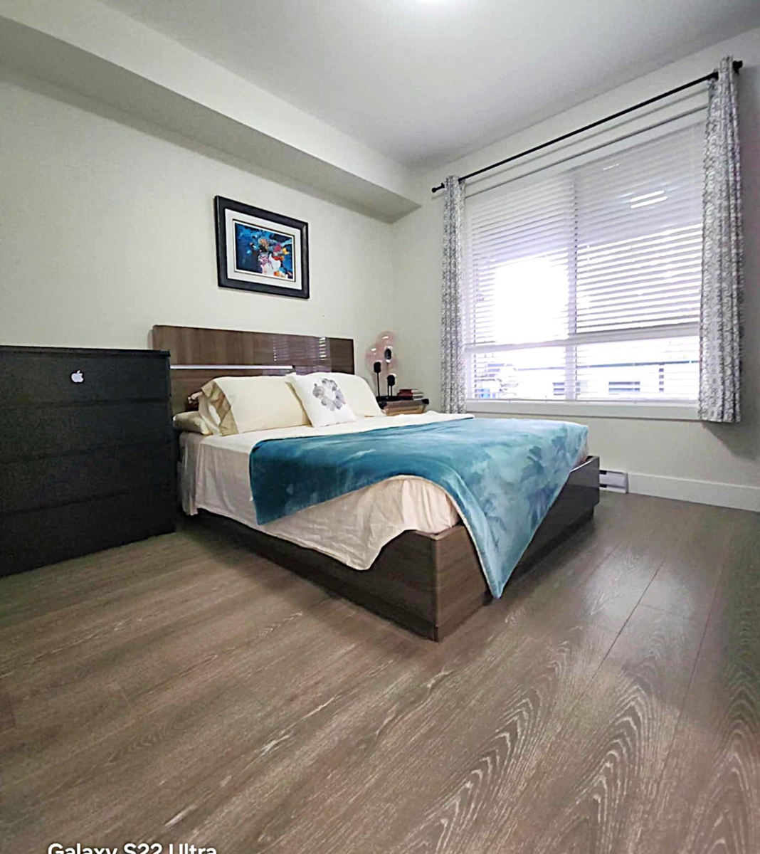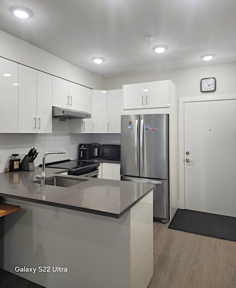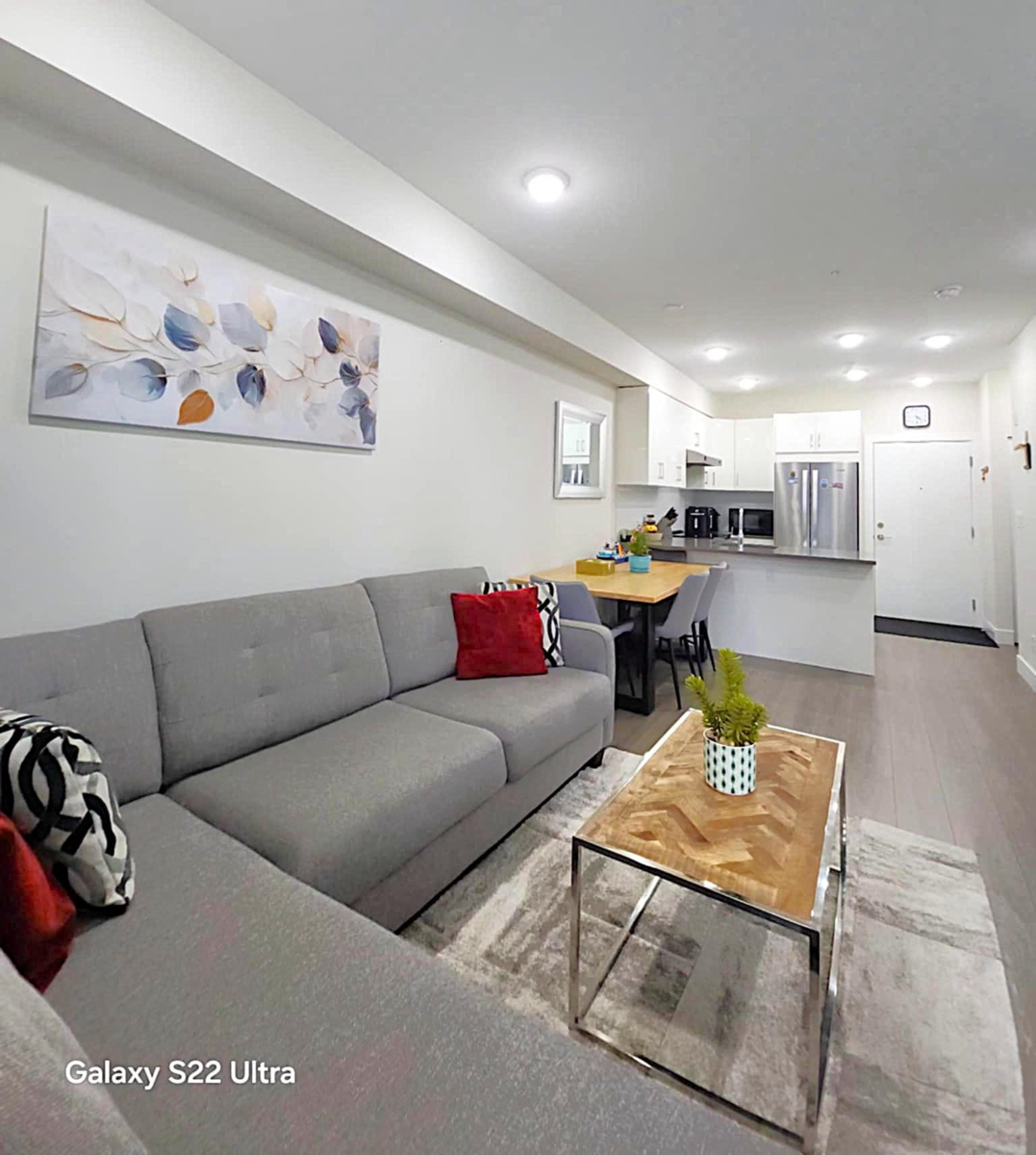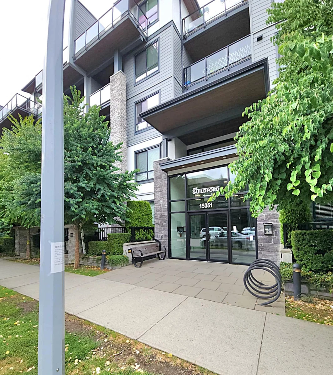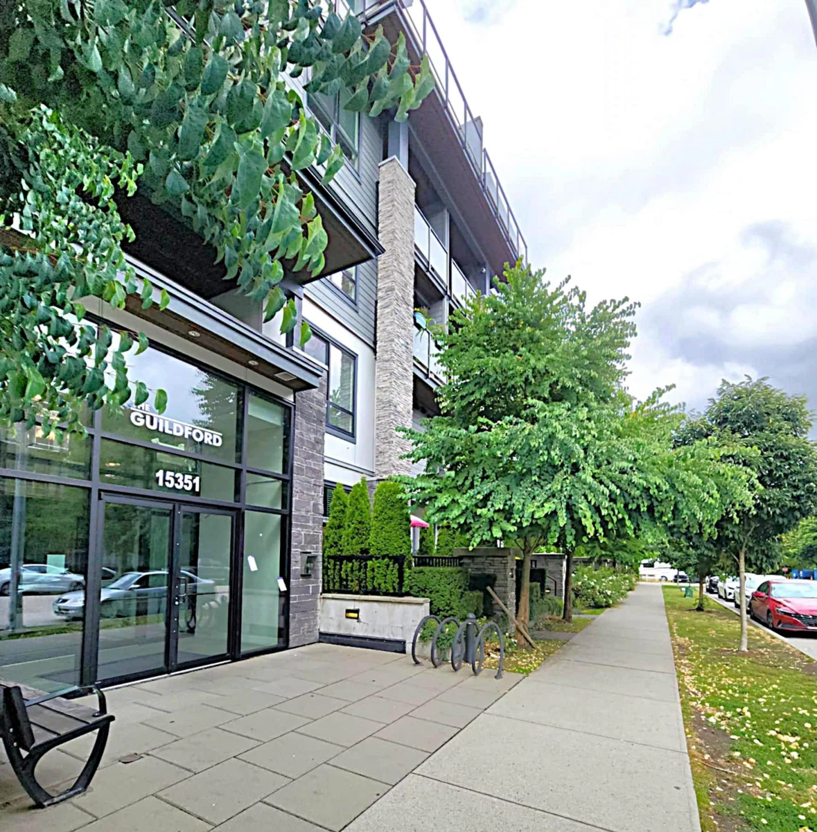 Welcome to "The Guildford". A fully Rain Screened building! This thoughtfully designed home features 2 full bathrooms, 2 parking stalls (located next to the elevator), 2 Bike storage locker, and a bright, open layout. Interior highlights include: Full stainless steel appliance package; High-gloss soft-close cabinetry; Quartz countertops with under-mount square sinks; High-efficiency washer & dryer; Oversized porcelain tiles in bathrooms; Deep soaker tub with modern glass shower doors. Backed by 2-5-10 New Home Warranty for peace of mind. Just steps from Guildford Town Centre, T&T Supermarket, Landmark Cinemas, transit, schools, parks, and more! Don't miss this opportunity to own in one of Surrey's most convenient and vibrant communities. Open House: Nov. 29 & 30 ( Sat. & Su.) from 2-4 PM.