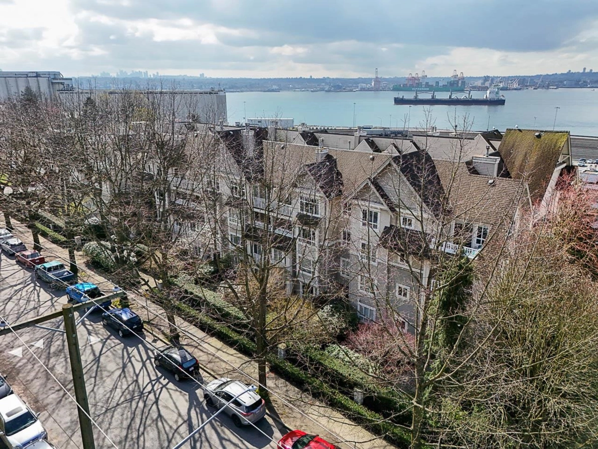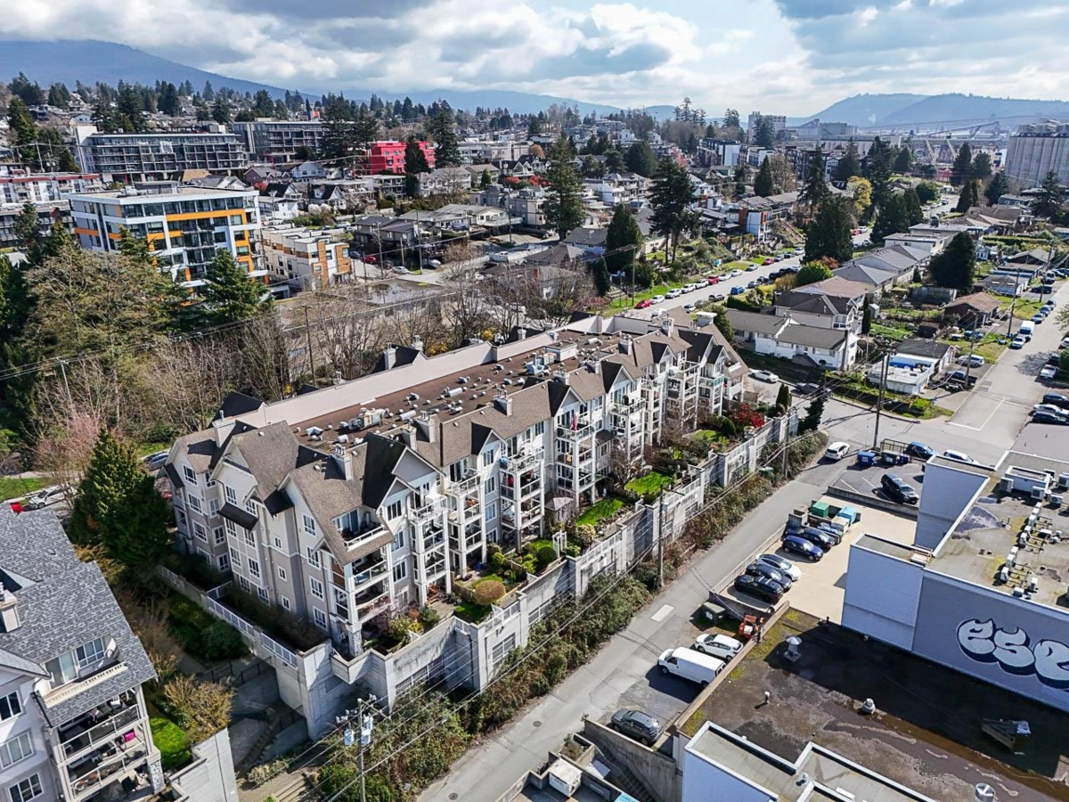 Top floor, 1 bed, 1 bath, OCEAN VIEW unit in sought-after Lower Lonsdale, close to breweries, walking trails, shops and restaurants. This light-filled home features vaulted ceilings in the living room, anchored by a cozy gas fireplace (included in strata) and sliding doors that lead to your own private patio with panoramic ocean and city views. Enjoy the same beautiful scenery from the primary bedroom, which leads to a walk-in closet. With updated laminate flooring throughout, in-suite laundry, parking and storage, this penthouse-style home in a quiet, prime location has it all.