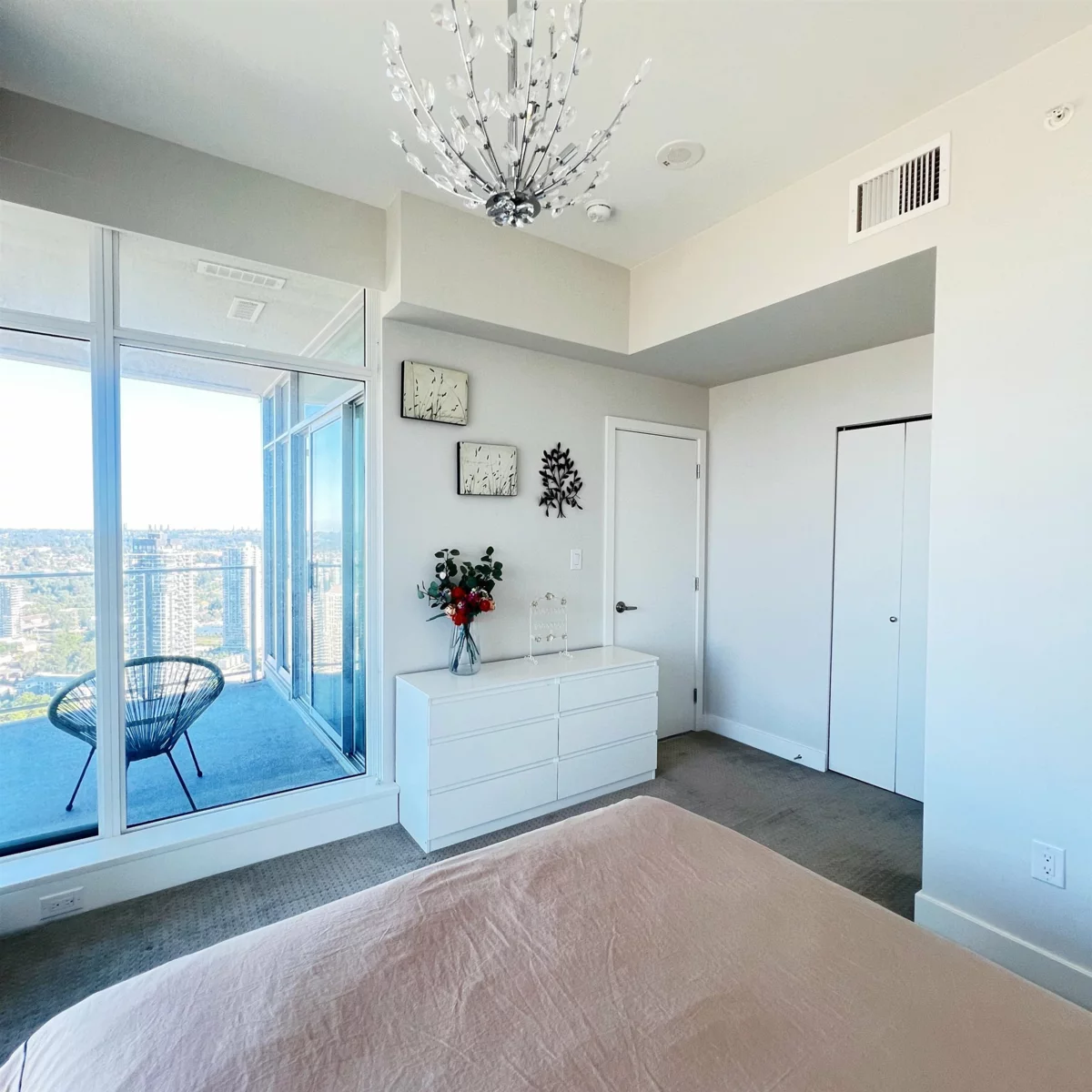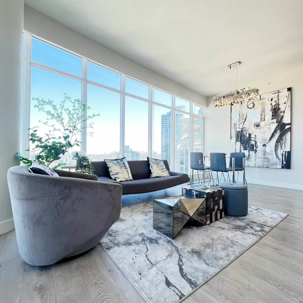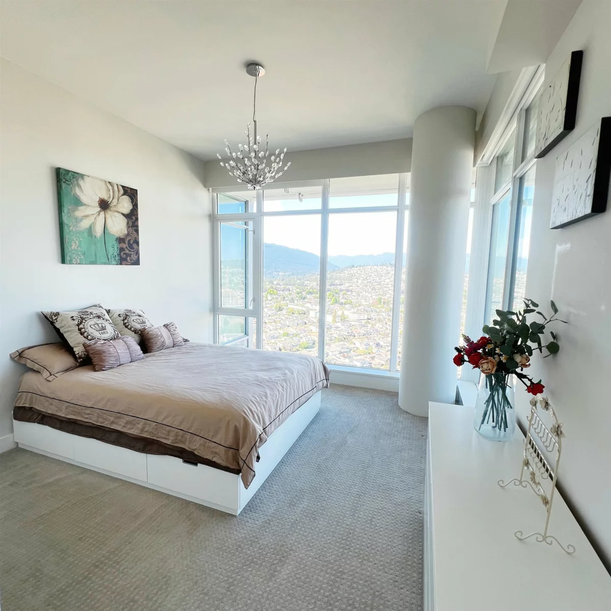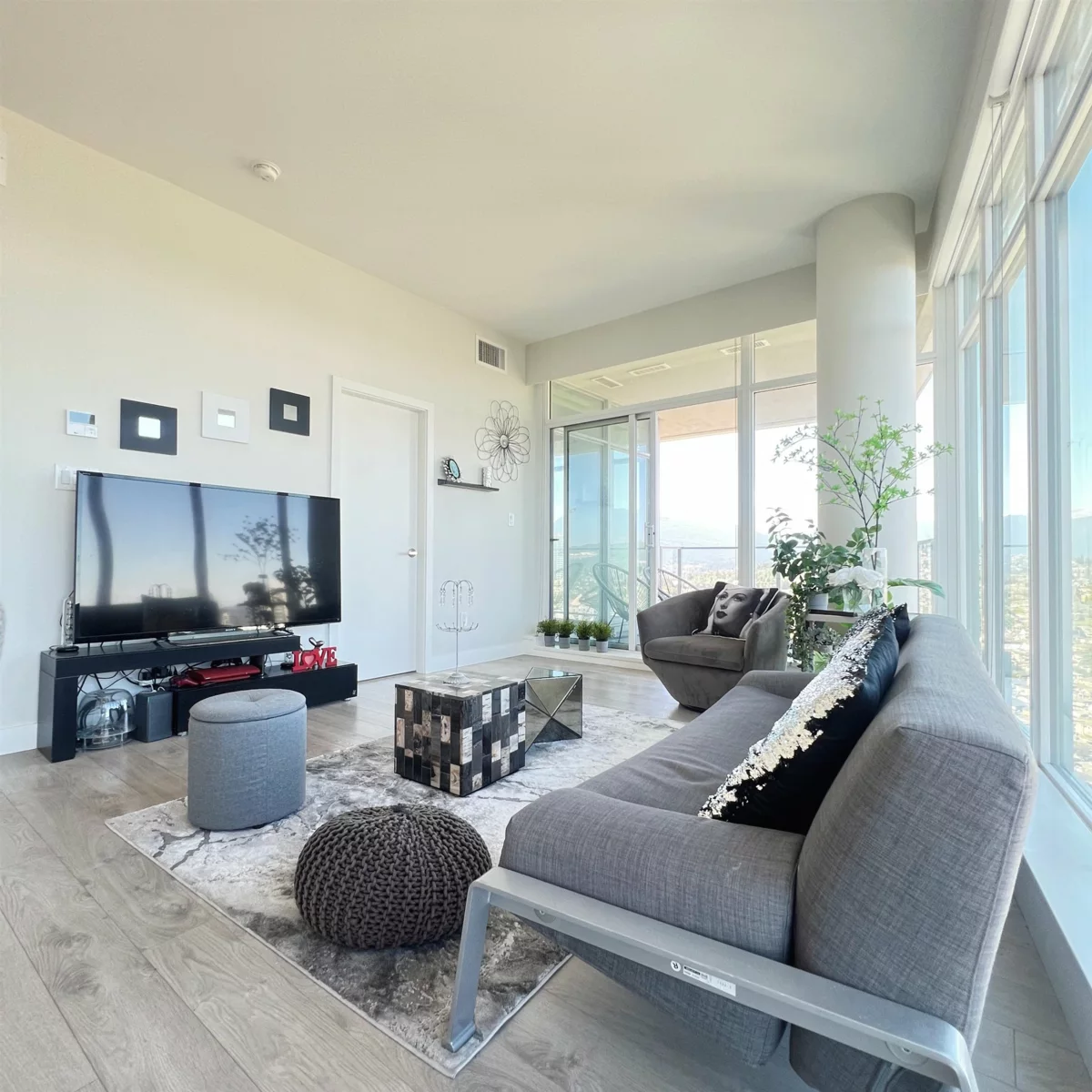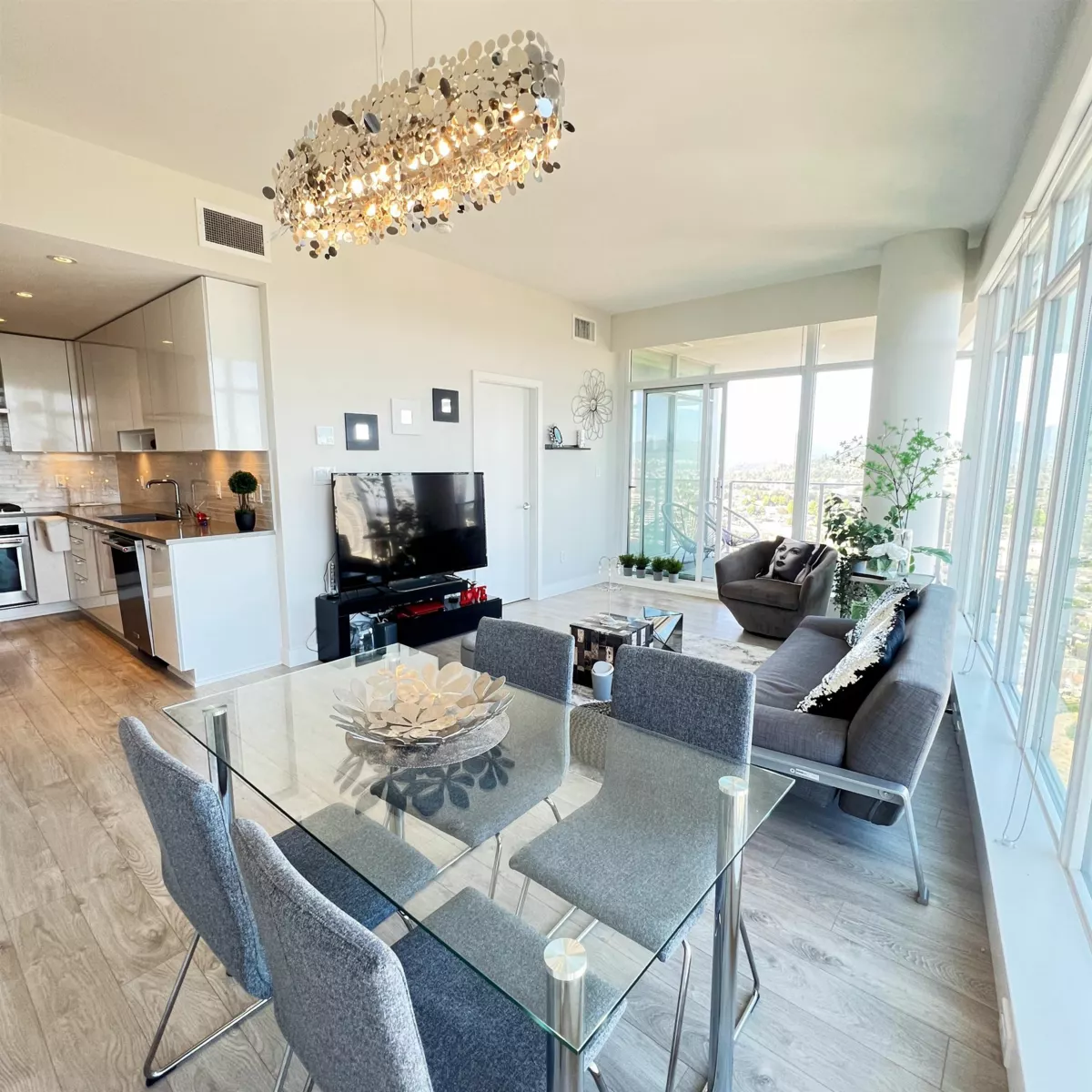Exceptionally well-kept 41st floor, sub-penthouse corner 2 bed home. Spectacular 230 degree view in Brentwood. 926 sqft w/ thoughtful layout maximizing privacy between bedrooms and ensuite master bath with soaker tub. The gourmet chef's kitchen features gas stove, full-size stainless steel appliances and quartz countertops and lots of storage. Enjoy luxury living w/ spa-like baths, AIR CONDITIONING and 9 ft ceilings. Home comes with 1 Parking and Locker. Escala amenities: Concierge, Indoor pool, hot tub, dry + steam saunas, gym, dance studio, theatre, ping pong rooms, meeting rooms, 2 guest suites, party room and visitor parking. Greet the day with beautiful views of the sunrise over the mountains; this home delivers an elevated lifestyle inside and out.