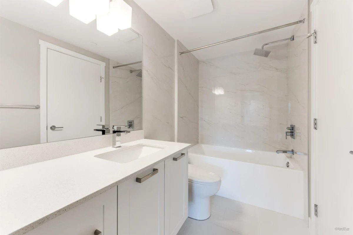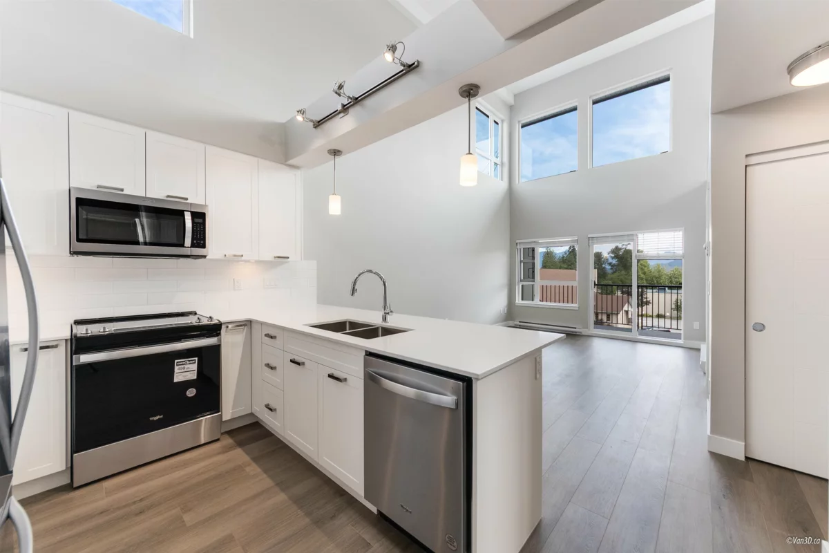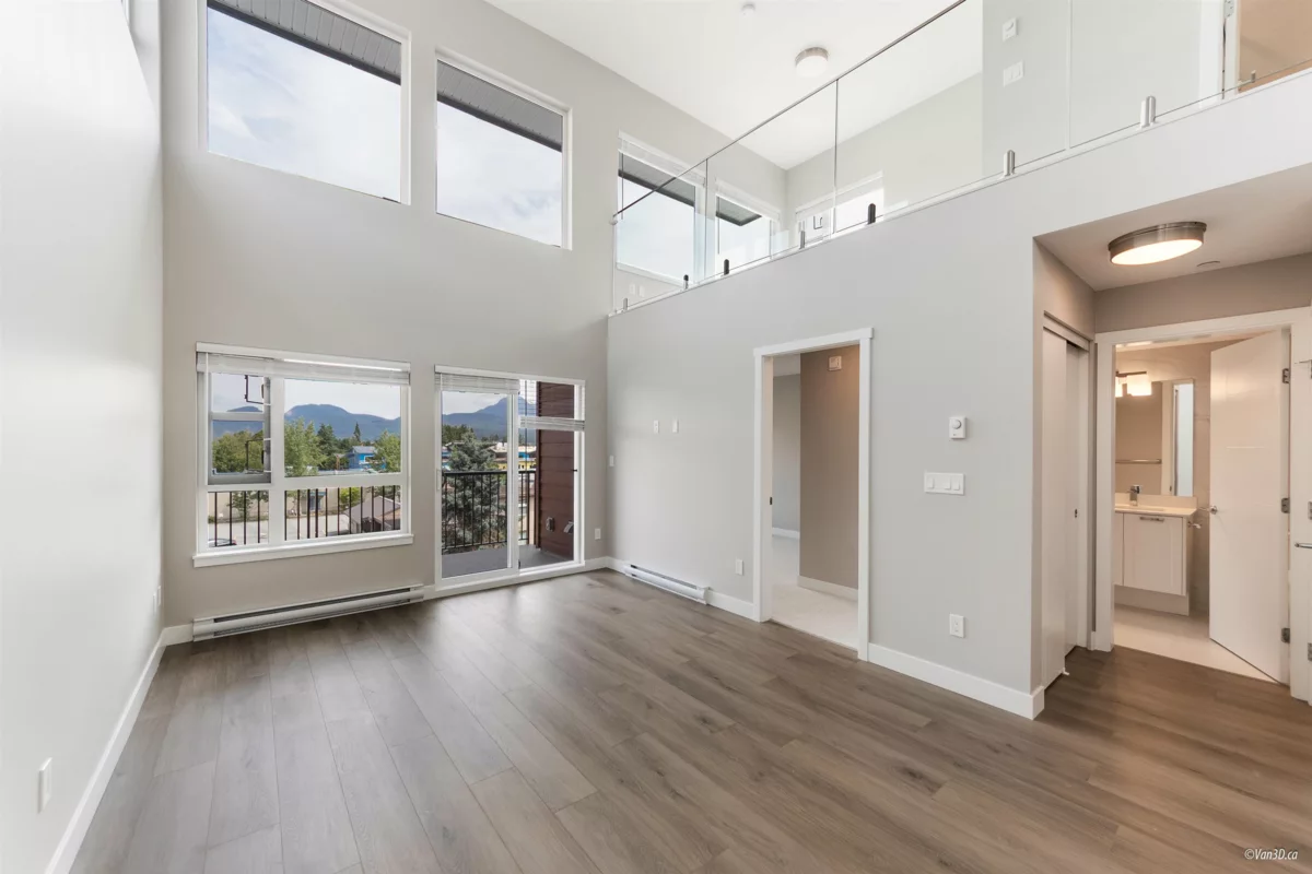 Edge 2, substantially rebuilt 2 bedroom penthouse with loft (1 bedroom on main and another on the loft), 2 full baths with laminate flooring throughout living, dinning and kitchen, and quartz counter tops. SELDOM AVAILABLE 18 ft. ceiling height in living room, dinning room and kitchen. Suite is flooded with day light through extra high windows. Panoramic mountain view and walking distance to elementary school, park, restaurants and shopping. Property comes with one parking and one storage locker.