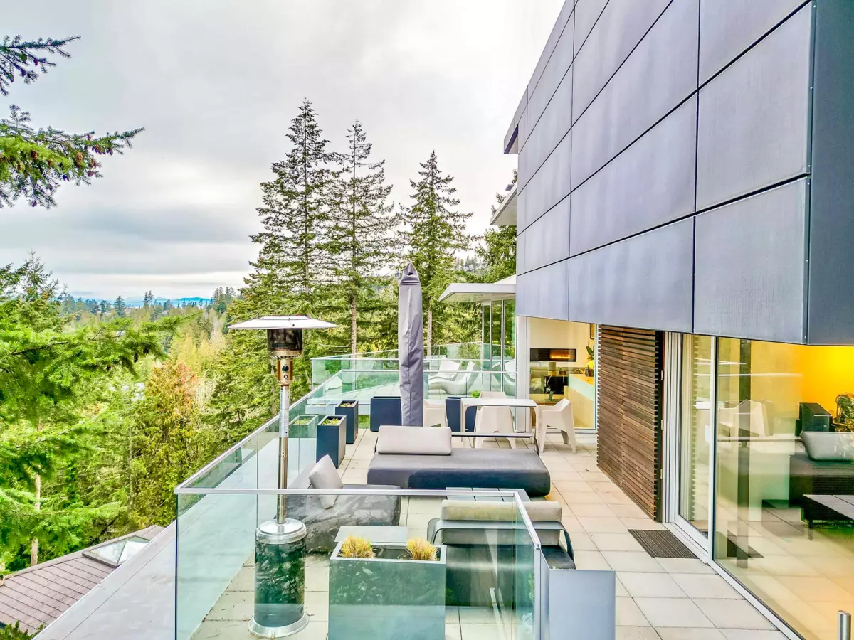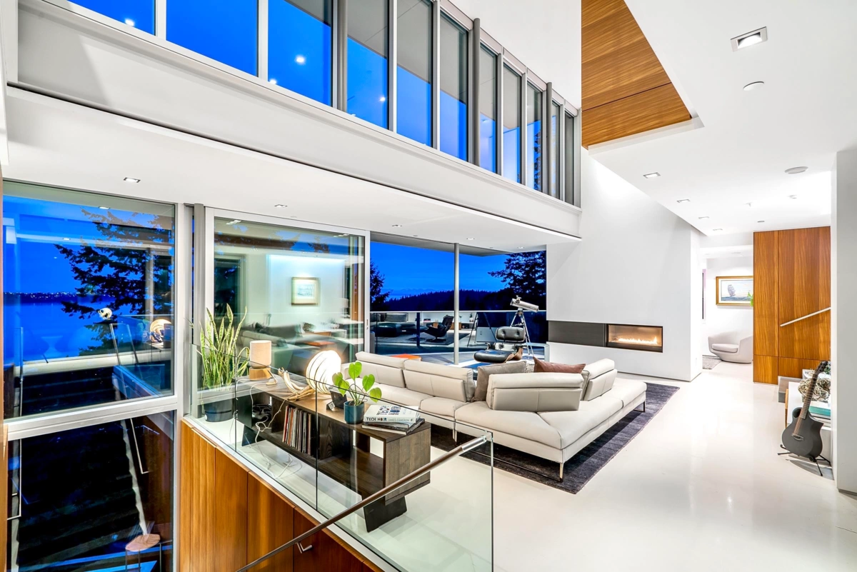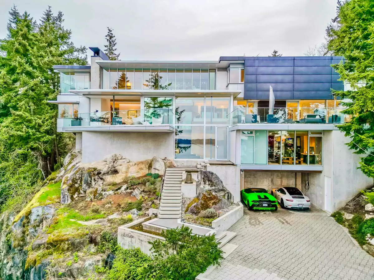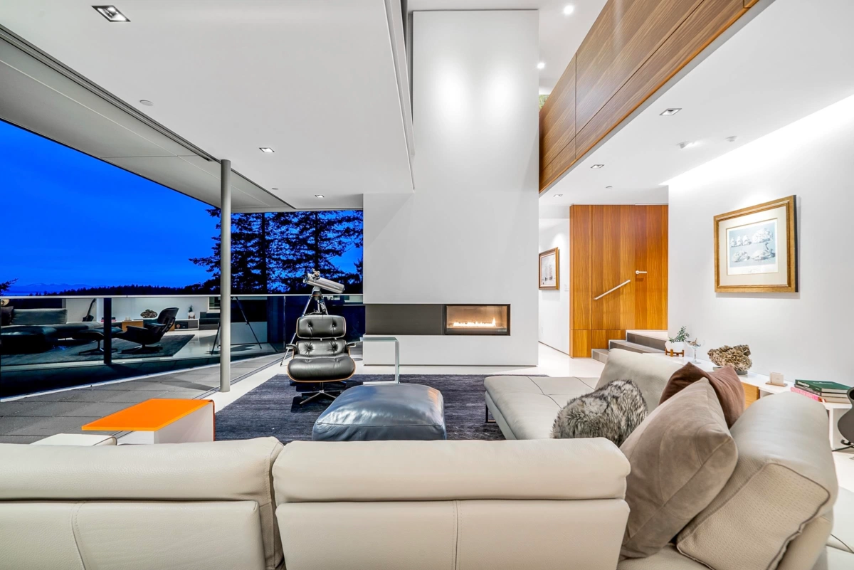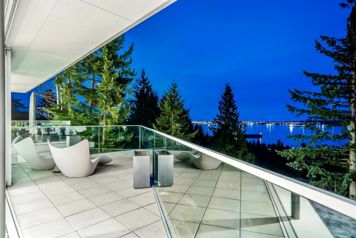 World Class West Coast Contemporary on private cul-de-sac, nestled among rock outcrops and towering Douglas firs overlooking spectacular ocean & city views. Designed by award winning architect & built to exacting standards w/extensive use of concrete, steel & cross laminated timbers, exterior façade of zinc-aluminum panels, commercial grade aluminum windows & doors. A signature 2-storey entry leads to large double height living area w/FP, formal dining, custom island kitchen. Principal rooms open to 3 lg patios & hot tub. African millwork & built-in cabinetry throughout. Up features sensational master w/spa-like ensuite & priv terrace, 2 guest bdrms w/ensuites. Down offers a rec/media rm or optional bdrms. All principal rooms capture stunning views from English Bay to Van Island & beyond.