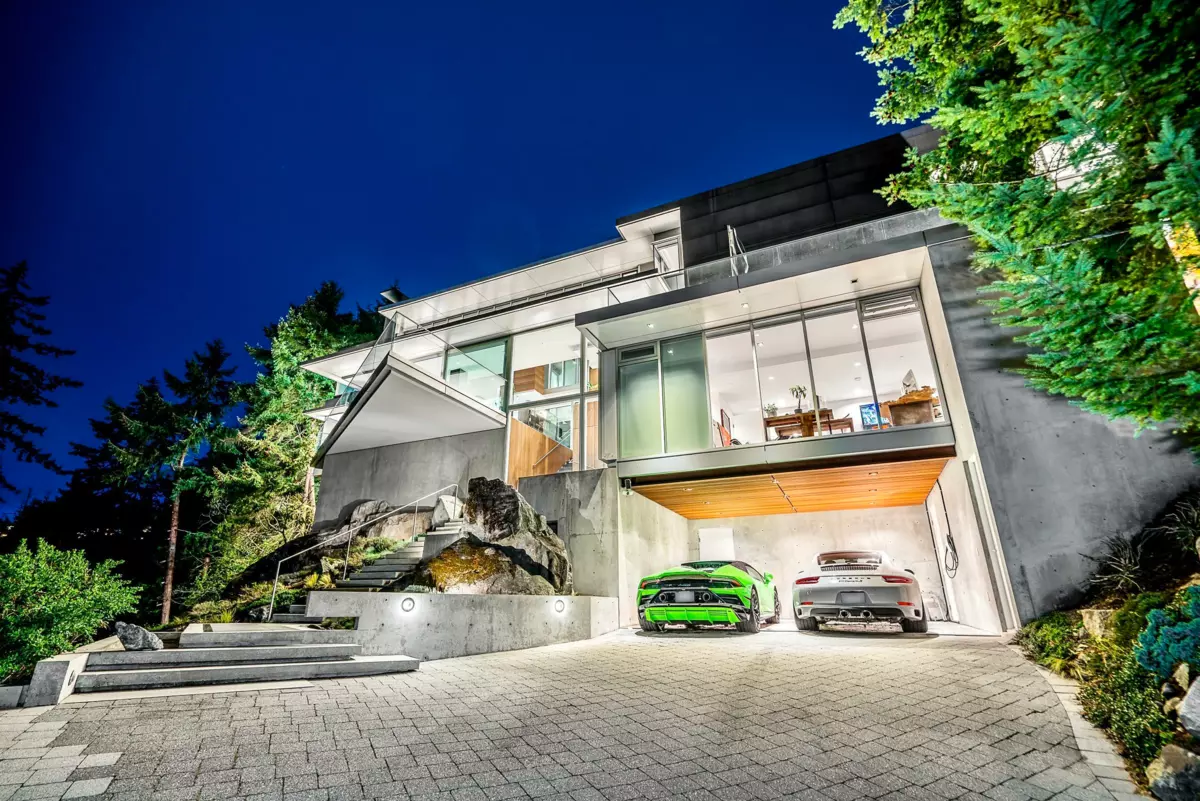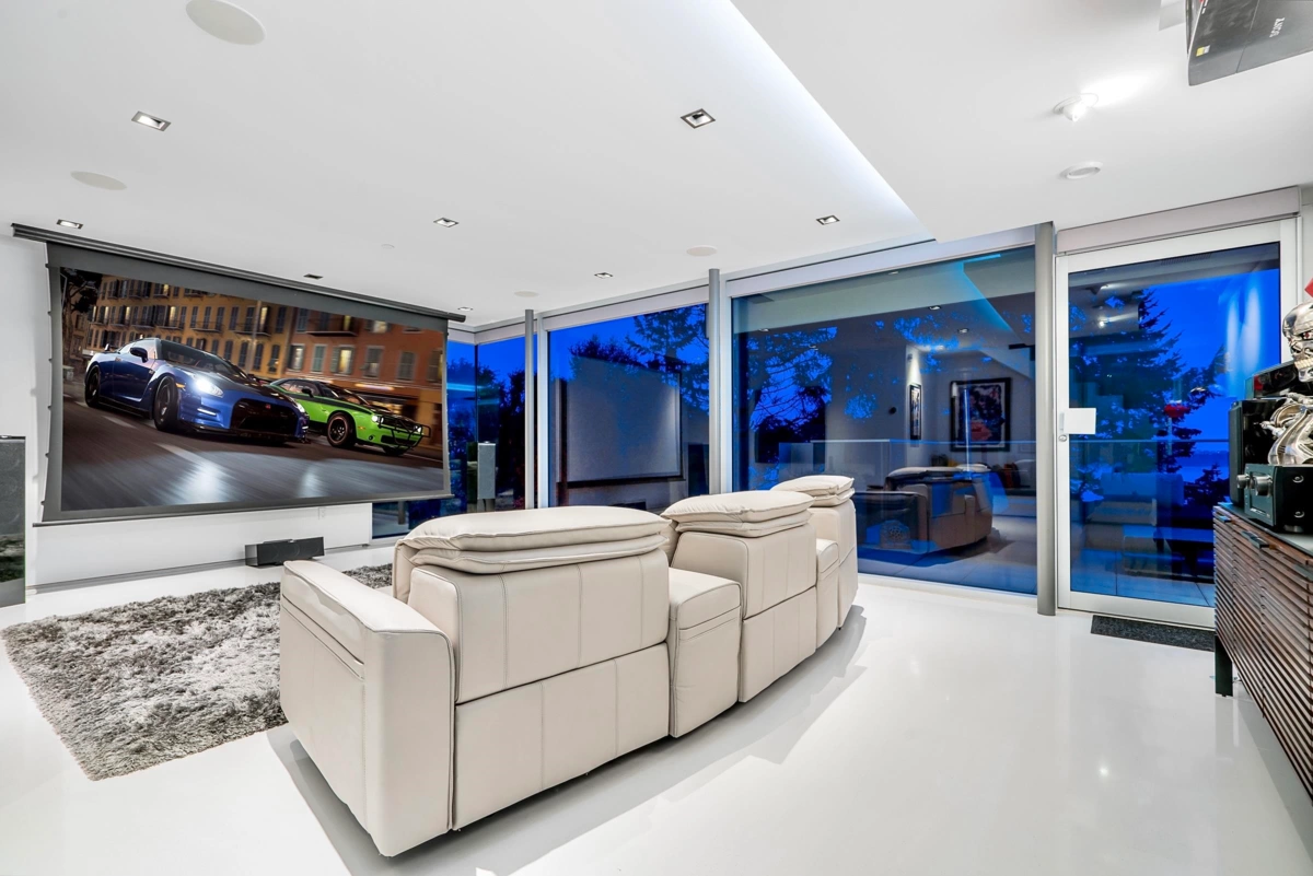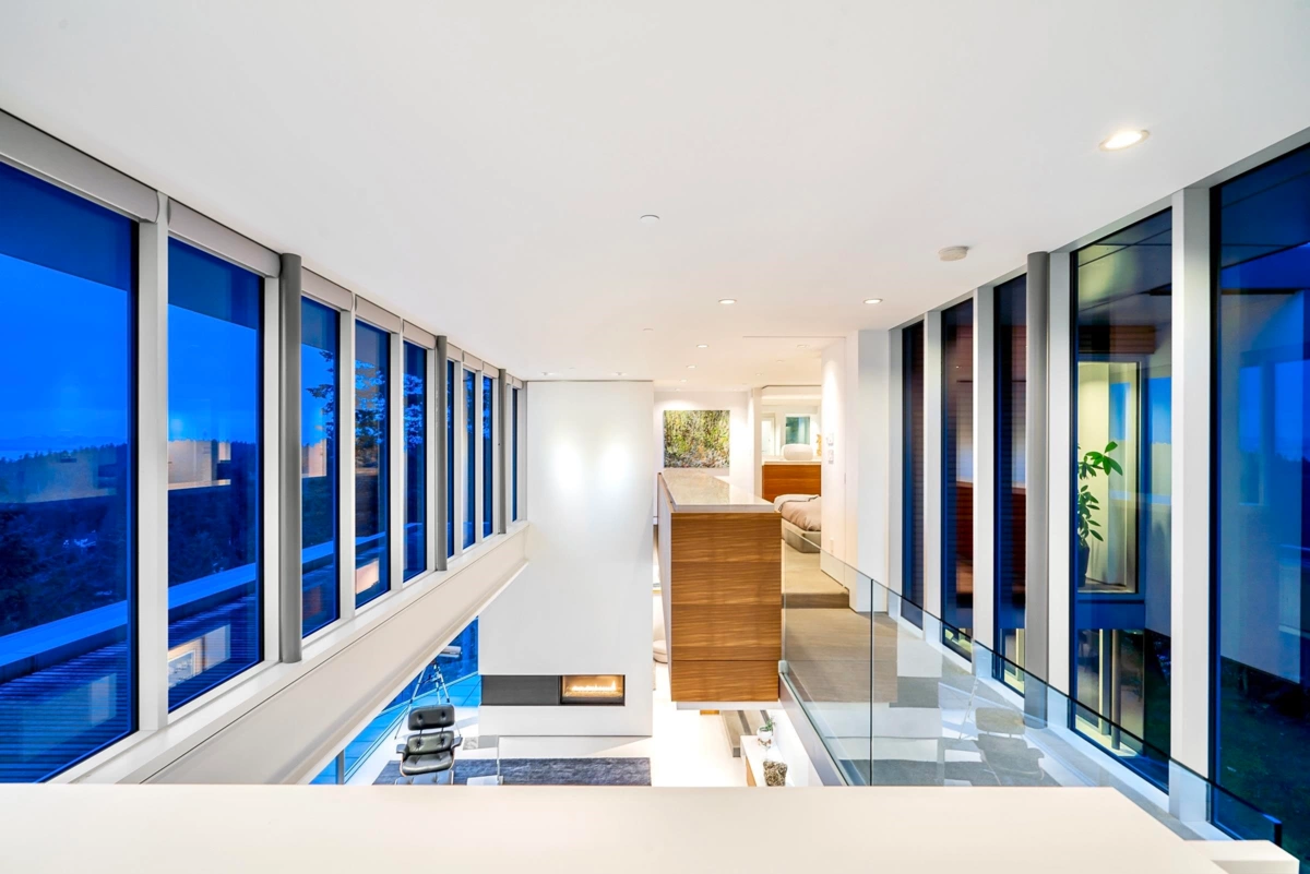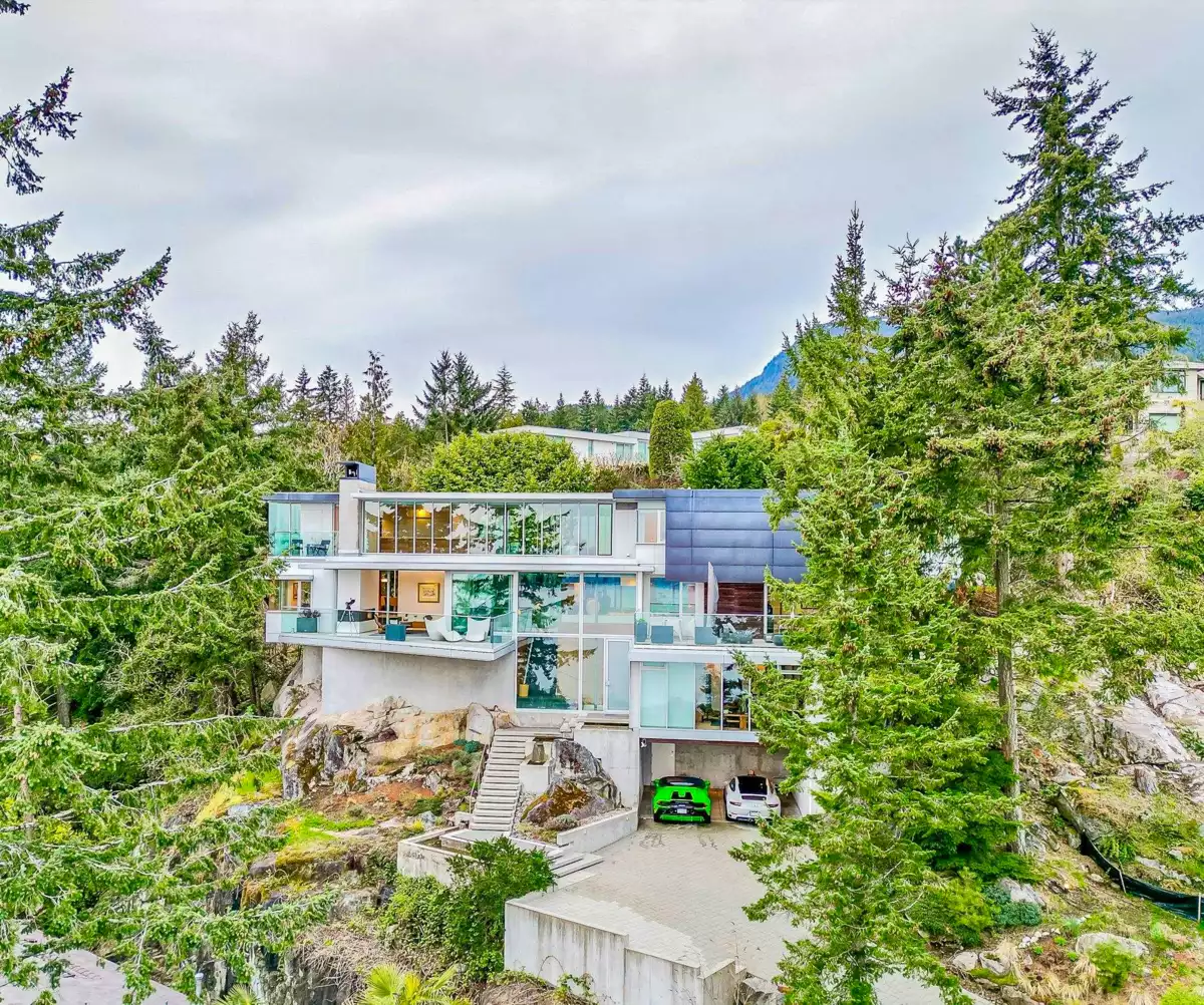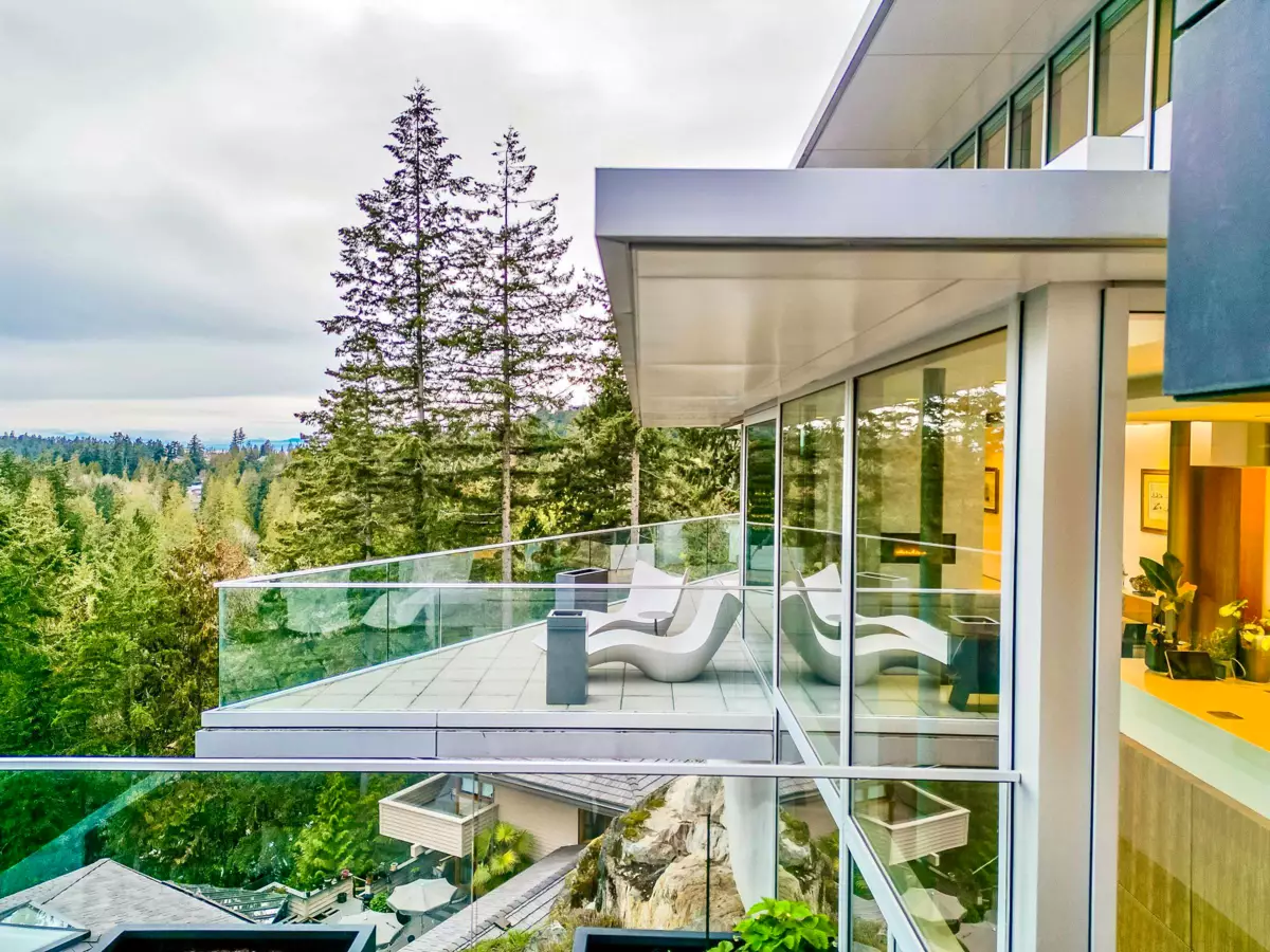 World Class West Coast Contemporary on private cul-de-sac, nestled among rock outcrops and towering Douglas firs overlooking spectacular ocean & city views. Designed by award winning architect & built to exacting standards w/extensive use of concrete, steel & cross laminated timbers, exterior façade of zinc-aluminum panels, commercial grade aluminum windows & doors. A signature 2-storey entry leads to large double height living area w/FP, formal dining, custom island kitchen. Principal rooms open to 3 lg patios & hot tub. African millwork & built-in cabinetry throughout. Up features sensational master w/spa-like ensuite & priv terrace, 2 guest bdrms w/ensuites. Down offers a rec/media rm or optional bdrms. All principal rooms capture stunning views from English Bay to Van Island & beyond.