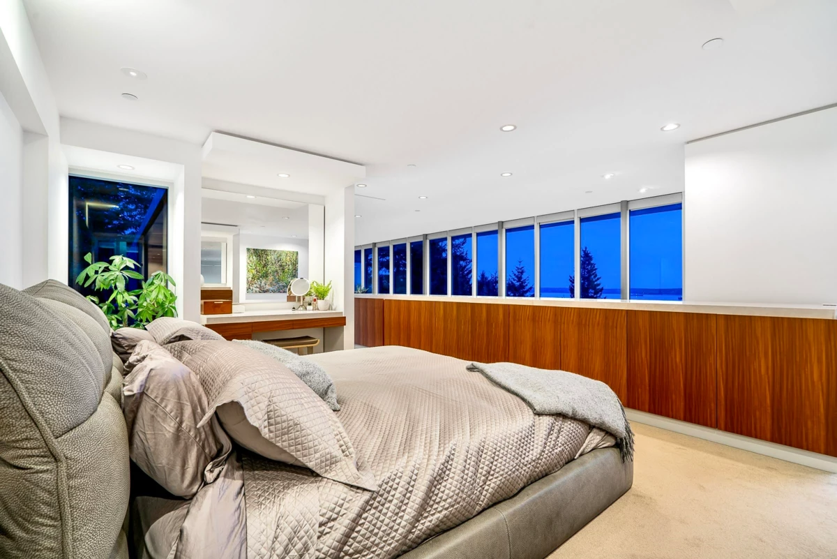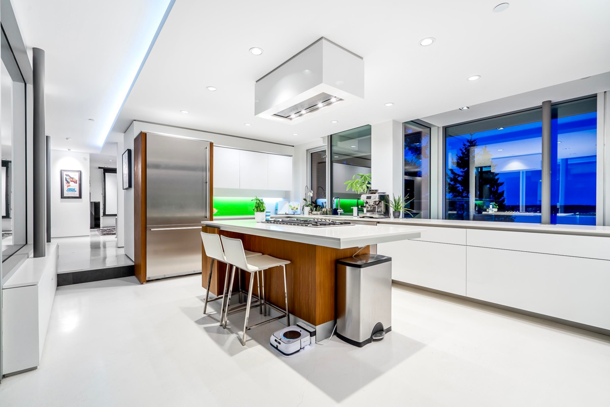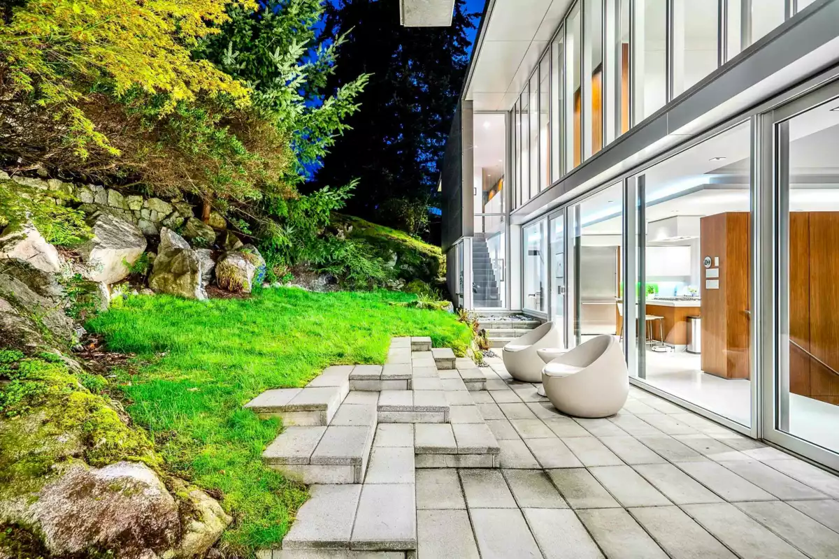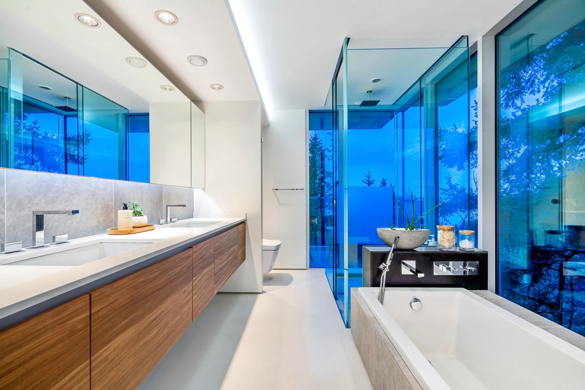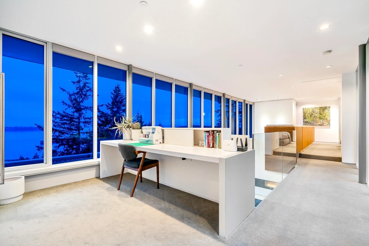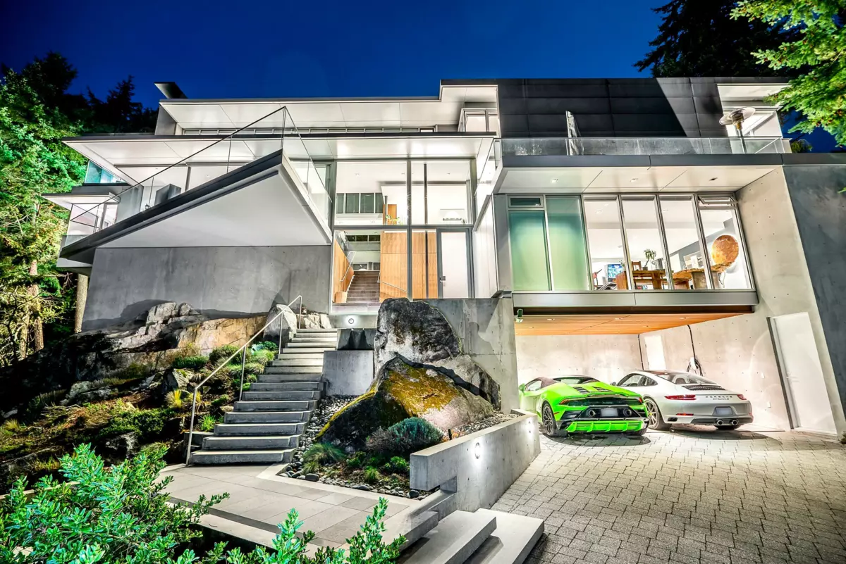 World Class West Coast Contemporary on private cul-de-sac, nestled among rock outcrops and towering Douglas firs overlooking spectacular ocean & city views. Designed by award winning architect & built to exacting standards w/extensive use of concrete, steel & cross laminated timbers, exterior façade of zinc-aluminum panels, commercial grade aluminum windows & doors. A signature 2-storey entry leads to large double height living area w/FP, formal dining, custom island kitchen. Principal rooms open to 3 lg patios & hot tub. African millwork & built-in cabinetry throughout. Up features sensational master w/spa-like ensuite & priv terrace, 2 guest bdrms w/ensuites. Down offers a rec/media rm or optional bdrms. All principal rooms capture stunning views from English Bay to Van Island & beyond.