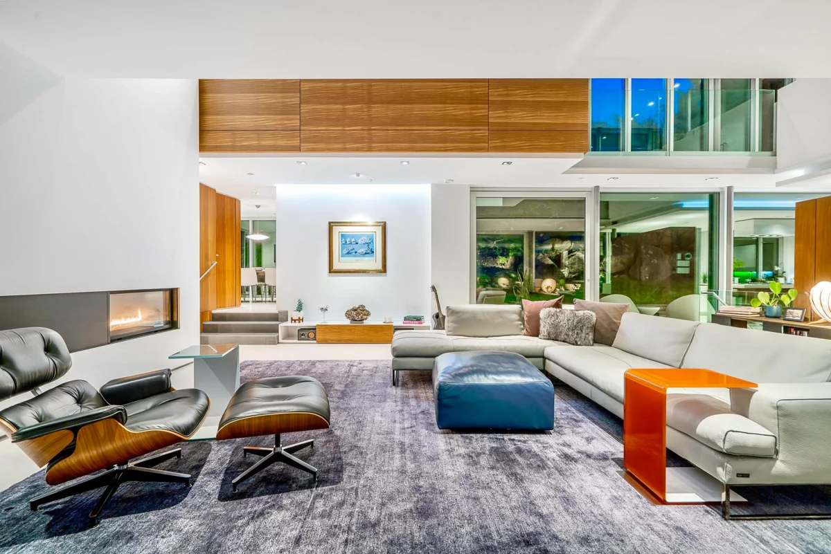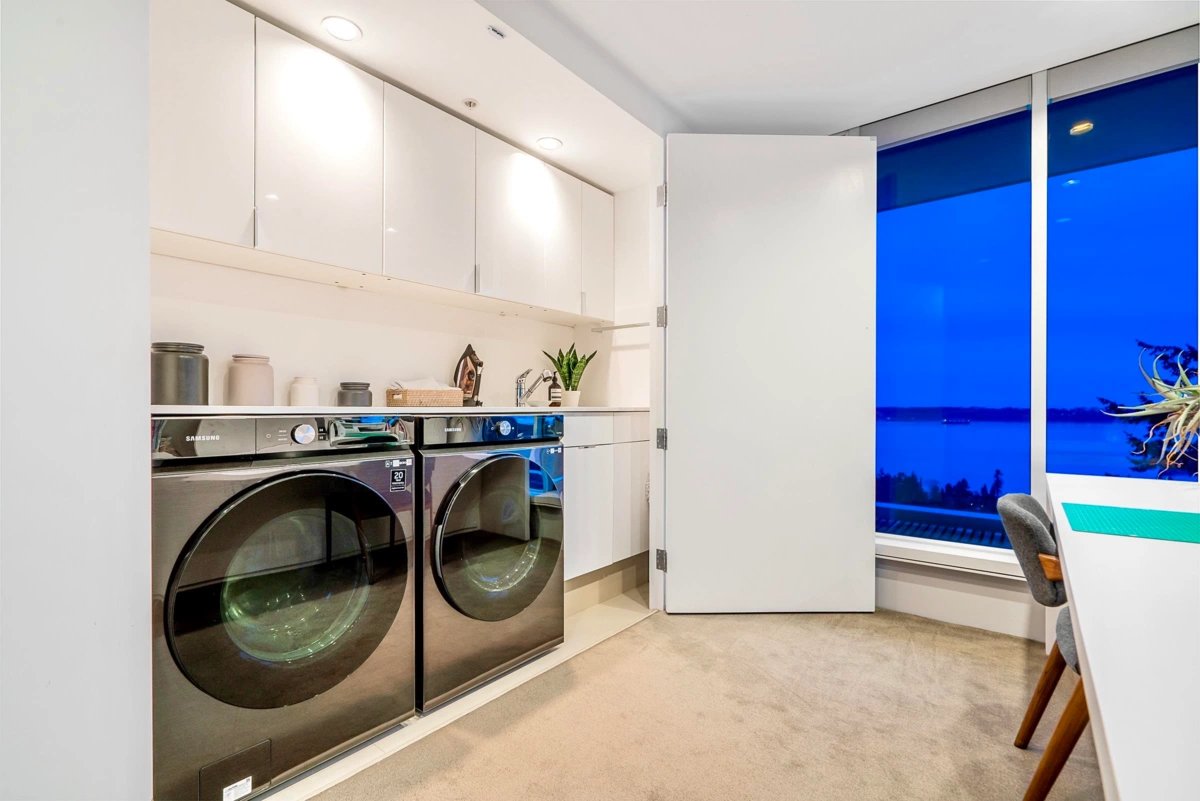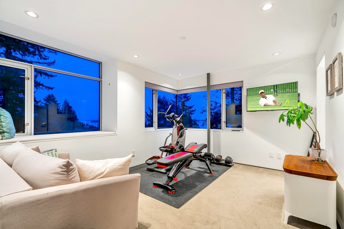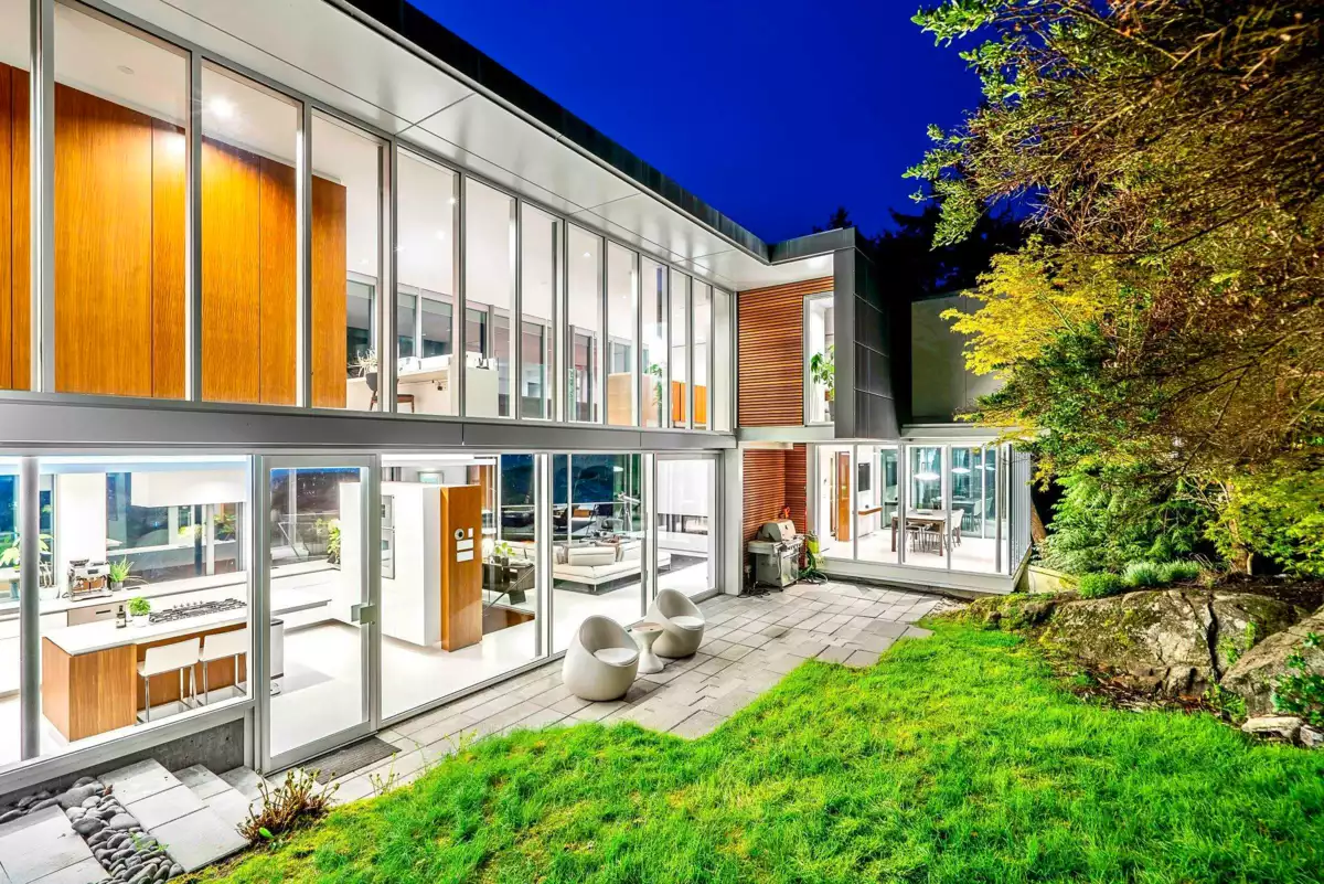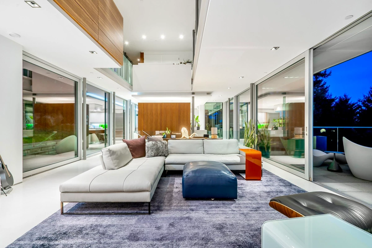 World Class West Coast Contemporary on private cul-de-sac, nestled among rock outcrops and towering Douglas firs overlooking spectacular ocean & city views. Designed by award winning architect & built to exacting standards w/extensive use of concrete, steel & cross laminated timbers, exterior façade of zinc-aluminum panels, commercial grade aluminum windows & doors. A signature 2-storey entry leads to large double height living area w/FP, formal dining, custom island kitchen. Principal rooms open to 3 lg patios & hot tub. African millwork & built-in cabinetry throughout. Up features sensational master w/spa-like ensuite & priv terrace, 2 guest bdrms w/ensuites. Down offers a rec/media rm or optional bdrms. All principal rooms capture stunning views from English Bay to Van Island & beyond.