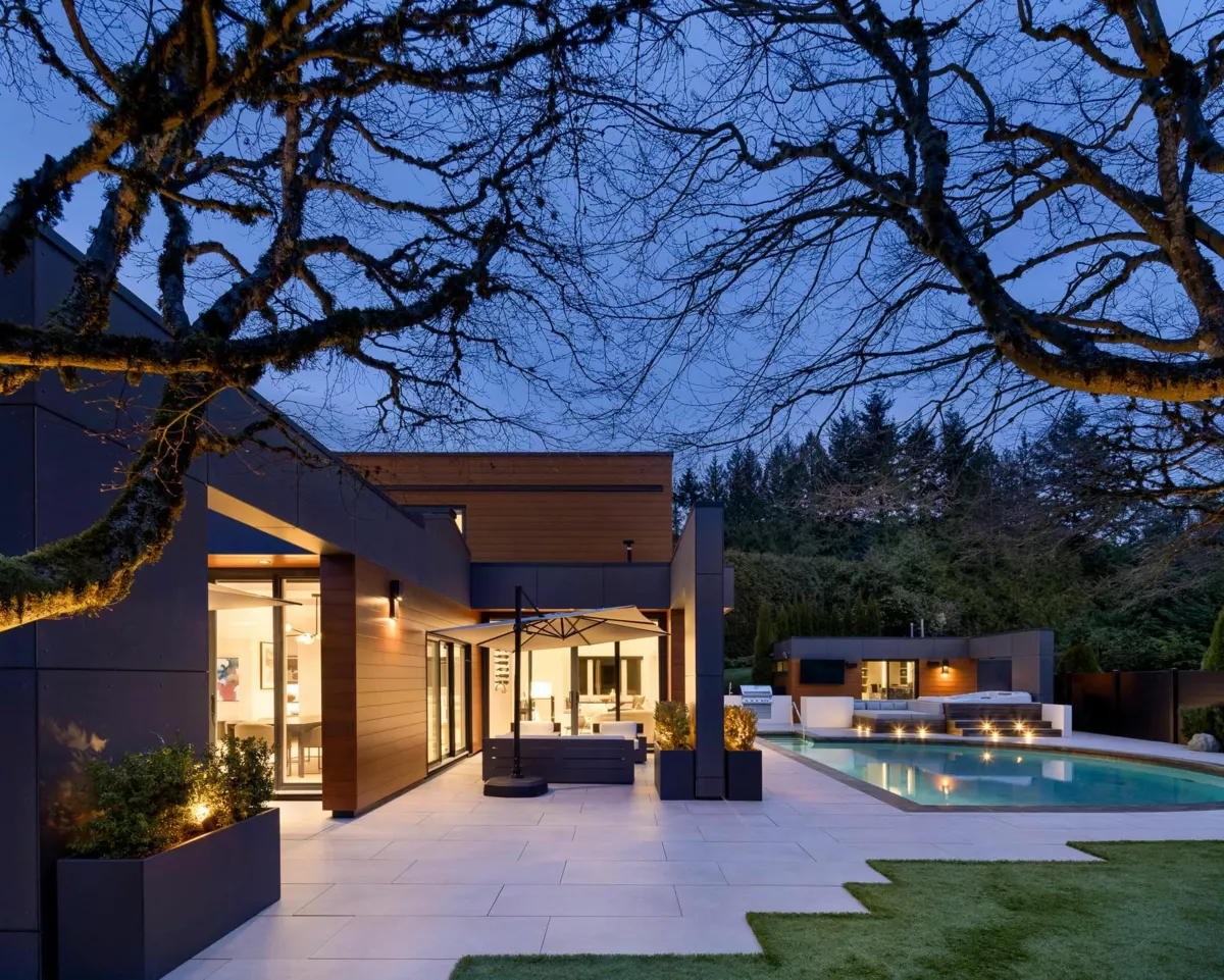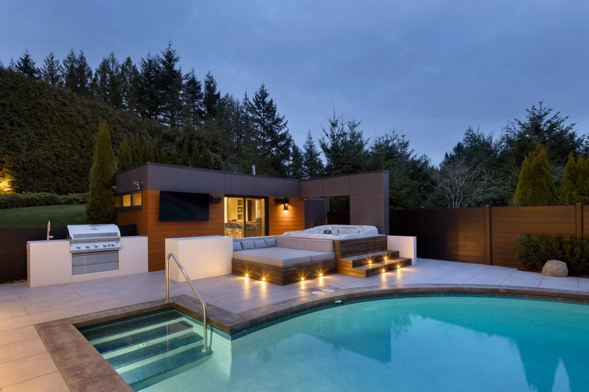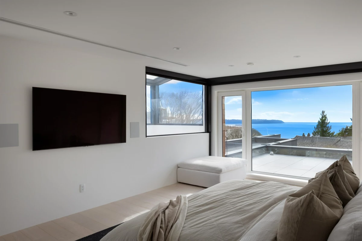 The Arc at Rockridge - A rare modernist residence Arthur Erickson inspired & masterfully reimagined. Privately set behind smooth-formed concrete walls & custom automated gate on a flat corner lot. Refined interiors ft. Venetian plaster walls, skylight corridors & dramatic 20-ft marble fireplace. Reimagined chef’s kitchen w/ Caesarstone counters, integrated appliances & custom millwork opens to sun-soaked terraces; seamless indoor-outdoor living. Up offers 3 ensuited bdrms incl. a private primary w/ ocean views, Poliform cosets & spa-like bath+ flex space w/ potential for a 4th bdrm. Below incl. theatre, bar, gym & guest room. Outdoors the home transforms into a private resort w/ sculptural pool, hot tub, outdoor kitchen, cabana w/ marble interior, steam room & shower.